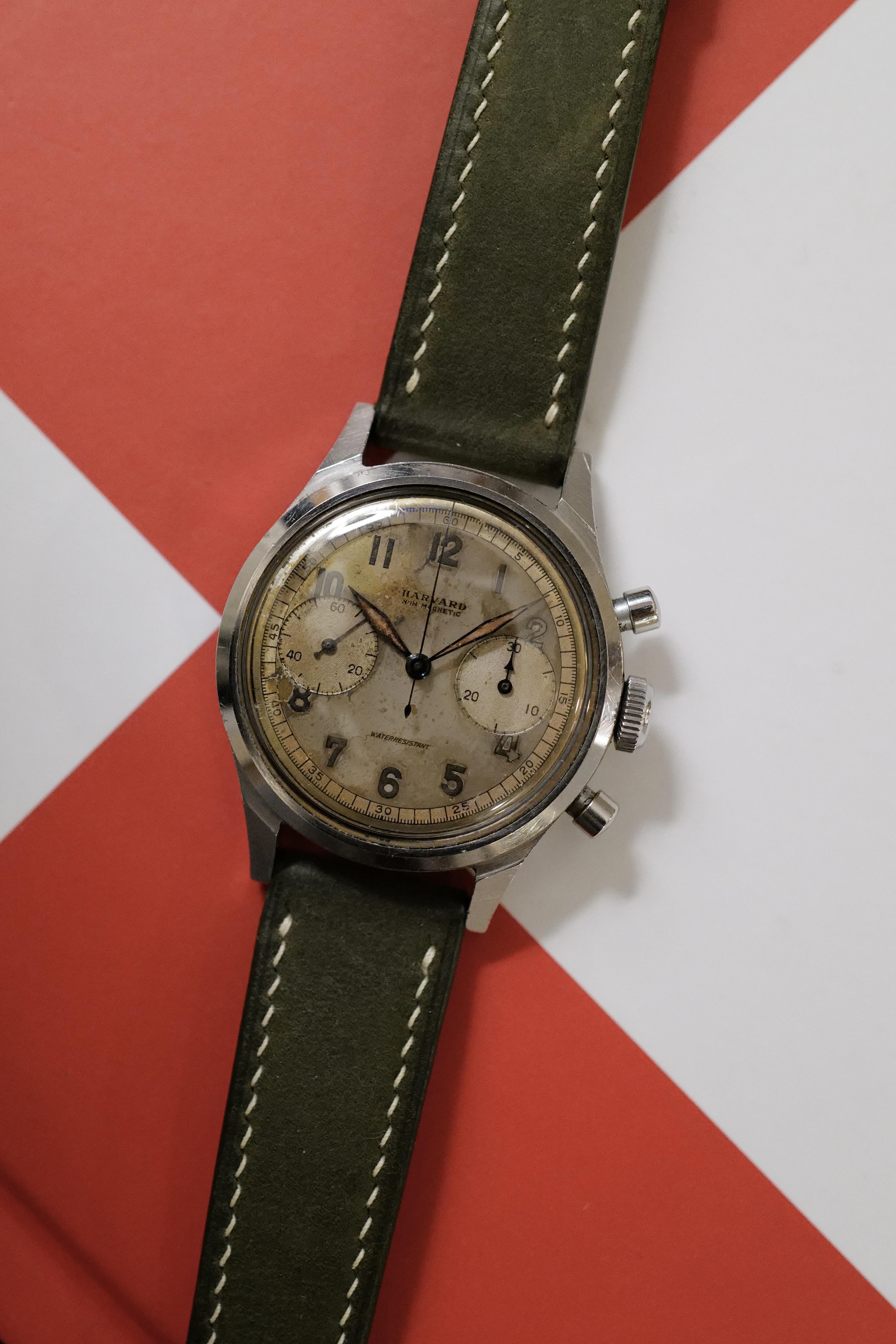 For sale : Vintage Harvard Clamshell Chronograph by Gallet wristwatch [Rich Fordon from Hodinkee wrote the connection between Harvard Watch & Gallet on “Bring A Loupe”](https://www.hodinkee.com/api/v1/articles/14207.html?utm_source=hodinkee&utm_medium=iOS) ⏱️Product Description: * Brand: Harvard * Model: Clamshell Chronograph * Year: 1940s * Movement: Manually wound Cal Venus 175 * Case Material: Stainless Steel * Size: 37mm excluding crown (39mm including crown) * Lug width: 18mm * Straps: Horween nubuck leather in olive color * Box & paper: none * Service history: fully serviced on August 2024 💌Things to love : - Sharp edges unpolished clamshell case ( 3-piece waterproof case, first patented by Gallet) - Original blued steel handset with preserved patina, original pushers & original unsigned big crown - Large size 37 mm (excluding crown) - Movement fully serviced on August 2024 - Keeping excellent time - Chronograph function works as it should (start, stop & reset to zero) - Very collectibles 1940s chronograph for fraction price of Chronograph with Spillman case from this era. ⚠️Things to know: - Patina on original dial - Scratches on case 🏷️Price : $1,750 negotiable, with free conUS shipping. Payment via Zelle, Venmo, Wire, PayPal FF or G&S (+3.5% fee) Let me know if you have any questions, thank you. [Albums](https://imgur.com/a/fZFxR3D) [Timestamp](https://imgur.com/a/VB8UqfK)