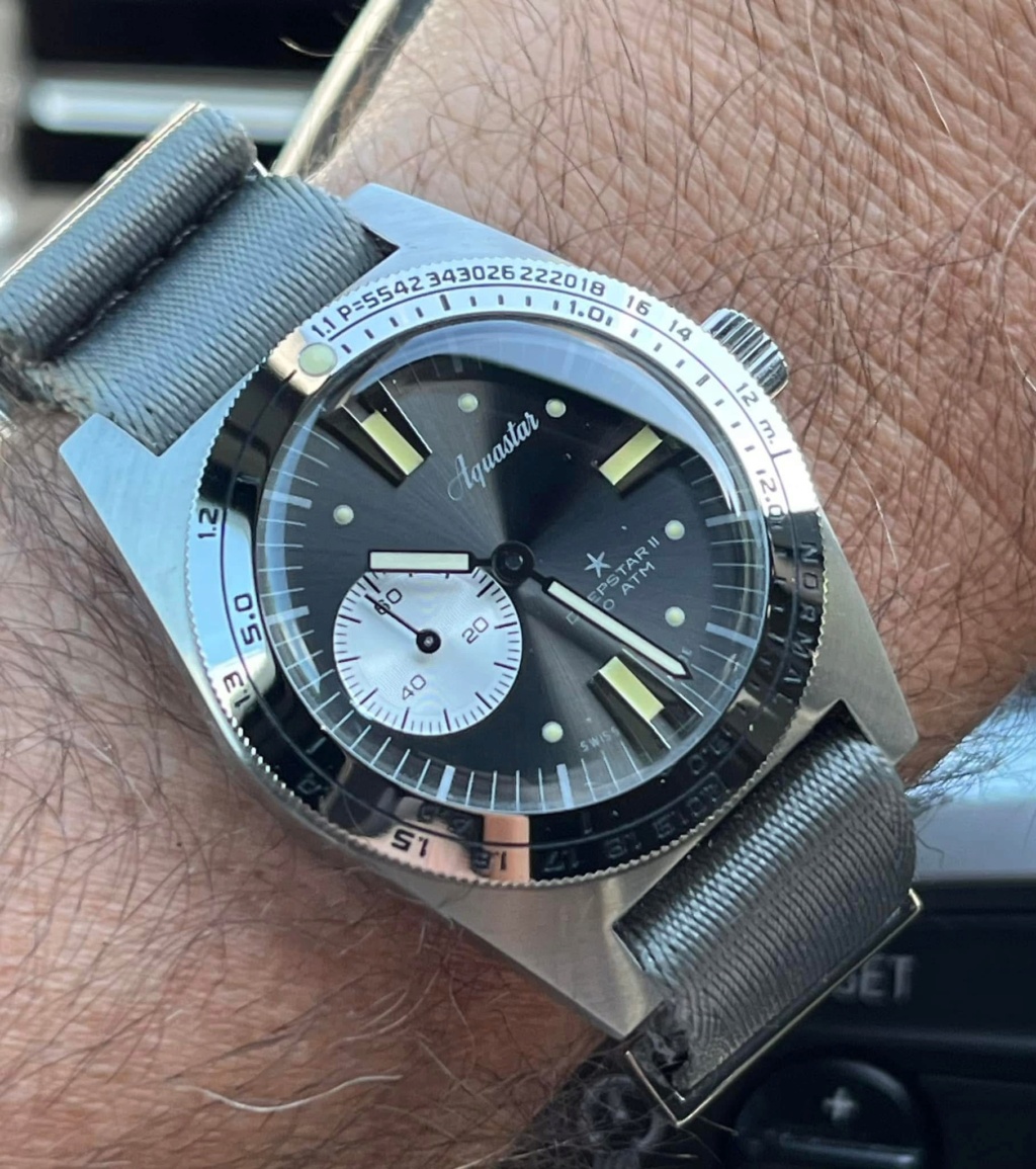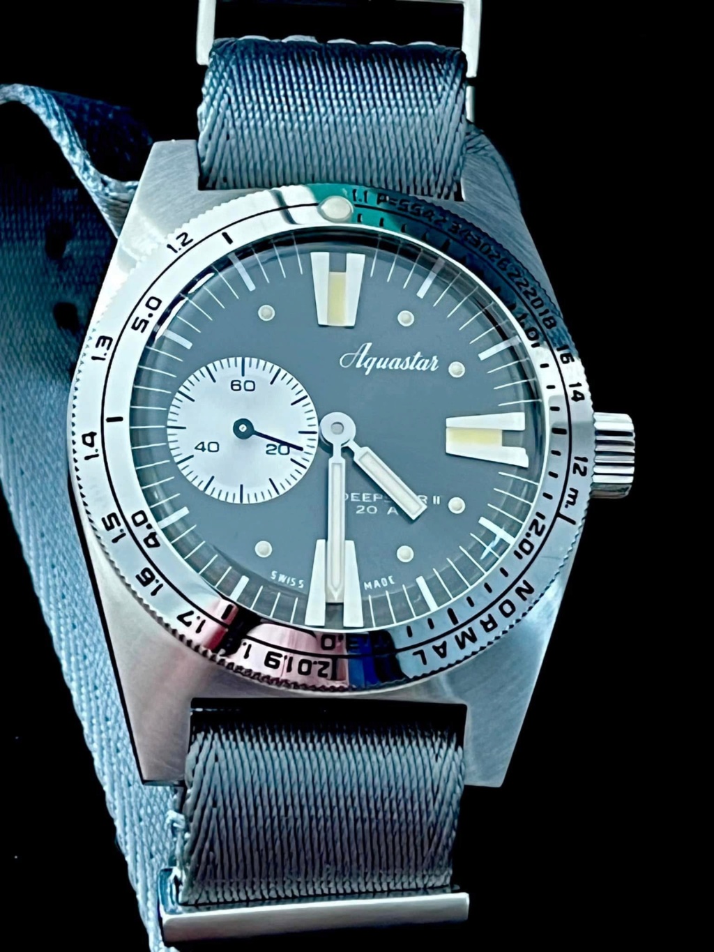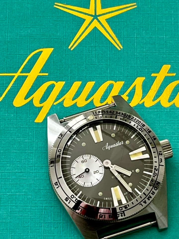 L'Aquastar Deepstar II est l'évolution de la Deepstar originale de 1963, s'appuyant sur le même brevet que la pièce originale qui permet de calculer des temps de plongée et de décompression multiples tout en abritant un mécanisme à 3 aiguilles non chronograph.