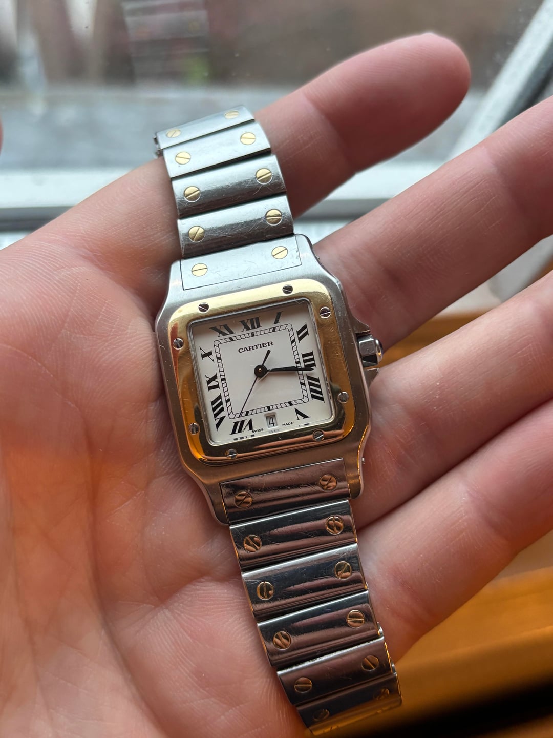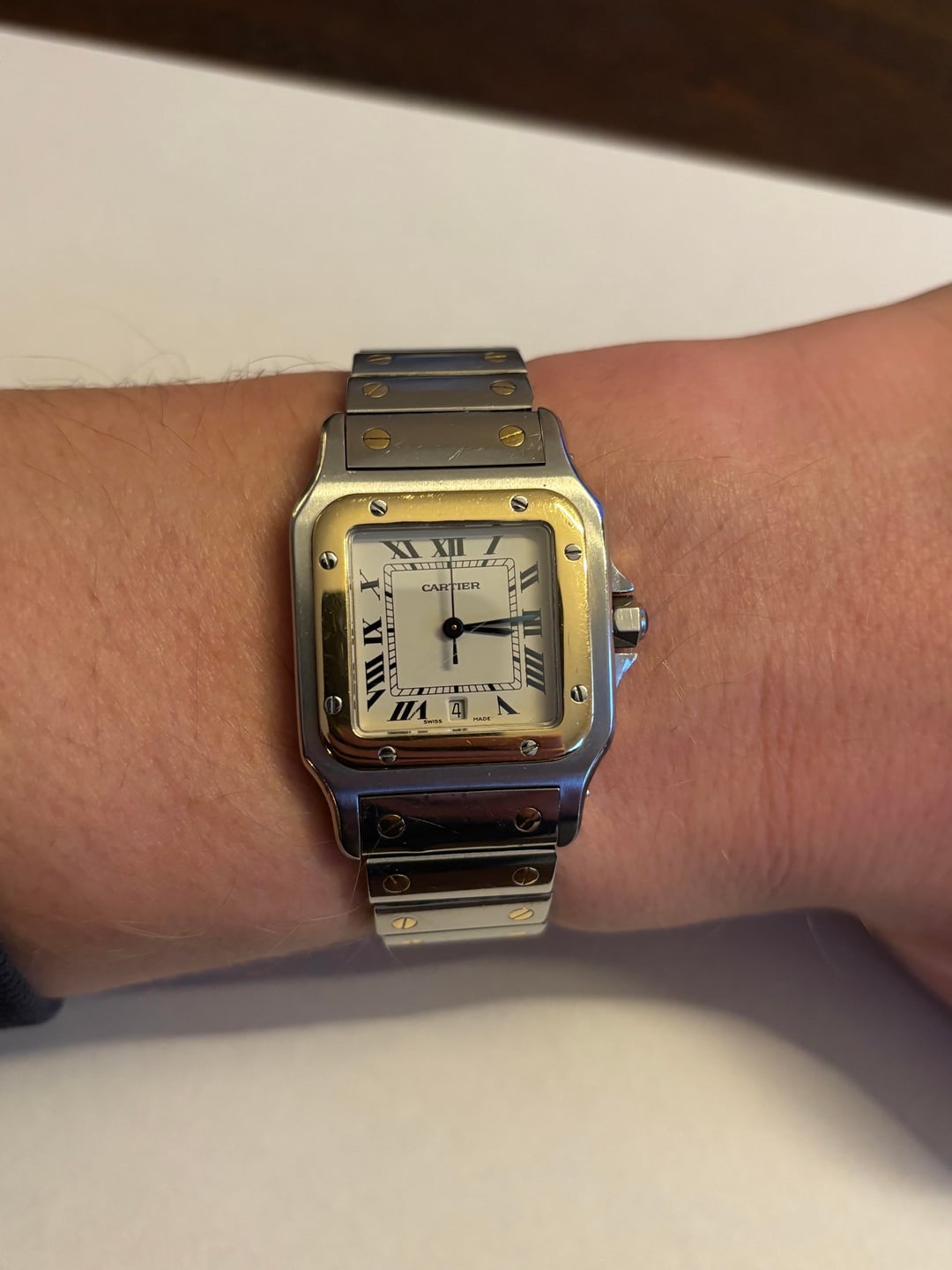Hi All! (Repost -> Lowered price!) For sale my Cartier Santos Galbée, that measures in at 29mm in width and about 40mm lug to lug. For reference my wrist is a little over 7 inches. It has a quartz caliber and it's keeping time perfectly, everything is functioning like it should. The watch comes with 3 spare links, so there is room for a larger wrist. Take a look at the photo's to get a true feel for the watch! The watch is in a great condition, no deep scratches or major dents. There is a small scratch on the crystal (only visible under the exact correct angle and very closeup), but totally invisible whilst wearing. Photos: [https://imgur.com/a/XZ8bfKx](https://imgur.com/a/XZ8bfKx) Timestamp: [https://imgur.com/a/2HHzMvU](https://imgur.com/a/2HHzMvU) If you'd like to see any other angle etc, just shoot me a message and I'll respond ASAP. I'm based in the Netherlands and will ship worldwide with track and trace. Preffered payment method is Paypal. I have sold plenty of watches on WUS and on Reddit, feel free to check my out on both under this username. **Asking: 3350 EUR (Excl. Shipping) / Or make me a reasonable offer!!**