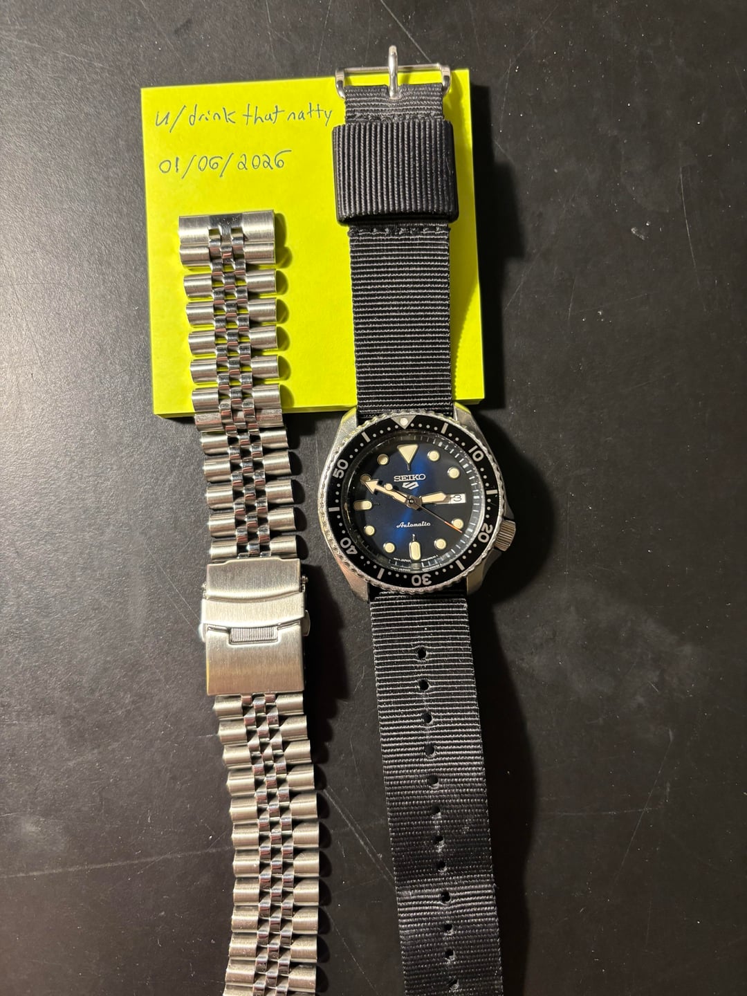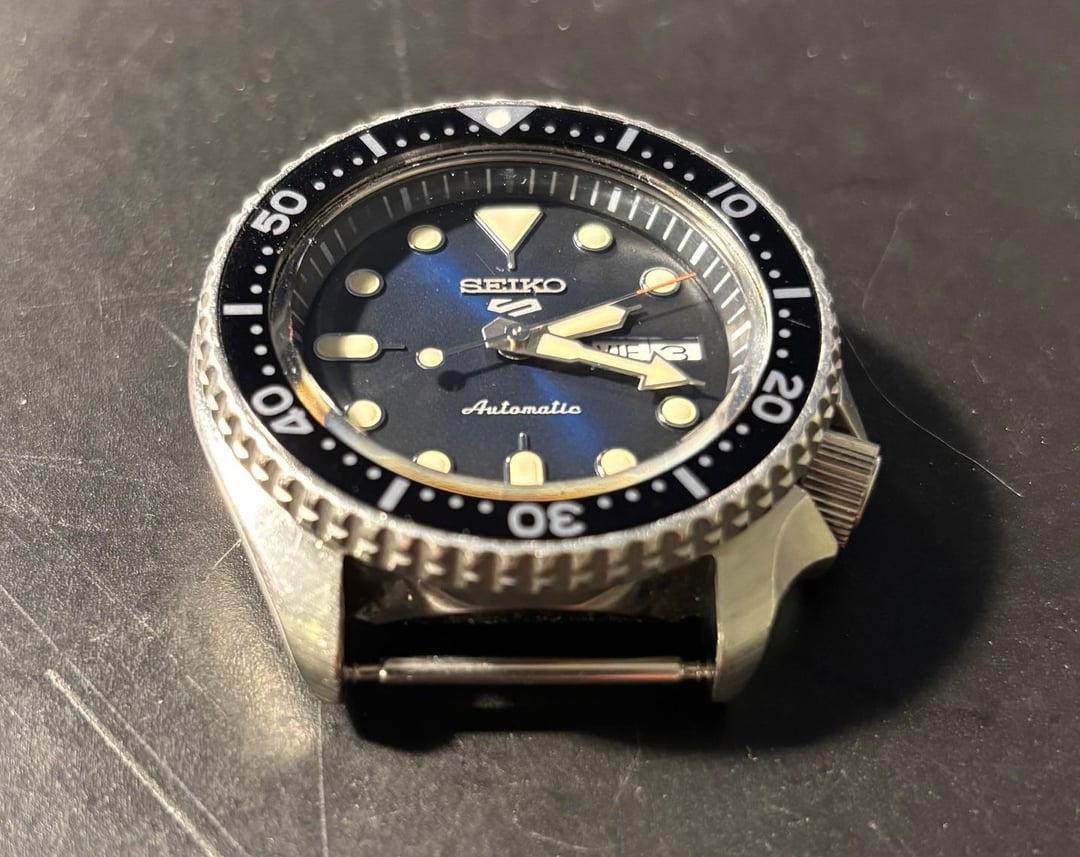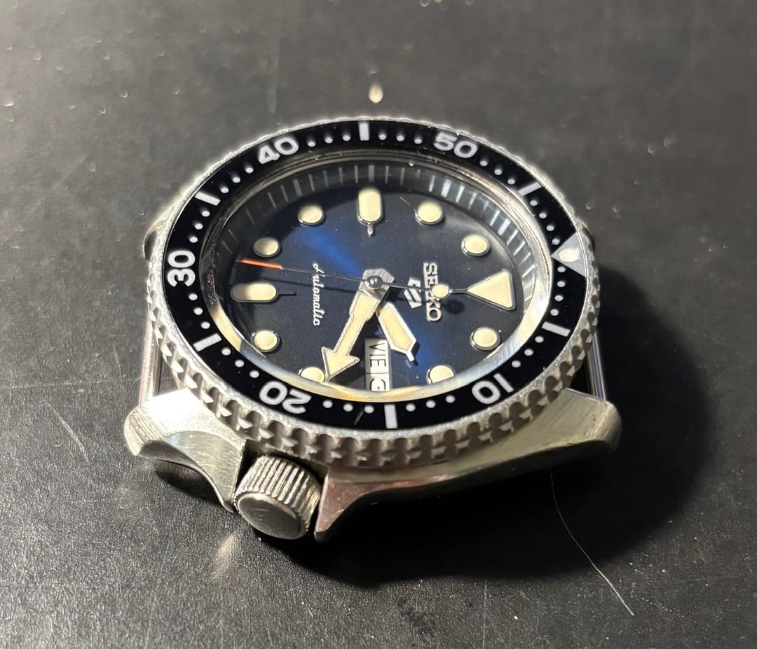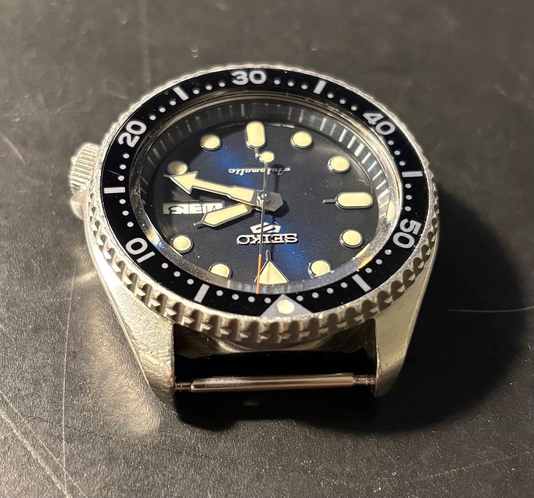 Hello all, looking to sell my modified Seiko SKX 007. Bought this from a guy on marketplace who exaggerated the degree of service it had received which necessitated me having a watchmaker putting a new movement in it. I believe this is one of the movements from the new SKX lookalike watches. It has handwinding and hacking, greatly improving the usability of the watch. I was told by the watchmaker not to expect any sort of water resistance out of it, but the watch should be very serviceable and it has that great neo-vintage SKX vibe to it. The blueish dial of the replacement movement makes it stand out a little bit as well. The watch will come with the black nylon strap and the aftermarket jangly bracelet that I bought with it. Would like to get $275 shipped to the lower 48 for it. Ask me any questions you may have, and thanks for looking!
