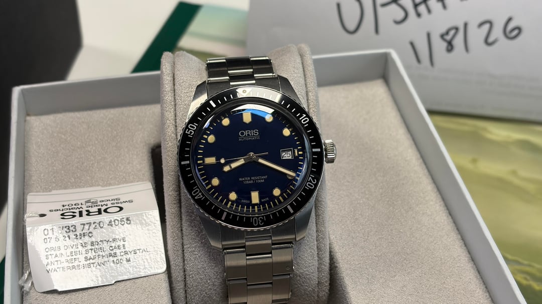 Selling my **Oris Divers Sixty-Five 42mm** with the blue dial. **Ref:** 01 733 7720 4055 **The Watch:** The watch that kicked off the whole vintage diver revival. 42mm case with that signature domed sapphire on both sides—gives it that retro bubble look without sacrificing durability. Blue sunburst dial with "old radium" lume on the hands and indices. Uni-directional dive bezel, 100m water resistance. Powered by the Oris 733 (Sellita SW200-1 base)—reliable workhorse with hacking seconds and 38hr power reserve. **Specs:** * 42mm diameter / 21mm lug width * Stainless steel case * Domed sapphire crystal (both sides, AR inside) * Oris Cal. 733 automatic, 38hr power reserve * 100m water resistance * Blue dial, SuperLuminova "old radium" **Condition:** 8/10. Hairline marks on the case sides from normal wear. Bracelet clasp has typical desk diving marks. Crystal and bezel are clean. Runs great. **Includes:** * Watch on OEM stainless steel bracelet * Black perforated tropic rubber strap * Original box * Hang tag * Warranty card (expired, no remaining warranty) **Price:** **$775 shipped obo** CONUS. PayPal F&F, Venmo or Zelle if you have transaction history/references. G&S +3% with no history/references. Happy to answer questions or send more pics. Thanks for looking!