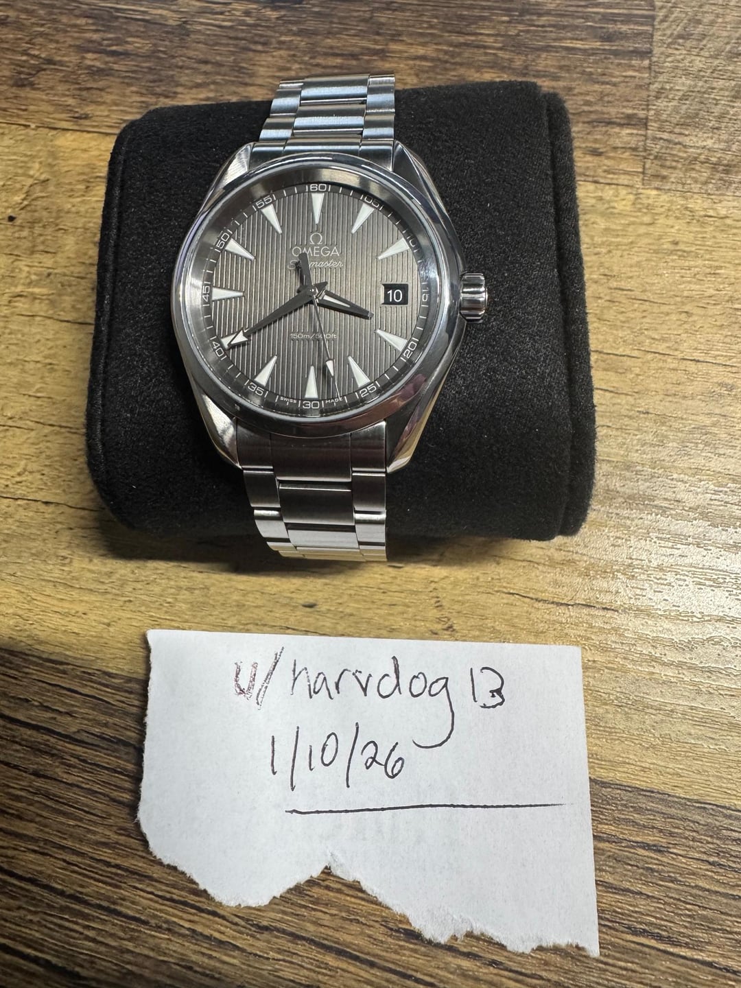 For Sale - Omega Seamaster Aqua Terra 150m. I purchased this a few weeks ago from this sub for my wife, but she went another route so putting it back out there. Full model reference is 231.10.39.60.06.001. Has a Calibre OMEGA 4564 quartz movement. Condition – I would rate this about 8.9/10 and in great condition. Minimal marks/hairlines on the case particularly on the case back, high polished bezel, bracelet sides, and bracelet clasp. Watch has a steel case on original steel Omega steel bracelet. Sapphire crystal and all other parts are clean. Dial and Hands clean. All functions working well. Seconds hands perfectly hit the dial indices. Lume is great, picture included. It should fit about a 7" wrist and smaller, I unfortunately do not have any extra links to include. Watch only, no box or cards. Price – Asking $1800 shipped and insured in the US. Ships from Cincinnati. Facetime/in-person available. Will accept Zelle (preferred), Bank Wire or PayPal F&F/Venmo). Timestamp – Included in photos. Omega link: [https://www.omegawatches.com/en-us/watch-omega-seamaster-aqua-terra-150m-quartz-38-5-mm-23110396006001](https://www.omegawatches.com/en-us/watch-omega-seamaster-aqua-terra-150m-quartz-38-5-mm-23110396006001)