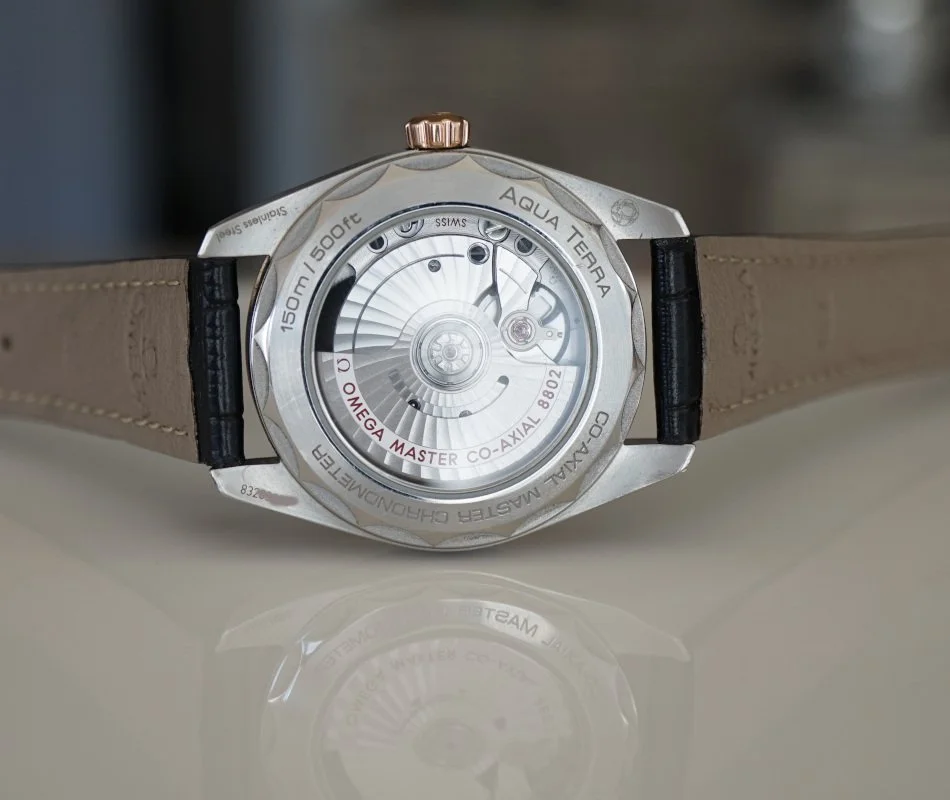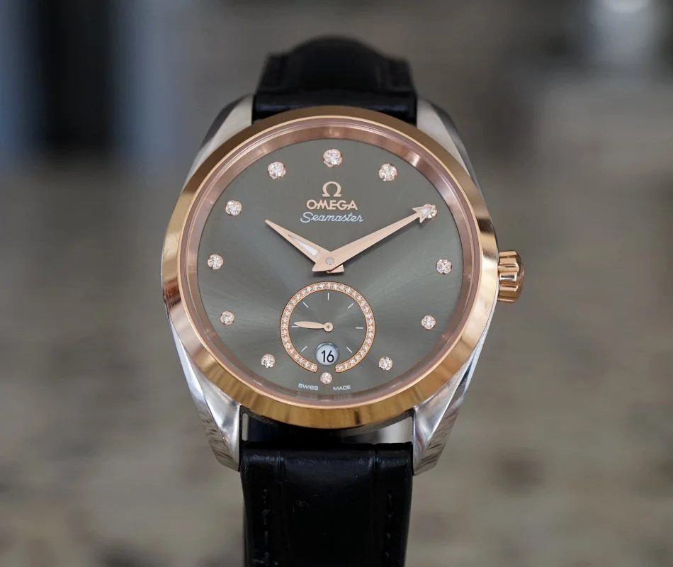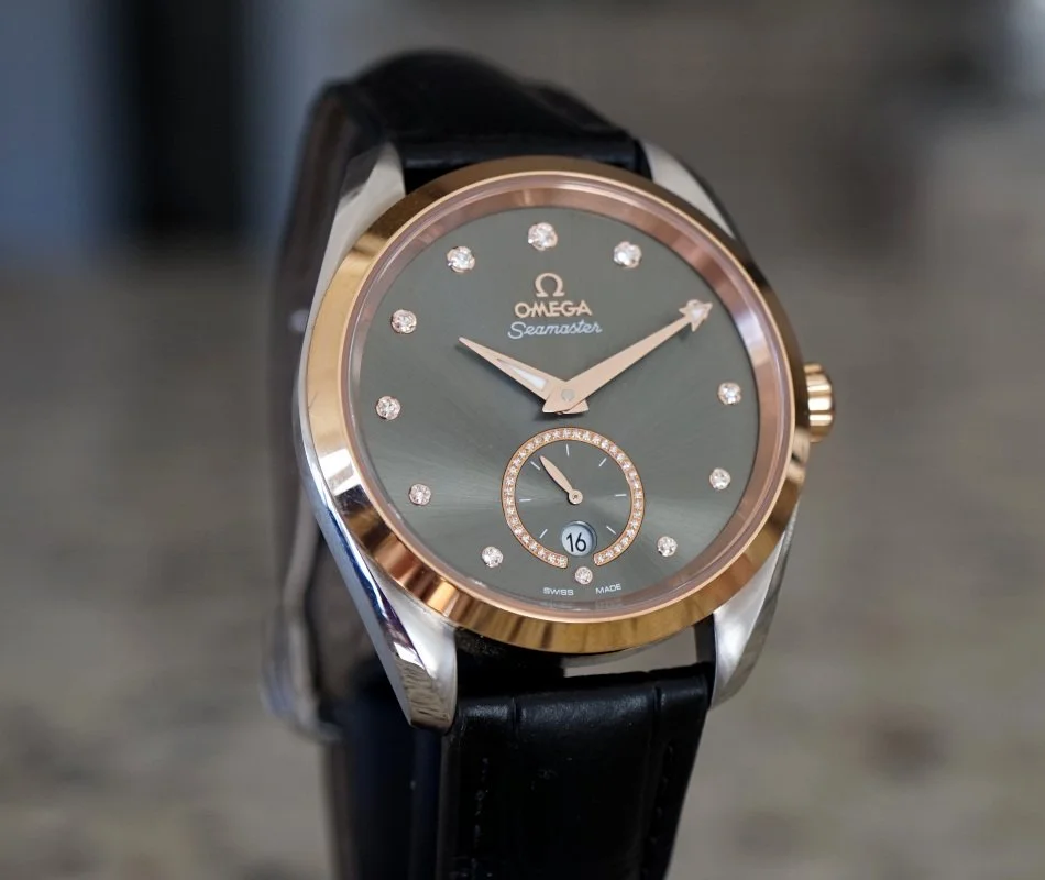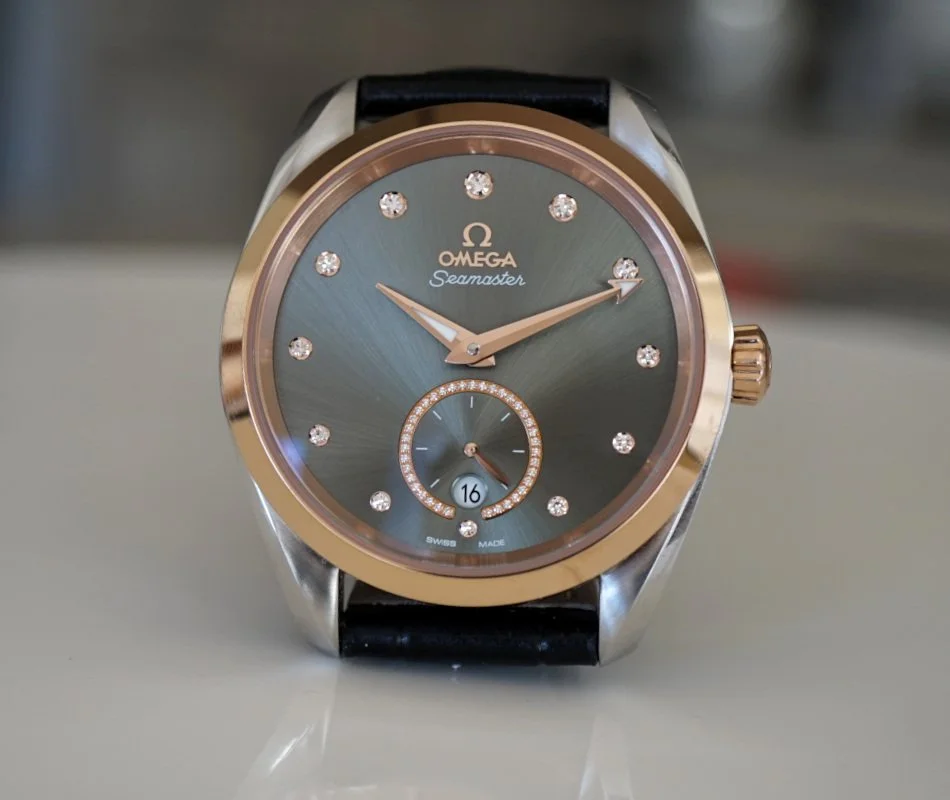 Omega Seamaster Aqua Terra 150m Master Co-Axial Ref:220.23.38.20.60.001, 38mm stainless steel case with a rose gold 18K Rose Gold bezel, Green Dial, Rose Gold Luminous filled hands and Index hour markers on a Green Dial, sapphire crystal front and back, Date, Power Reserve and Hour, Minute, Second, Omega Caliber 8802, Watch Only