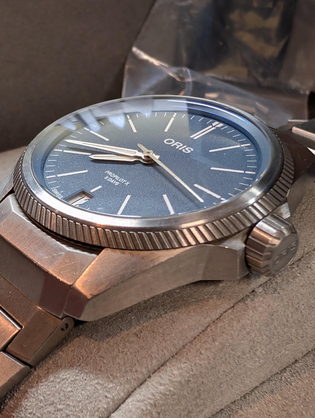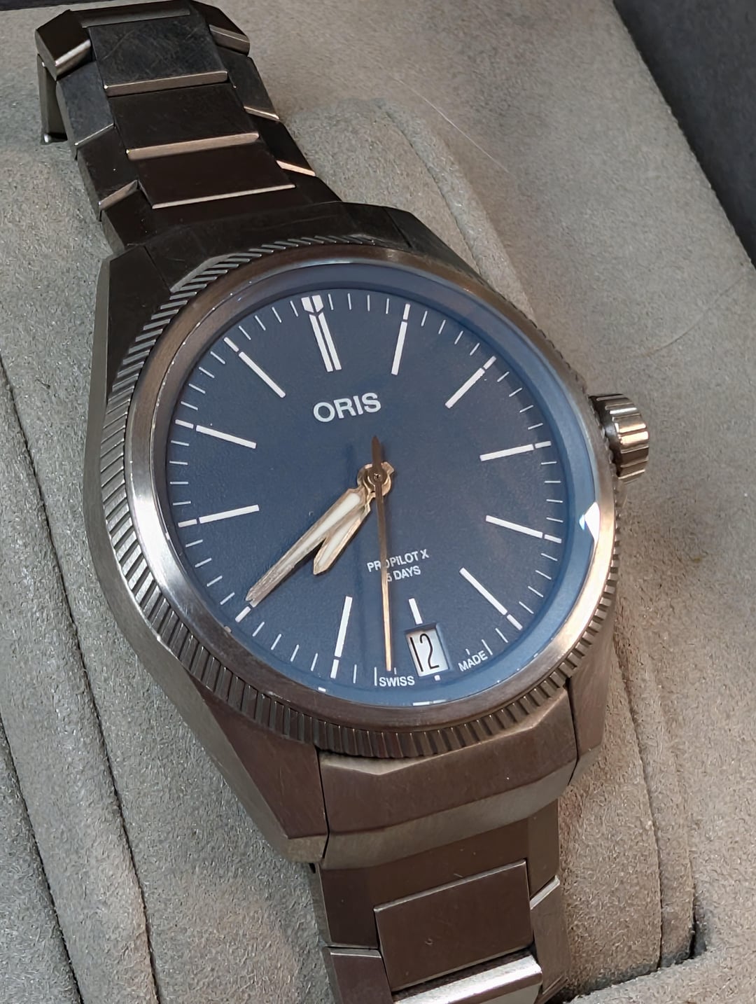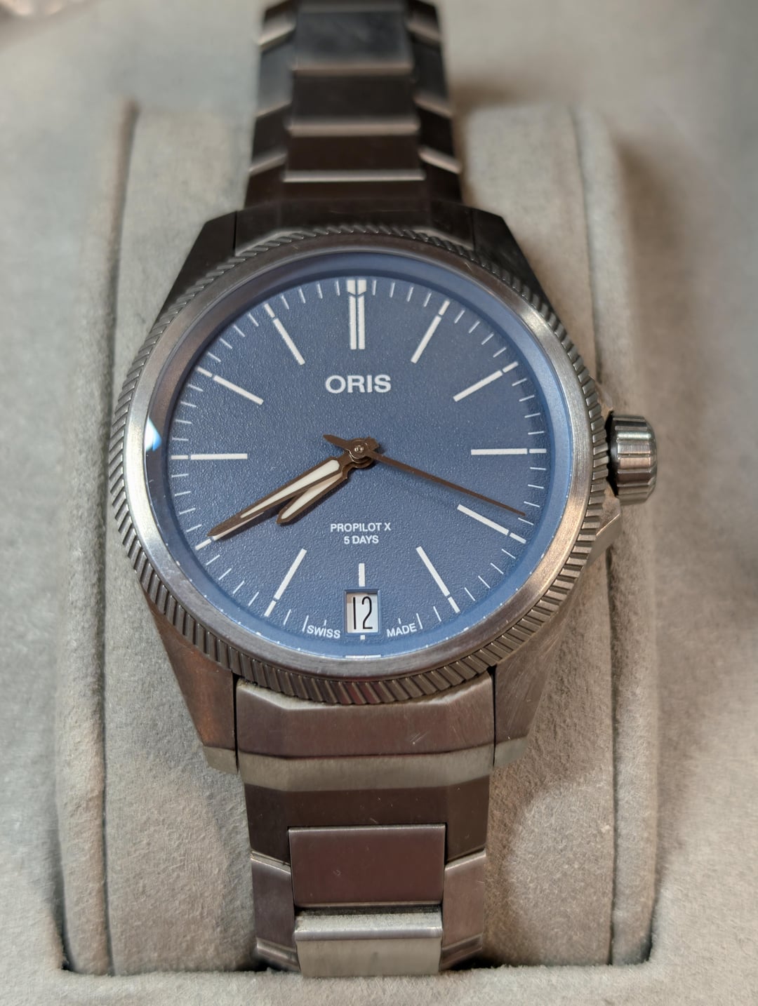 Selling Oris ProPilot X Innovative 5-day Oris in-house movement in a 39mm titanium case. Wonderful under-the-radar blue dial. This was originally purchased grey market but this is the Cal 400-2 movement and was serviced in 2025 due to an issue with the date wheel, so should be good to go for a long time to come. Comes on the original titanium bracelet sized for a 7” wrist, with additional links. Being type-2 titanium this does show some scratches that are unavoidable, but it is straightforward to polish them out if you choose to. Comes with inner/outer boxes and manual. Asking $1800 shipped CONUS. Timestamp: [https://i.imgur.com/Oex5KYk.jpeg](https://i.imgur.com/Oex5KYk.jpeg)