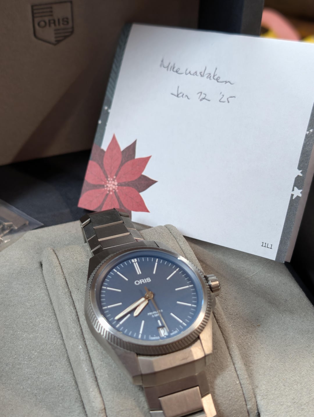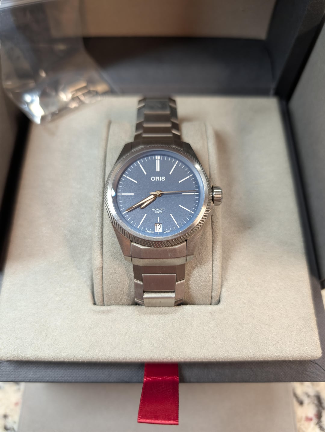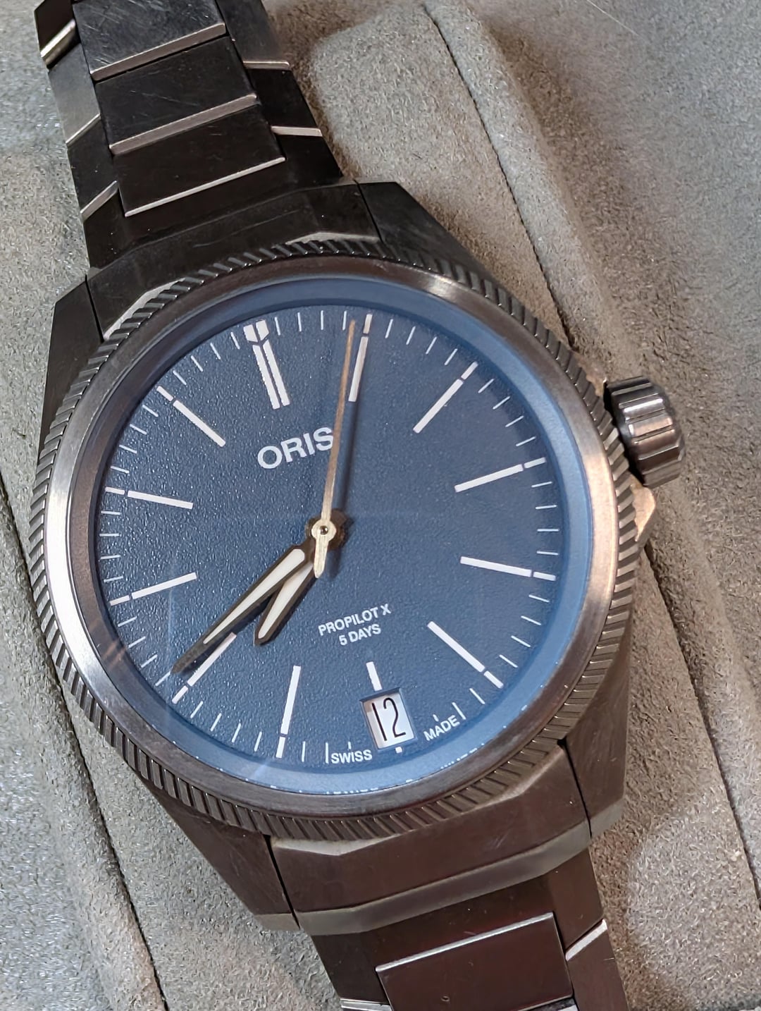 Selling Oris ProPilot X Innovative 5-day Oris in-house movement in a 39mm titanium case. Wonderful under-the-radar blue dial. This was originally purchased grey market but this is the Cal 400-2 movement and was serviced in 2025 due to an issue with the date wheel, so should be good to go for a long time to come. Comes on the original titanium bracelet sized for a 7” wrist, with additional links. Being type-2 titanium this does show some scratches that are unavoidable, but it is straightforward to polish them out if you choose to. Comes with inner/outer boxes and manual. Asking $1800 shipped CONUS. Timestamp: [https://i.imgur.com/Oex5KYk.jpeg](https://i.imgur.com/Oex5KYk.jpeg)