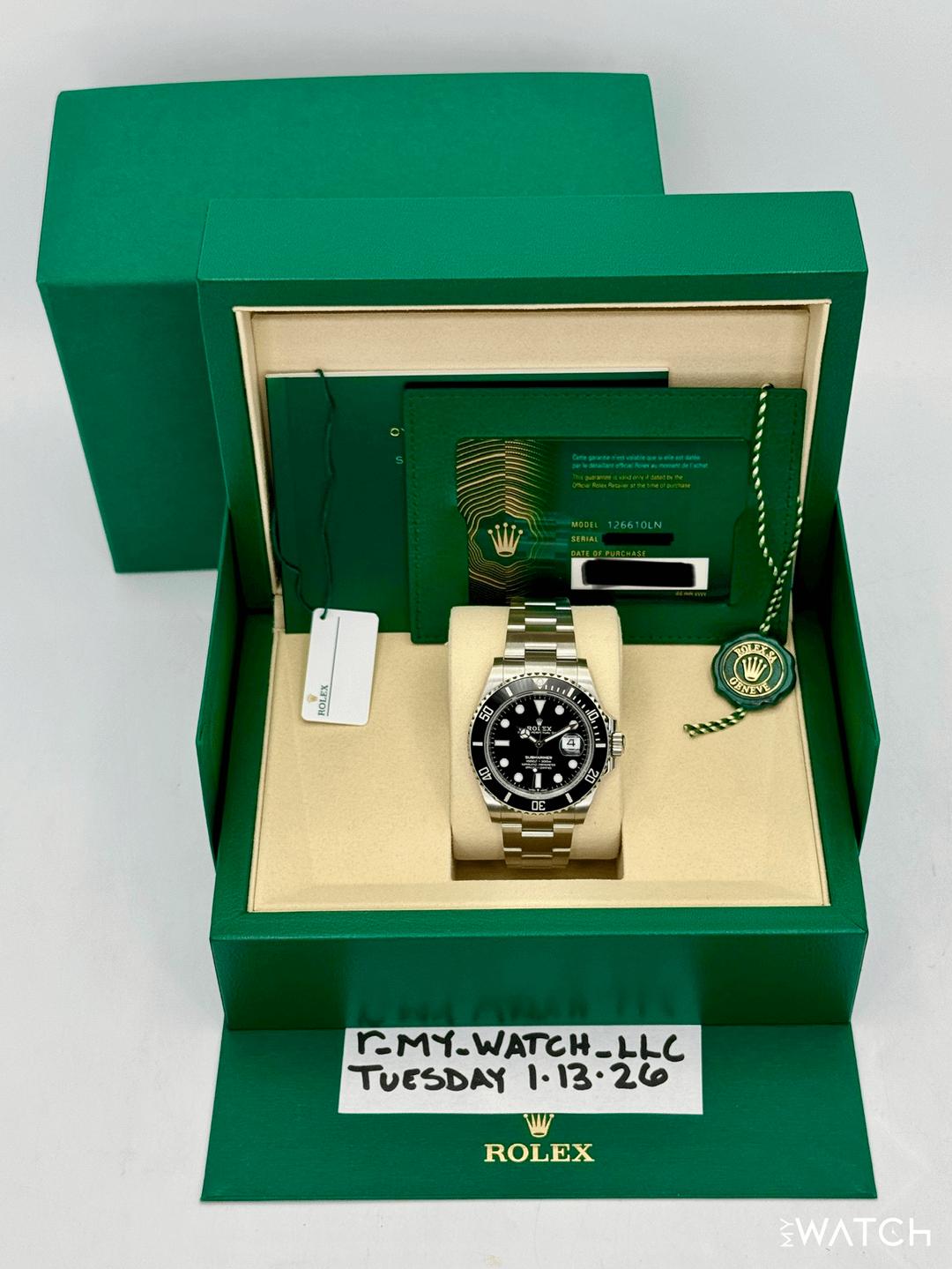🔵**NEW 2026 Rolex Submariner Date 41mm 126610LN Stainless Steel Black Dial Oyster Bracelet with Glidelock and Black Ceramic Bezel** 🔵**TRADE or SELL us your luxury watch, all brands considered. Message me details.** **Includes the following:** **✔️BRAND NEW UPDATED ROLEX BOX (Double Boxed)** **✔️Box and Papers - Yes** **✔️Warranty card dated 2026** **✔️5 year manufacturer warranty** **✔️Manual and Warranty booklets** **✔️Green and White Hang Tags included** **✔️Material: Oystersteel** **✔️Size: 8.25inch wrist (Full Links)** **✔️Watch is BRAND NEW/UNWORN** **✔️**[**Trades**](https://mywatchllc.com/pages/sell-rolex-watch) **welcome** Business Name: **My Watch LLC** LOCATION: Oak Park, Michigan ✔️[MyWatchLLC.com](http://mywatchllc.com/) for current inventory ✔️Google Business Listing [https://g.co/kgs/Cmd6FPW](https://g.co/kgs/Cmd6FPW) ✔️Business Hours M-F 9-6 ✔️Facetime/Video chat/calls welcome to view the watch interested. ✔️Contact: 248-422-0909 via text or call for quickest response. 🟢TERMS: Visit [MyWatchLLC.Com](http://mywatchllc.com/) for payments accepted 🟢REFERENCES/REVIEWS: We are well reviewed on all platforms from google, trust pilot, rolexforums, additionally we have 300+ reference in multiple FaceBook watch groups, reference checks welcome. 🟢SHIPPING: If you are not local, we offer Fully Insured FedEx overnight shipping in the USA for a fee. International shipping available. [https://mywatchllc.com/products/new-2026-rolex-submariner-41mm-126610ln-stainless-steel-black-dial-1](https://mywatchllc.com/products/new-2026-rolex-submariner-41mm-126610ln-stainless-steel-black-dial-1)