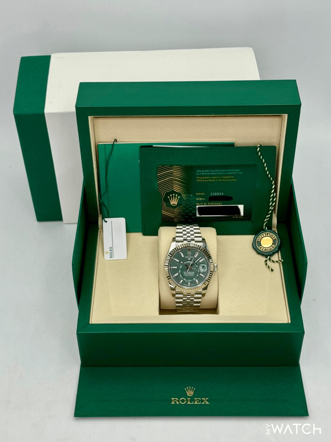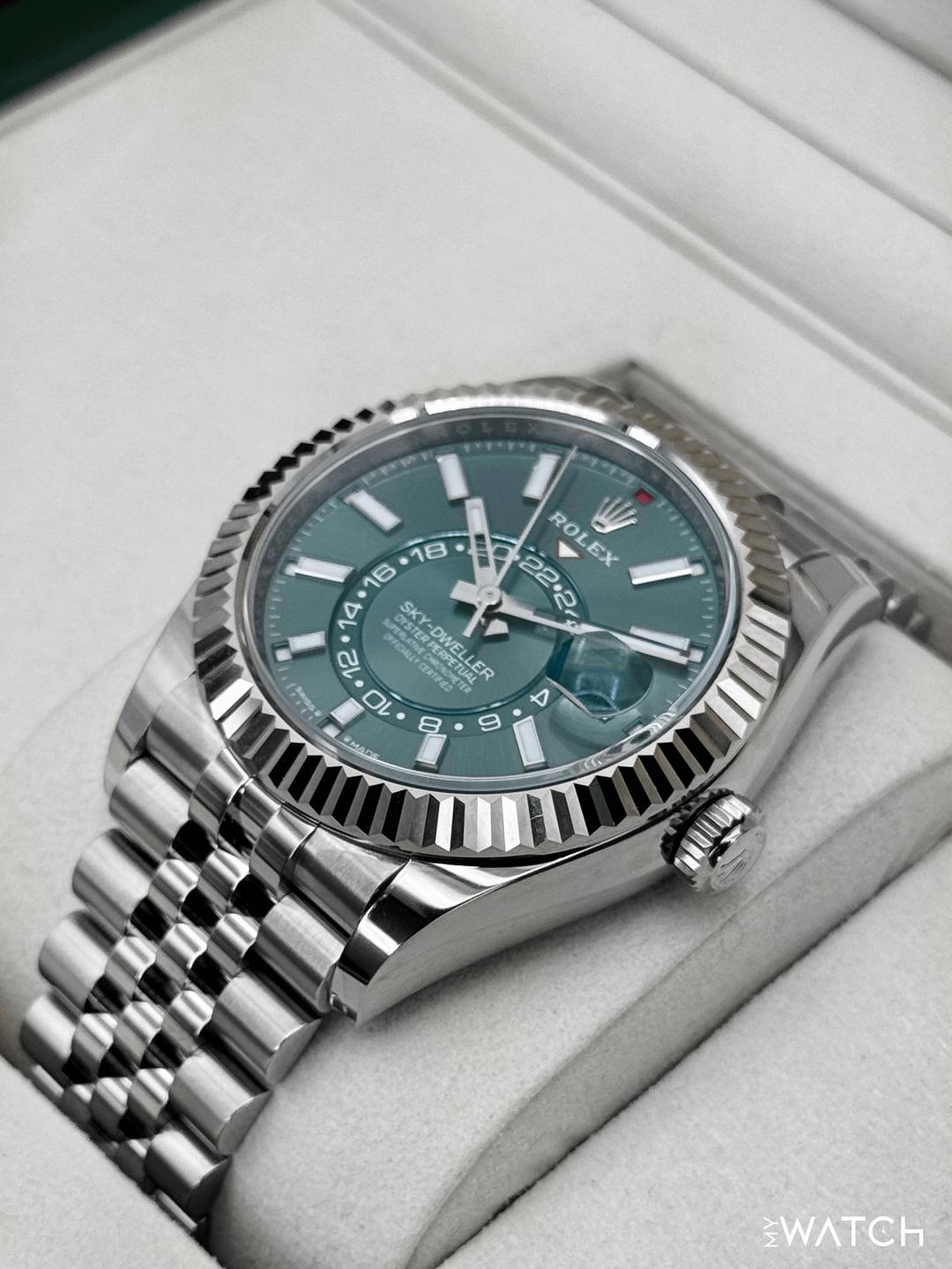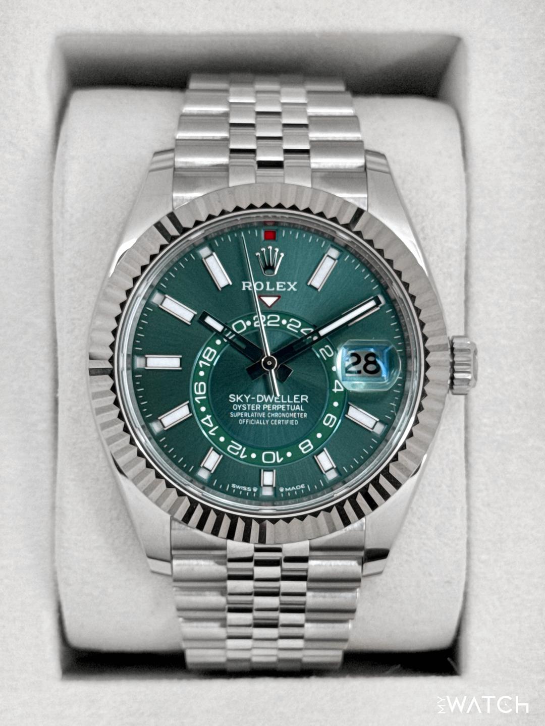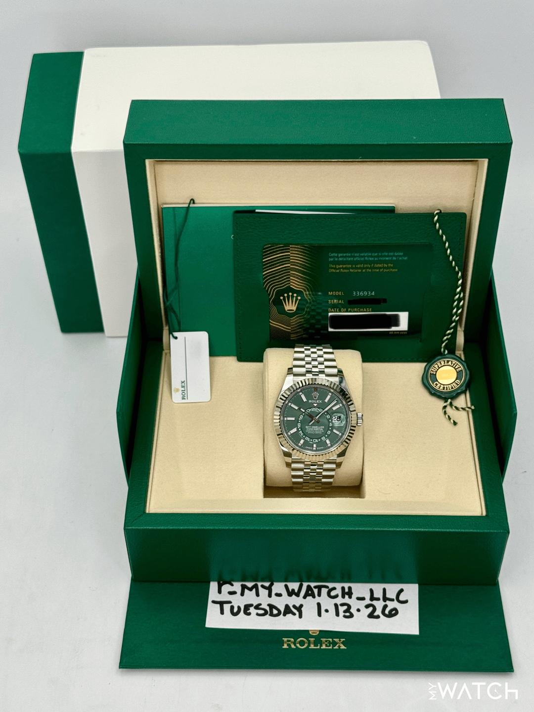 🔵**NEW 2026 Rolex Sky-Dweller 42mm 336934 Oystersteel and 18kt White Gold Fluted Bezel with Jubilee Bracelet and Mint Green Dial** 🔵**Note: Watch still has factory stickers on the clasp** 🔵**TRADE or SELL us your luxury watch, all brands considered. Message me details.** **Includes the following:** **✔️BRAND NEW UPDATED ROLEX BOX (Double Boxed)** **✔️Box and Papers - Yes** **✔️Warranty card dated 2026** **✔️5 year manufacturer warranty** **✔️Manual and Warranty booklets** **✔️Green and White Hang Tags included** **✔️Material: Stainless Steel** **✔️Size: 7.75inch wrist (Full Links)** **✔️Watch is BRAND NEW/UNWORN.** **✔️**[**Trades**](https://mywatchllc.com/pages/sell-rolex-watch) **welcome** Business Name: **My Watch LLC** LOCATION: Oak Park, Michigan ✔️[MyWatchLLC.com](http://mywatchllc.com/) for current inventory ✔️Google Business Listing [https://g.co/kgs/Cmd6FPW](https://g.co/kgs/Cmd6FPW) ✔️Business Hours M-F 9-6 ✔️Facetime/Video chat/calls welcome to view the watch interested. ✔️Contact: 248-422-0909 via text or call for quickest response. 🟢TERMS: Visit [MyWatchLLC.Com](http://mywatchllc.com/) for payments accepted 🟢REFERENCES/REVIEWS: We are well reviewed on all platforms from google, trust pilot, rolexforums, additionally we have 300+ reference in multiple FaceBook watch groups, reference checks welcome. 🟢SHIPPING: If you are not local, we offer Fully Insured FedEx overnight shipping in the USA for a fee. International shipping available. [https://mywatchllc.com/products/new-2026-rolex-sky-dweller-42mm-336934-jubilee-green-dial](https://mywatchllc.com/products/new-2026-rolex-sky-dweller-42mm-336934-jubilee-green-dial)
