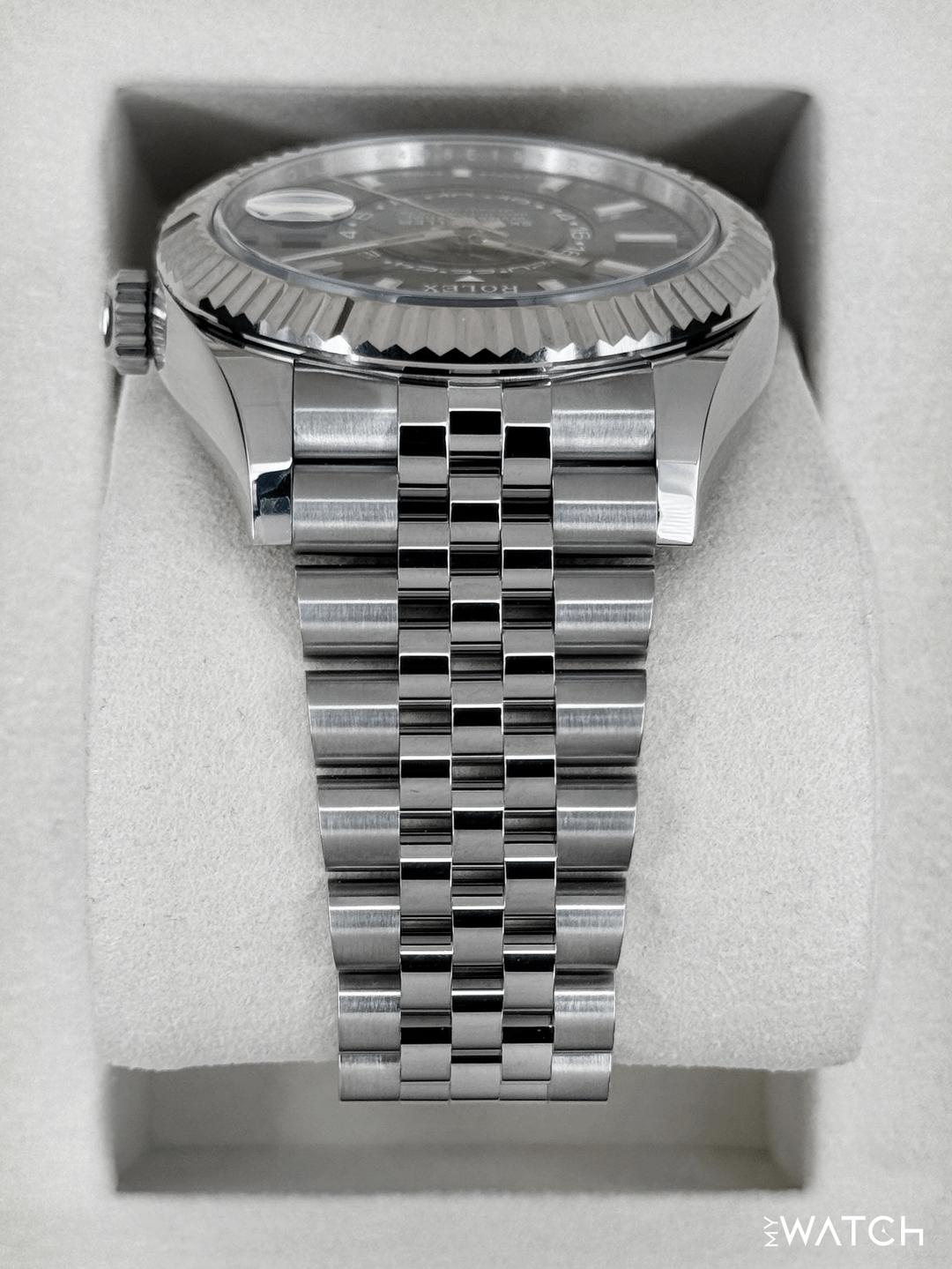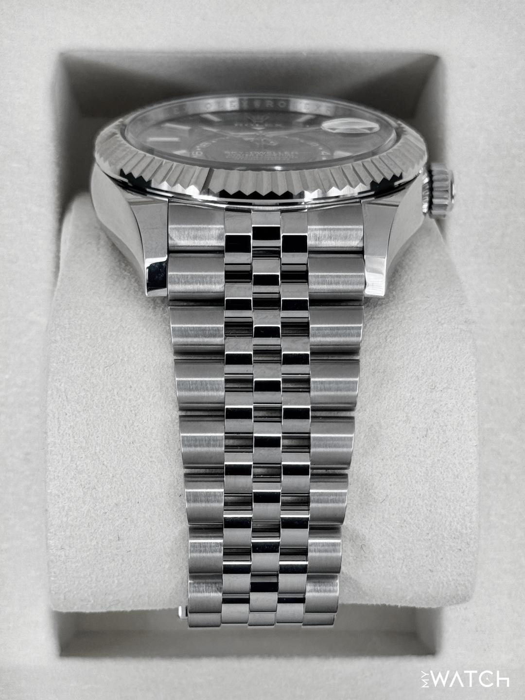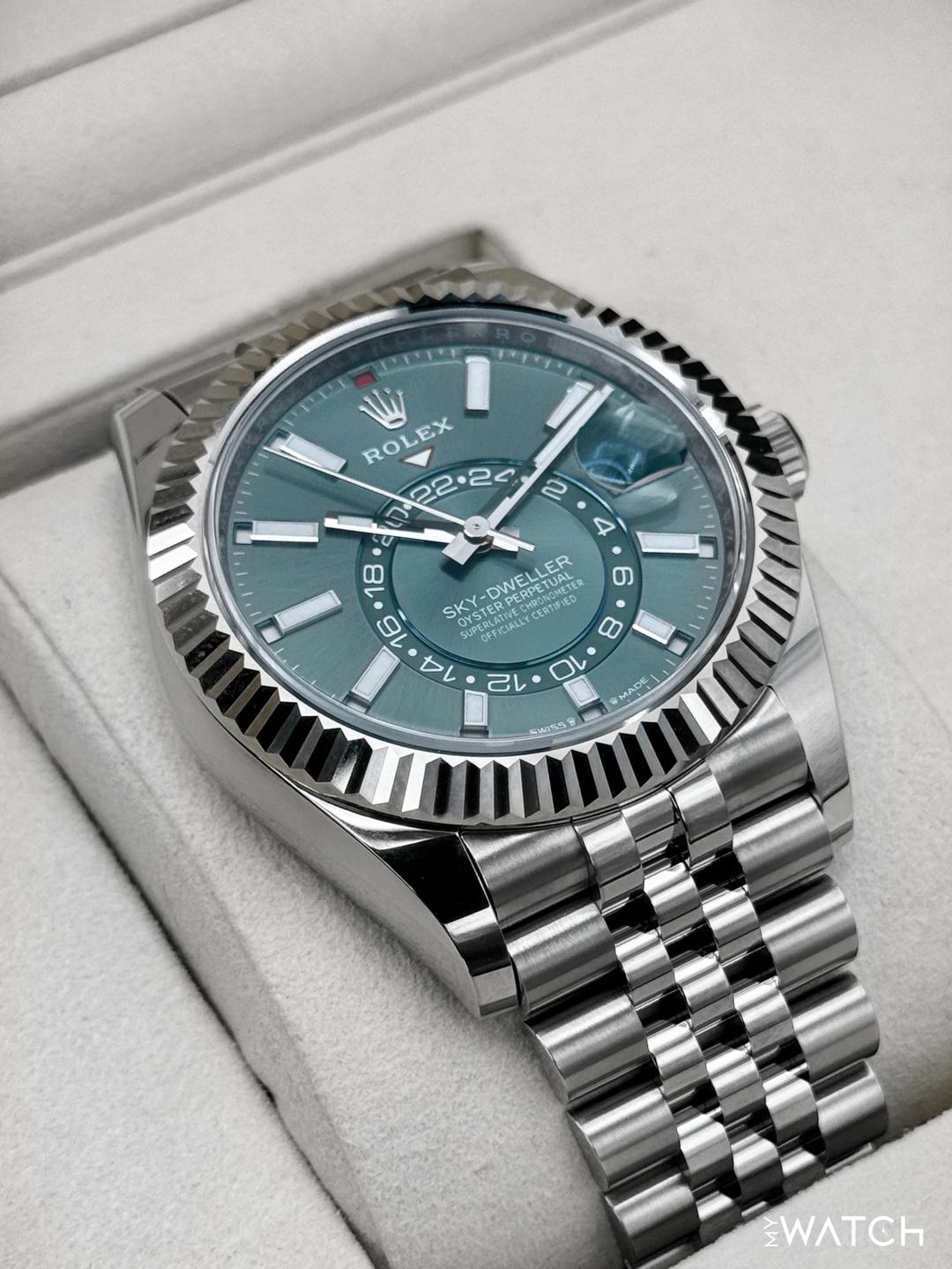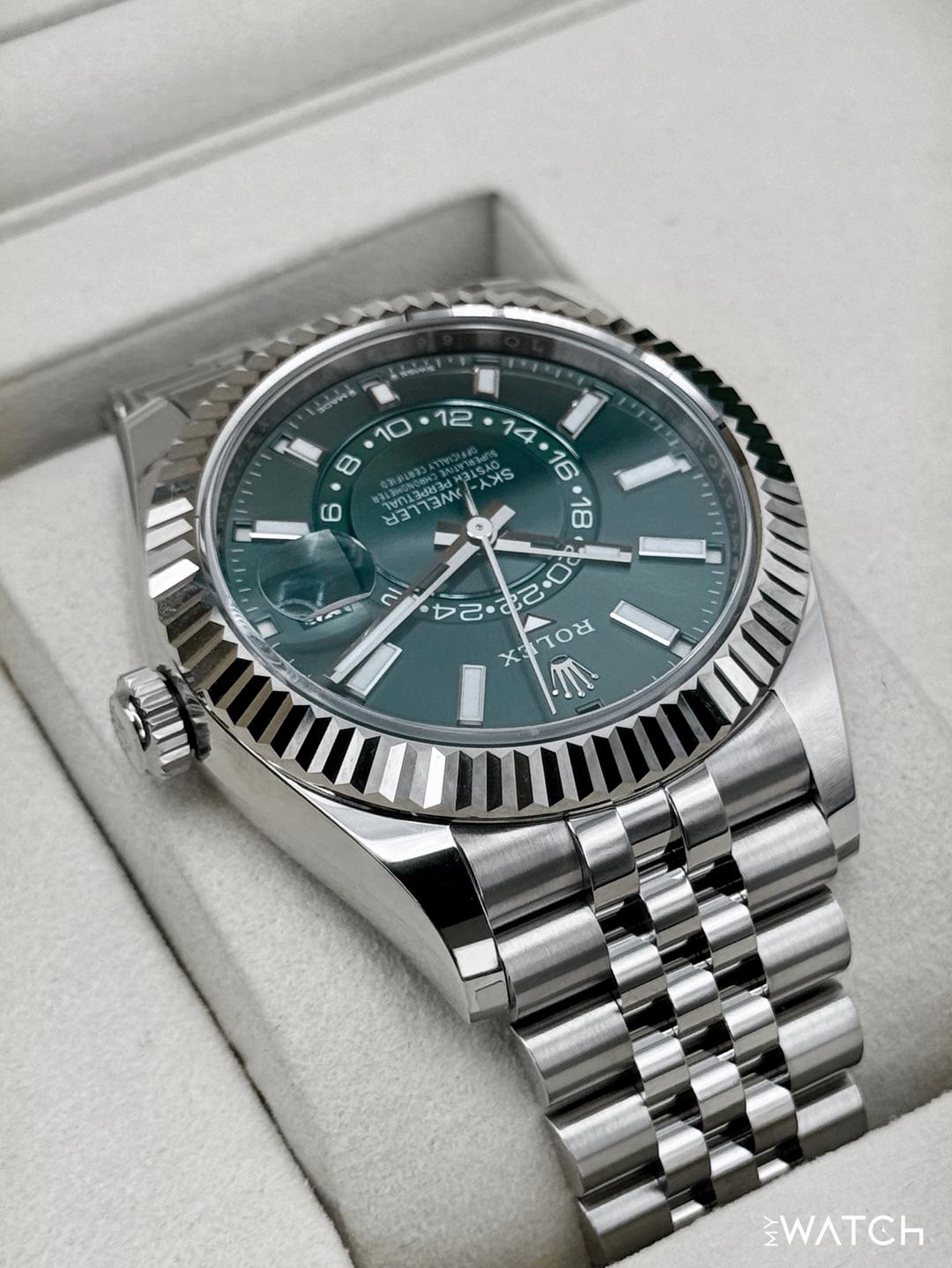🔵**NEW 2026 Rolex Sky-Dweller 42mm 336934 Oystersteel and 18kt White Gold Fluted Bezel with Jubilee Bracelet and Mint Green Dial** 🔵**Note: Watch still has factory stickers on the clasp** 🔵**TRADE or SELL us your luxury watch, all brands considered. Message me details.** **Includes the following:** **✔️BRAND NEW UPDATED ROLEX BOX (Double Boxed)** **✔️Box and Papers - Yes** **✔️Warranty card dated 2026** **✔️5 year manufacturer warranty** **✔️Manual and Warranty booklets** **✔️Green and White Hang Tags included** **✔️Material: Stainless Steel** **✔️Size: 7.75inch wrist (Full Links)** **✔️Watch is BRAND NEW/UNWORN.** **✔️**[**Trades**](https://mywatchllc.com/pages/sell-rolex-watch) **welcome** Business Name: **My Watch LLC** LOCATION: Oak Park, Michigan ✔️[MyWatchLLC.com](http://mywatchllc.com/) for current inventory ✔️Google Business Listing [https://g.co/kgs/Cmd6FPW](https://g.co/kgs/Cmd6FPW) ✔️Business Hours M-F 9-6 ✔️Facetime/Video chat/calls welcome to view the watch interested. ✔️Contact: 248-422-0909 via text or call for quickest response. 🟢TERMS: Visit [MyWatchLLC.Com](http://mywatchllc.com/) for payments accepted 🟢REFERENCES/REVIEWS: We are well reviewed on all platforms from google, trust pilot, rolexforums, additionally we have 300+ reference in multiple FaceBook watch groups, reference checks welcome. 🟢SHIPPING: If you are not local, we offer Fully Insured FedEx overnight shipping in the USA for a fee. International shipping available. [https://mywatchllc.com/products/new-2026-rolex-sky-dweller-42mm-336934-jubilee-green-dial](https://mywatchllc.com/products/new-2026-rolex-sky-dweller-42mm-336934-jubilee-green-dial)