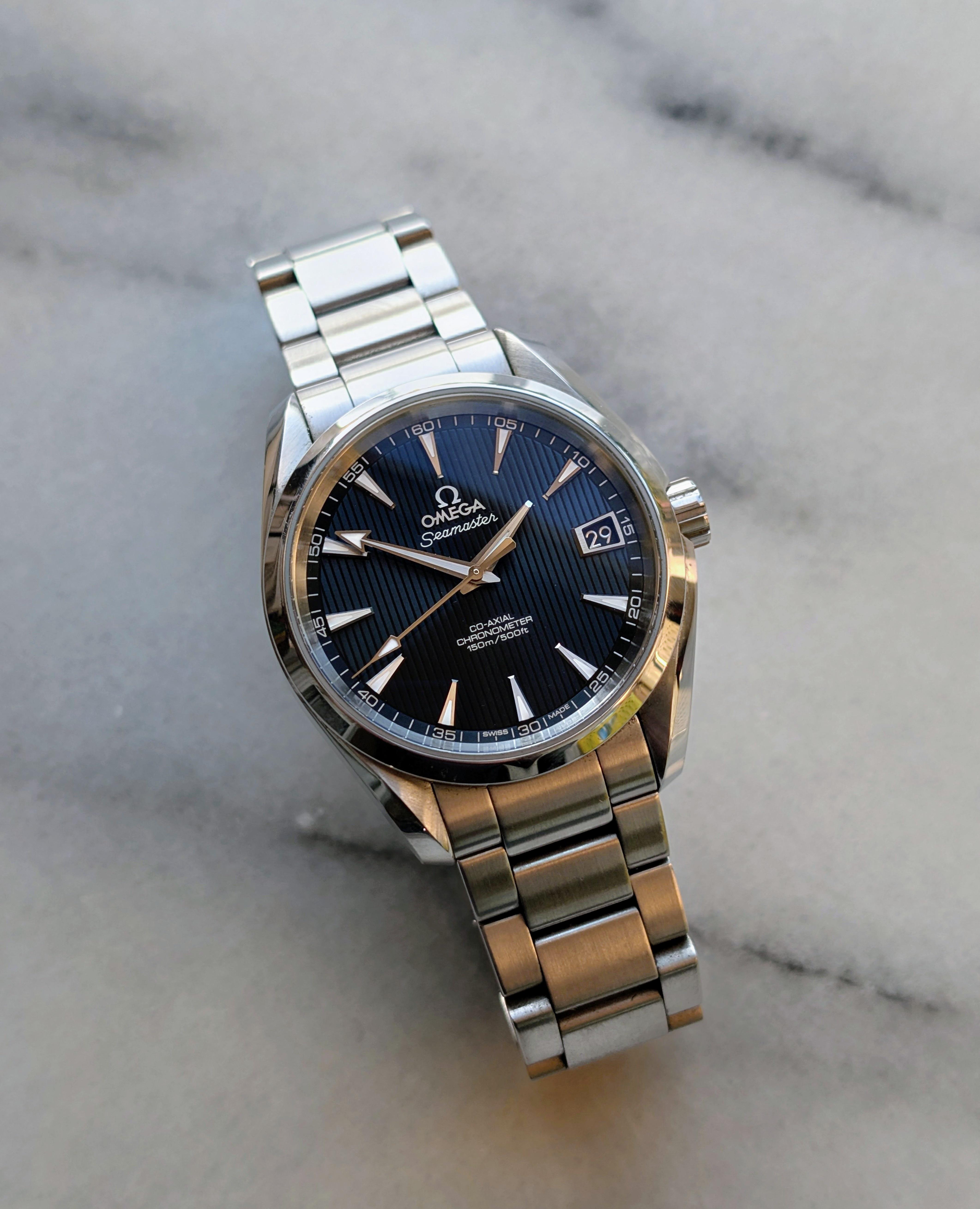 **Omega Seamaster Aqua Terra 150M 'SKYFALL'** James Bond Omega with blue teak dial as seen in SkyFall scenes worn by Daniel Craig 38.5mm stainless steel case, blue teak pattern dial, on stainless steel bracelet. Omega Co-Axial 8500 calibre automatic movement. Comes as watch only in excellent overall condition. Reference 231.10.39.21.03.001 More pics: [https://imgur.com/a/Yo10GJX](https://imgur.com/a/Yo10GJX) $3,900 plus shipping 🛫 All watches shipped FedEx fully insured. Local pickup available in Los Angeles area. 💬Positive feedback from hundreds of successful transactions across the watch community, including WUS, Chrono24, eBay, Facebook, and Reddit. I’m always happy to connect by phone or video call to answer questions or verify details. Zelle, Venmo and wire accepted. ⭐150+ five-star reviews on Chrono24 — buy with confidence. ⌚I have a wide range of exceptional watches available, with new pieces added every week.