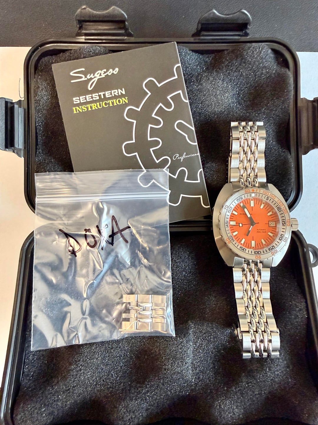 Up for sale is a Seestern Sub 300T Doxa clone. I purchased it because I liked the Doxa and wanted to see how the specs fit on my wrist. Worn about 10 times. Here are the specs: * **Brand** : Sugess * **Model** : DOX01 V3 * **Functionality** : 12 hours Indicator * **Features** : 200M Meters Water Resistant, Date Indicator by date wheel (lumed), case mixed finishings (brushing, polish, sandblasting) * **Movement** : Seiko NH35 Automatic Movement * **Glass Material** : Sapphire crystal * **Case Material** : 316L stainless steel * **Band Material** : Stainless steel * **Diameter** : 42mm * **Thickness** : 13mm * **Lug to Lug:** 46mm * **Lug Width**: 20mm Bought it for $200, selling for $125 shipped to the CONUS. Thanks!