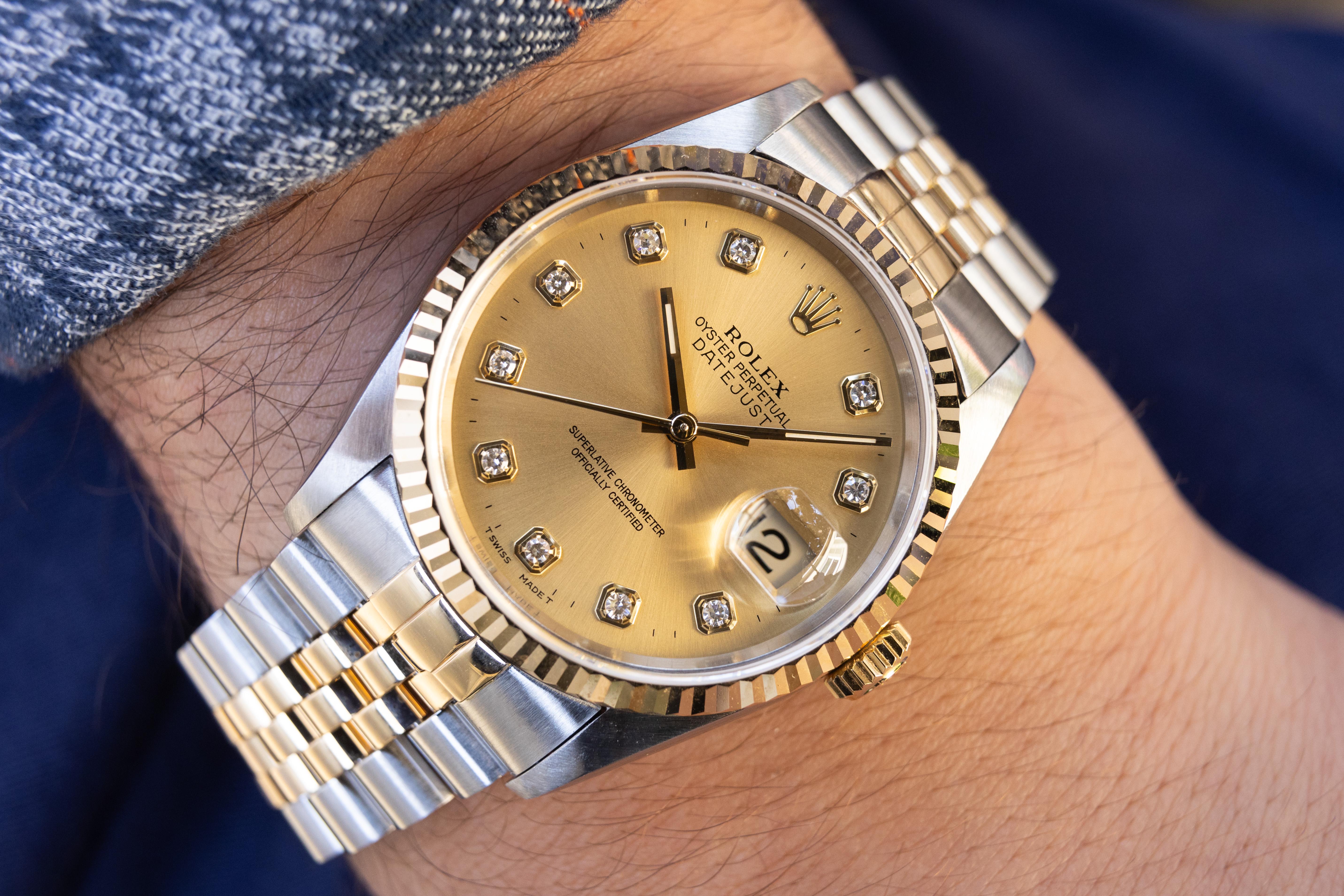 [pics](https://imgur.com/a/ZiIVQJ8) [timestamp](https://imgur.com/e4cO9A9) Case: Excellent condition 36mm no-holes case with thick and even lugs. 18K yellow gold fluted bezel is crisp and remains sharp. Overall minimal signs of use. W-serial. Dial: Excellent condition champagne big diamond dial with matching hands. Bracelet: The 21 link jubilee bracelet is in excellent condition and remains tight. The clasp has a W code dating it to 1995. Accessories: None. Watch only. Notes: Classic champagne dial with a lil extra sauce. Offered at $6,950 shipped. Payment by PayPal F&F, bank wire, or crypto. Located in San Diego, CA. Insured overnight FedEx shipping. International shipping available. Buyers shipping the watch to CA will be required to pay applicable sales tax. Thanks for looking and feel free to message me with any questions!! Hit me up on IG [u/mvvwatches](https://www.reddit.com/user/mvvwatches/) Email: [[email protected]](mailto:[email protected])
