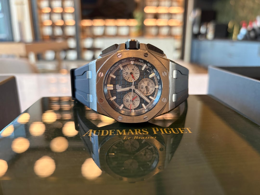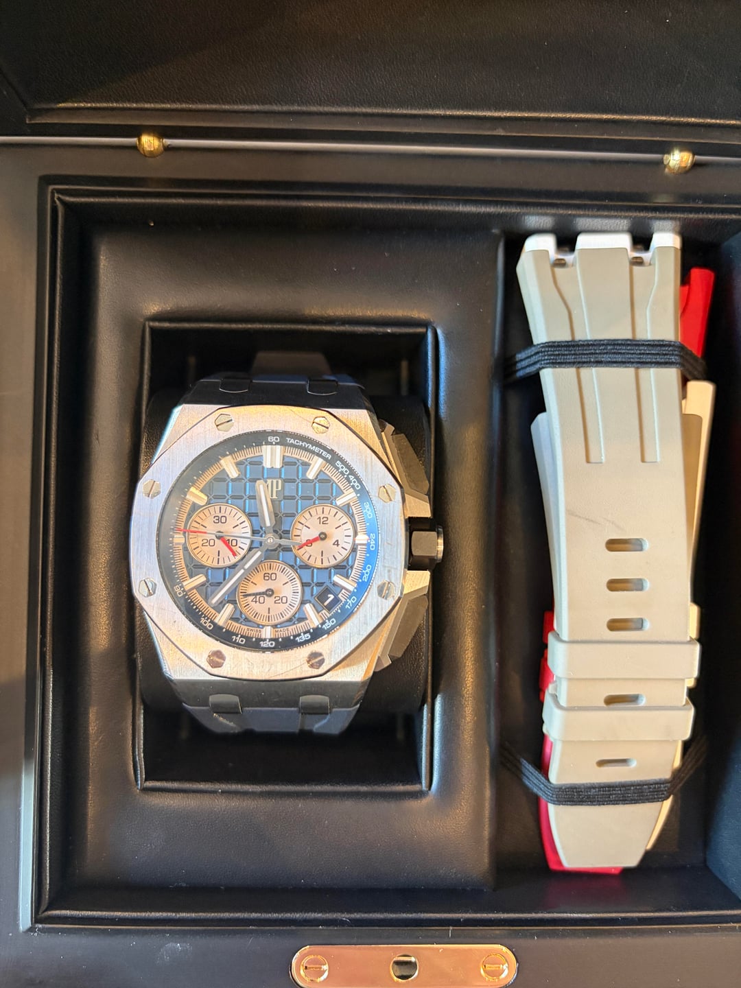 Up for sale is my **Audemars Piguet Royal Oak Offshore Chronograph** (ref. **26420TI.OO.A027CA.01**). This is the stunning **Titanium 43mm model** with the **blue dial and matching rubber strap** — lightweight, sporty, and incredibly comfortable on the wrist. **Condition:** Excellent overall. No dents, dings, or major scratches — only very light wear consistent with careful use. Crystal is flawless. **Includes:** Full set — **box, papers, and original AP accessories**. **Price:** **$27,900 or best reasonable offer.** **Trades:** Open to **partial or full trades** — especially interested in modern sport models or similar-tier pieces (Rolex, Patek, RM, etc.). **Location:** Las Vegas Nevada, Free insured shipping available. This is a clean example of a hard-to-find titanium Offshore that wears beautifully and has great wrist presence without the weight of steel. Feel free to message me with **offers, questions, or trade ideas** — serious inquiries only please.