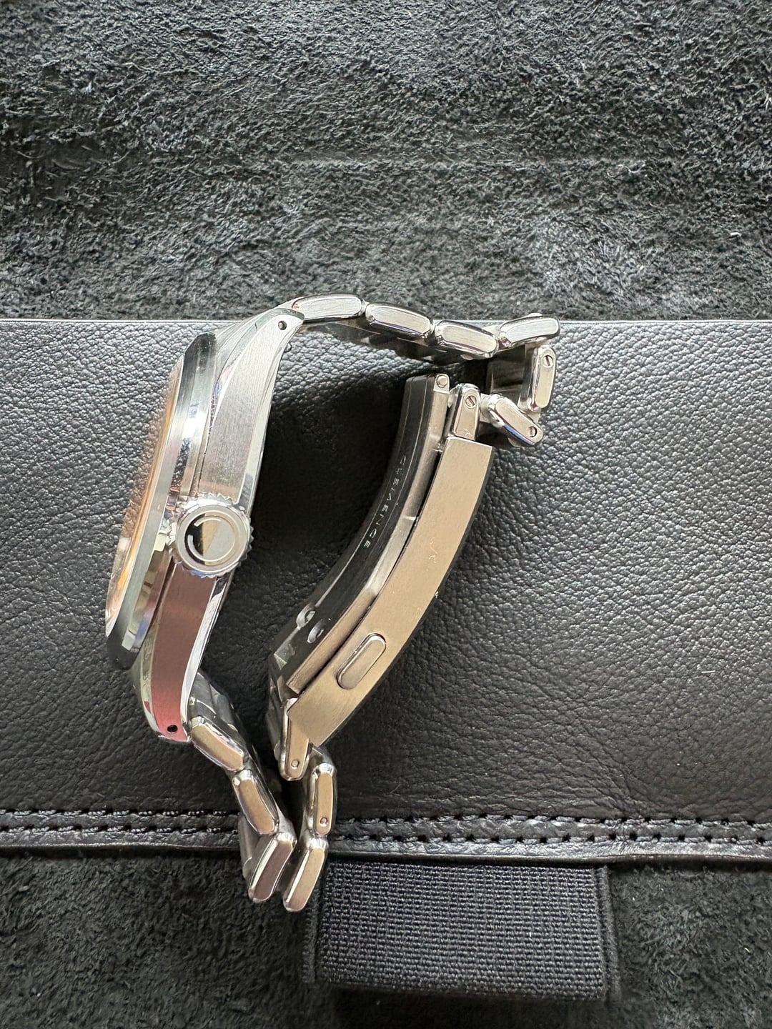 Here is an excellent condition Munro for sale. Includes full kit: watch, bracelet with all links, box, leather travel pouch and warranty card dated March 2025. Specs below. Timestamp in 2nd photo. $675 shipped CONUS. Zelle or Venmo - no trades please. 37.5mm diameter 45mm lug to lug 10 mm thick including box sapphire crystal 150m water resistance Miyota 9039 Drilled lugs 7.5mm screw down crown BGW9 lume ten layer Unique faceted hand set Applied polished indices 20mm to 16 mm taper bracelet 2/3 size link for perfect fit Quick release end links Toolless microadjust clasp