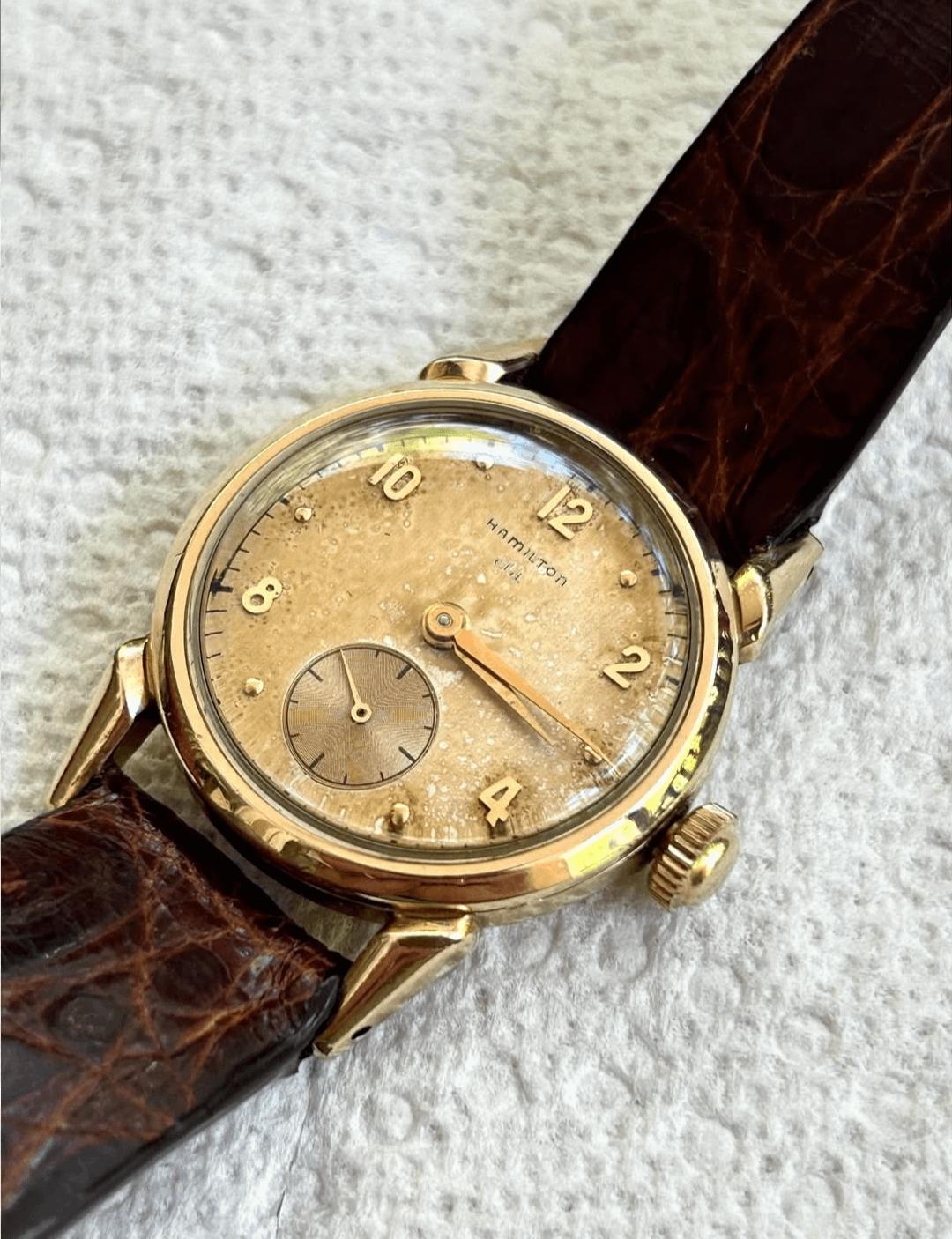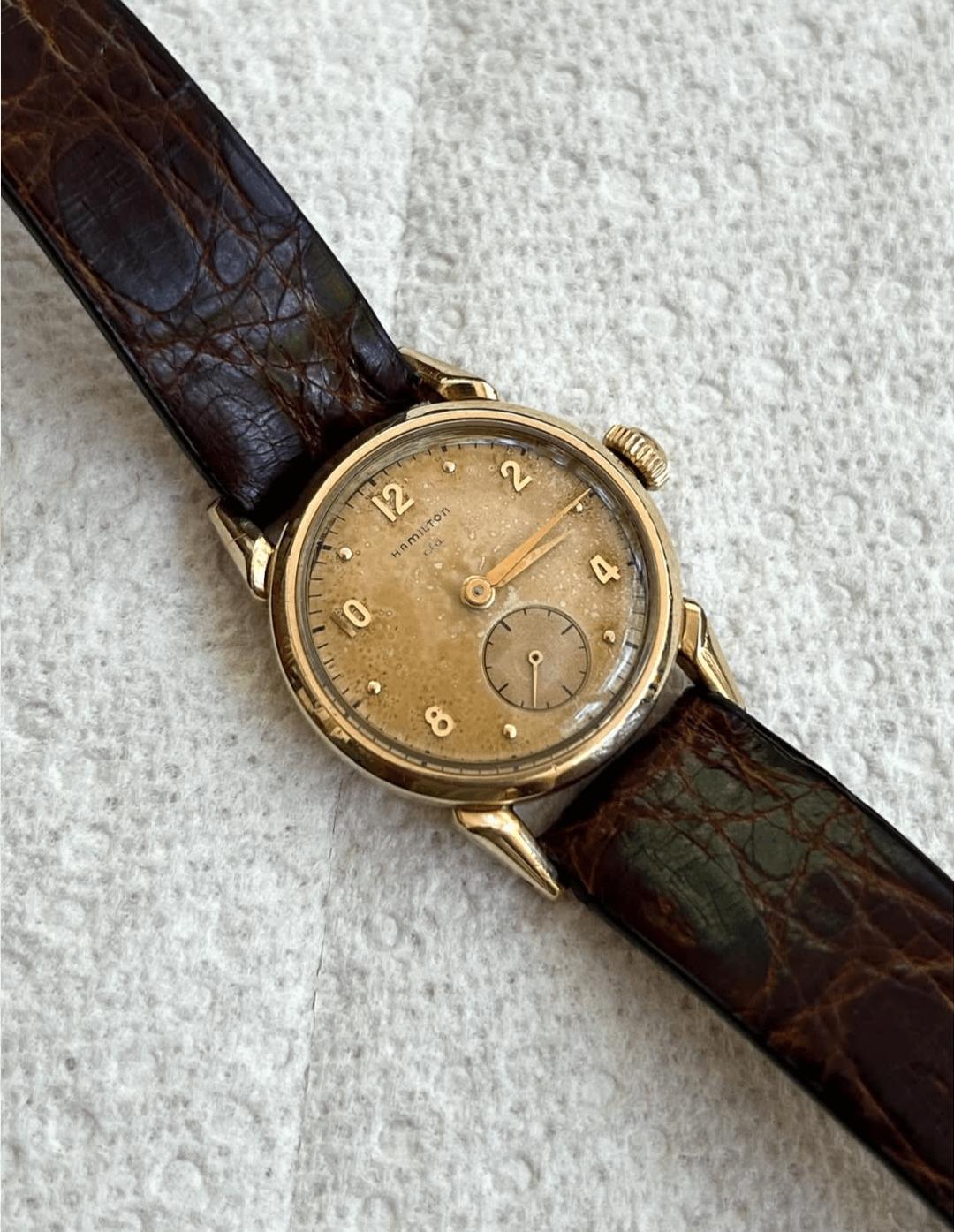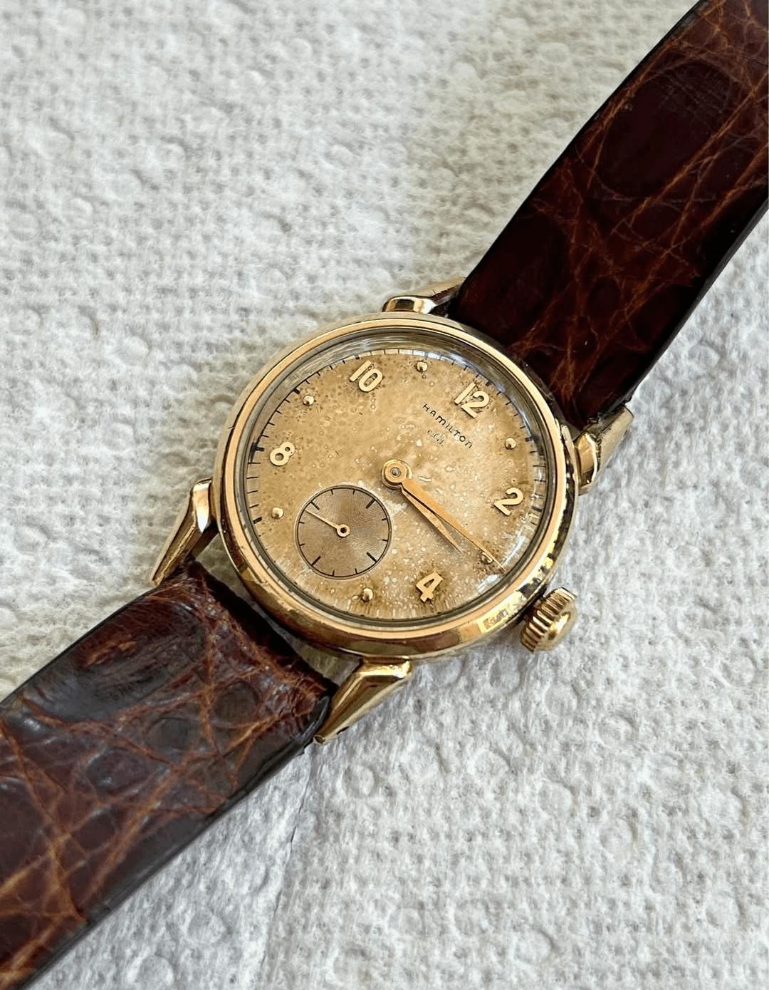 Hello all! This is my first post! I'll do my best to follow all the rules, but if there is anything I could do better or need to do differently next time, I'm all ears! For sale is my \~1950's Hamilton Cld manual wind wristwatch. The dial has some of the most beautiful patina on any vintage watch I've ever owned! The case is gold filled, and 29mm. The strap size is 17mm and is a dark brown crocodile skin. The movement was recently serviced and is running well at +/- 2 seconds/day. I can easily ship anywhere in the U.S, but I've never shipped internationally. We can cross that bridge when/if we get there! I'm asking a negotiable $299.00 U.S, not including shipping.
