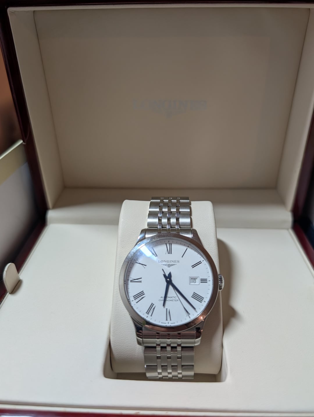 Hello All - For sale is a beautiful Longines Record Automatic Chronometer (Ref. L2.821.4.11.6). This elegant timepiece features a crisp white dial with classic Roman numerals and blued steel hands. It is powered by a COSC-certified automatic movement, visible through the transparent exhibition case back. Condition: The watch is in excellent pre-owned condition and functions perfectly. The stainless steel bracelet and case show minimal signs of wear consistent with careful use. Scope of Delivery (Full Set): Watch: Longines Record L2.821.4.11.6 Box: Original inner wooden presentation box and outer box. Papers: Original User Manual, World Service booklet, and Warranty Card. History: Originally purchased in May 2018. Asking for 1950 USD Link for more pictures: https://www.chrono24.fr/longines/record-automatic--id44510930.htm?SETLANG=en_FR&SETCURR=EUR Watch located in Paris France Delivery for worldwide