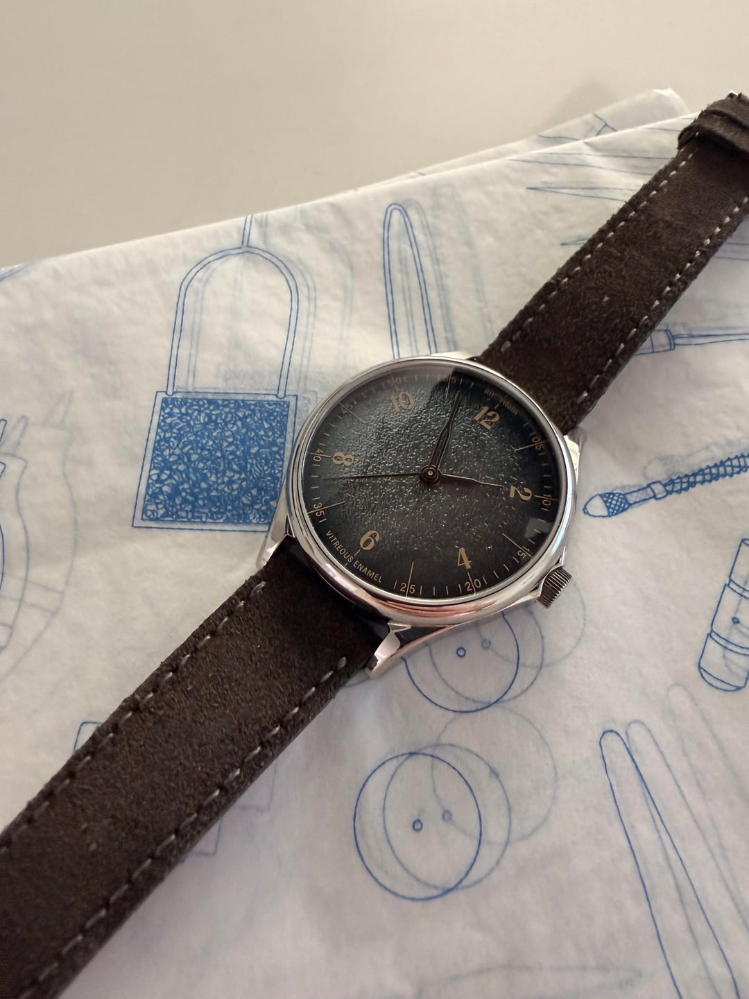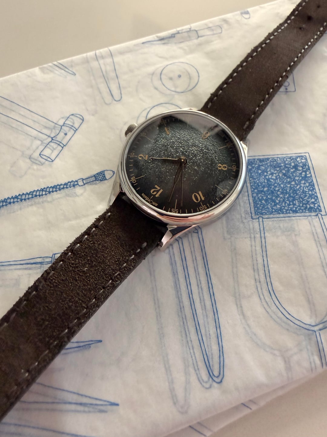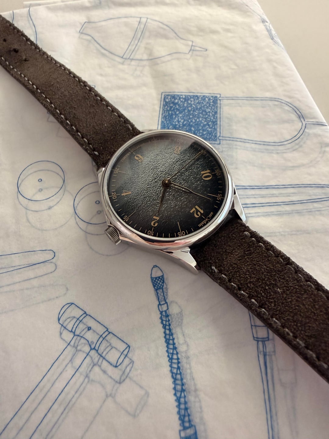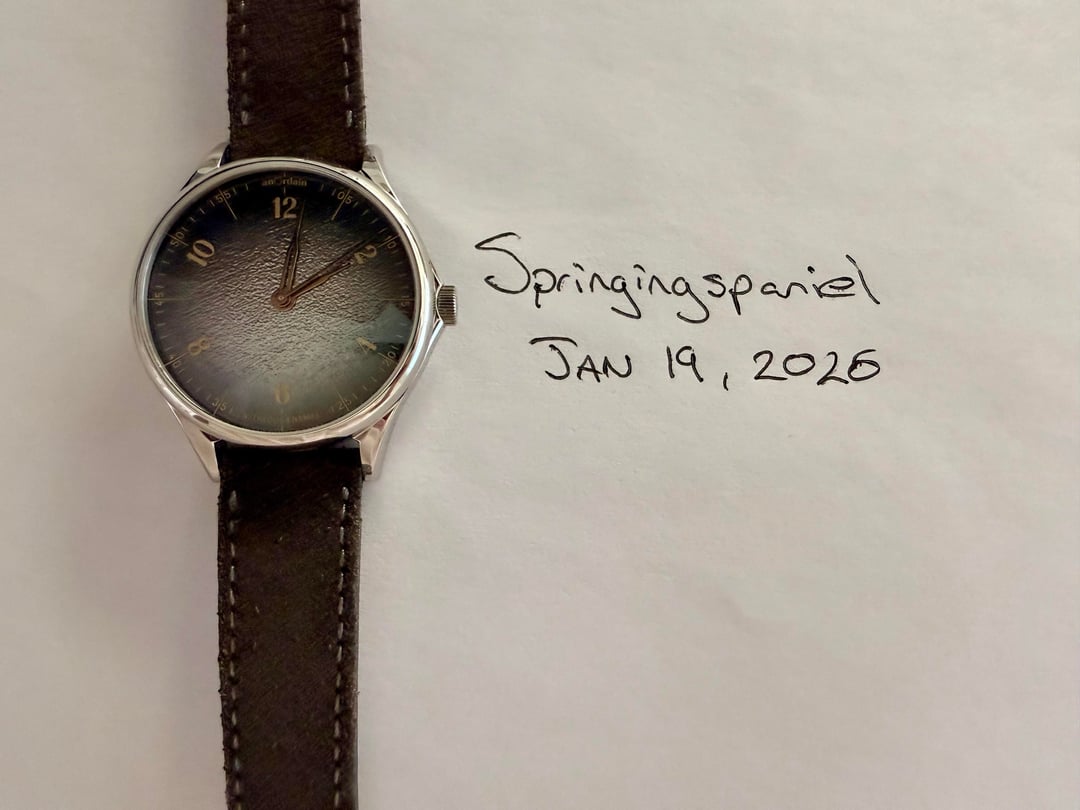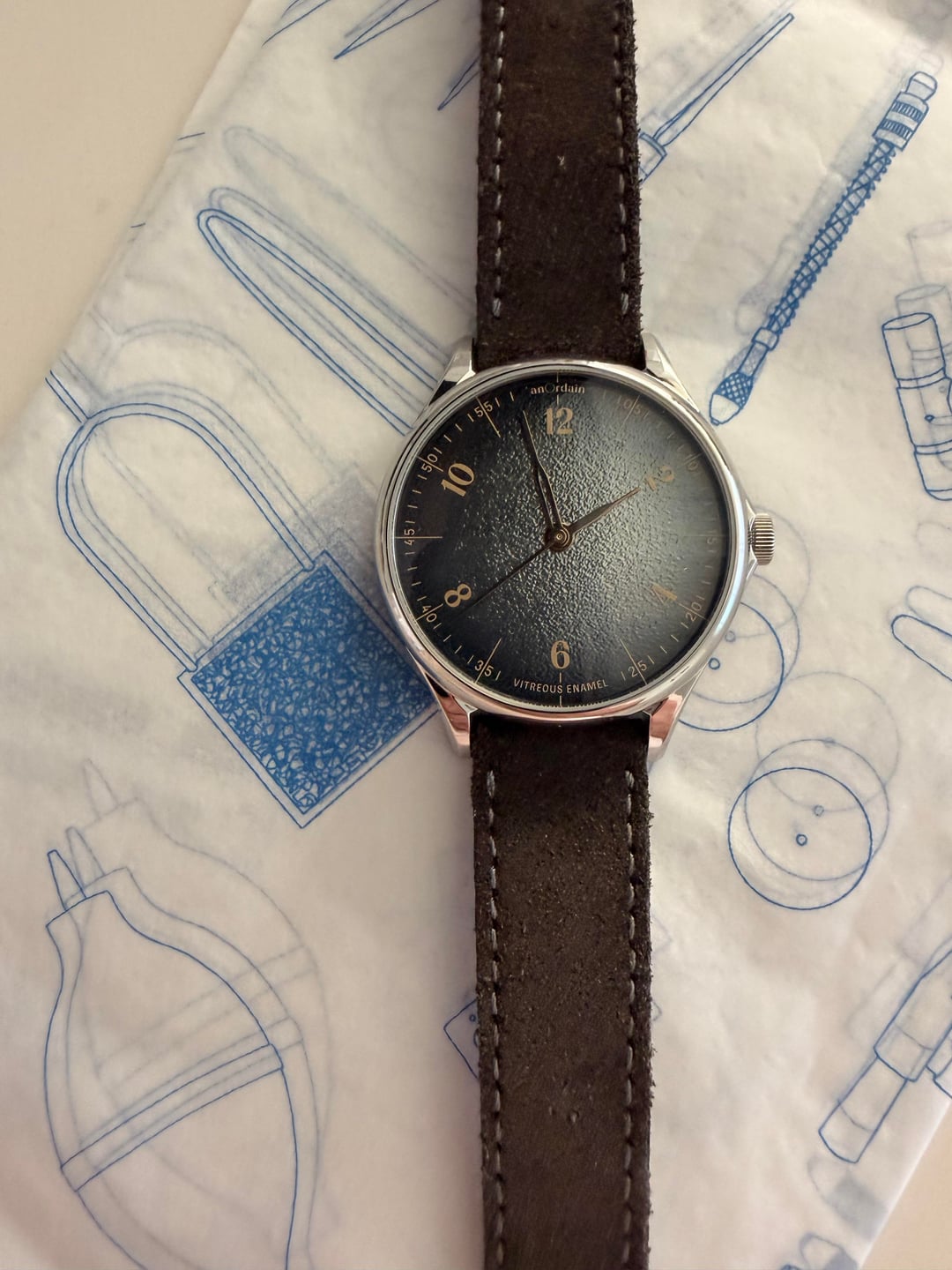 **\[WTS\] AnOrdain Model 1 – Payne’s Grey Fumé Dial – 38mm – Full Set** For sale is my AnOrdain Model 1 featuring the Payne’s Grey Fumé enamel dial. This is a time-only modern watch with balanced proportions and a distinctive enamel dial developed in-house by AnOrdain. **Details:** * **Brand / Model:** AnOrdain Model 1 * **Dial:** Payne’s Grey Fumé enamel * **Case size:** 38mm * **Lug-to-lug:** 46mm * **Movement:** Hand-wound Sellita SW210-1 * **Case:** Stainless steel, unpolished * **Crystal:** Sapphire * **Original sale date:** August 2024 The Payne’s Grey Fumé dial takes its name from painter William Payne, who popularised the practice of blending pigments to create a nuanced alternative to black. Depending on the light, the dial can show silver, purple, or blue undertones. The fumé enamel process was developed by AnOrdain over several years and was the first of its kind when introduced. The case, typography, and hands draw on cartography-inspired design language, with typographic elements influenced by historic maps of the Scottish Highlands. The handset resembles traditional compass needles. **Condition:** Excellent condition. The case is unpolished, and the watch is functioning as expected. **Included:** * Watch * Original box * Papers (Full set) **Price:** **$3,500 USD** **Shipping:** Included within CONUS **Location:** Laguna Beach, CA Local pickup is preferred and can be arranged in Laguna Beach, Orange County, or Los Angeles. Cash only accepted for in-person transactions. Next day tracked shipping with bank transfer / wire only. Timestamp included in photos. Happy to provide additional photos, a live video call, or a custom timestamp for buyer confidence. No paypal or other payment services. Price is firm - it's an incredible watch, available now, under list price, and in excellent condition.