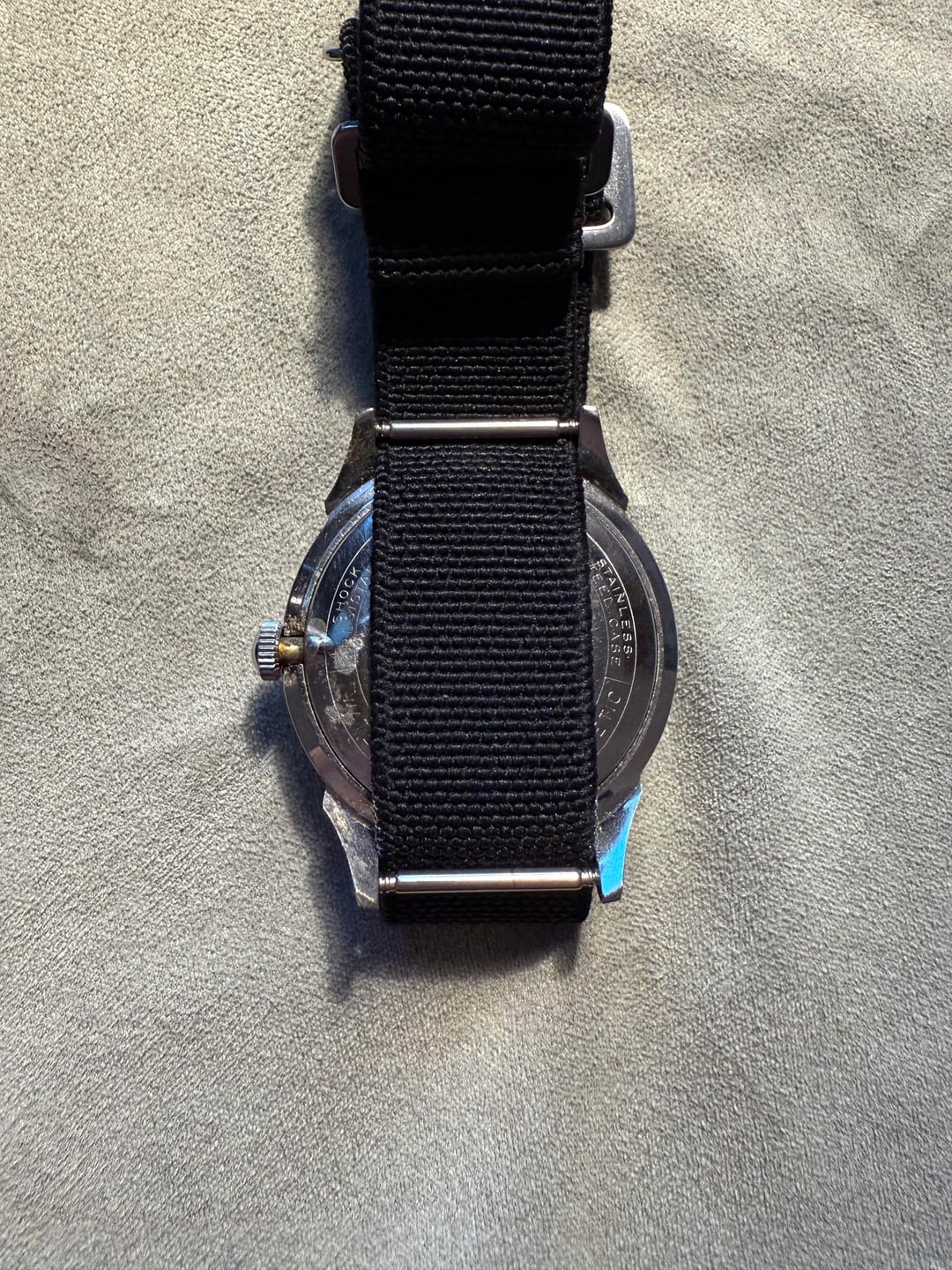 Hello, For sale is a great condition men’s manual wind Bulova from 1963/65 with a very uncommon dial. The watch is in great cosmetic condition. The back of the case does have some pitting (unfortunately not uncommon for Bulovas of this age) but this does not affect the operation of the watch. I believe that the case has been replaced at some point in time as the movement has a date code of 1965, but the case is 1963. However, the case is correct for this reference. The dial is in great condition as well and the lume is stable (and still glows!). The crystal has been replaced and does not have any flaws. The watch will come with the elastic NATO strap pictured as well. Dimensions are: Lug to lug 40.5mm, width without crown 34.5mm, height 9mm Mechanically, the watch is running great with no issues and keeping time very well on wrist. I have serviced this watch, so it will be good to go for many years. If you have any questions, want to see additional photos, etc. please let me know and I would be happy to provide them! I am asking $325 shipped for this watch to the lower 48. If you are outside of the US or in AK/HI, we can certainly figure something out if you are interested.