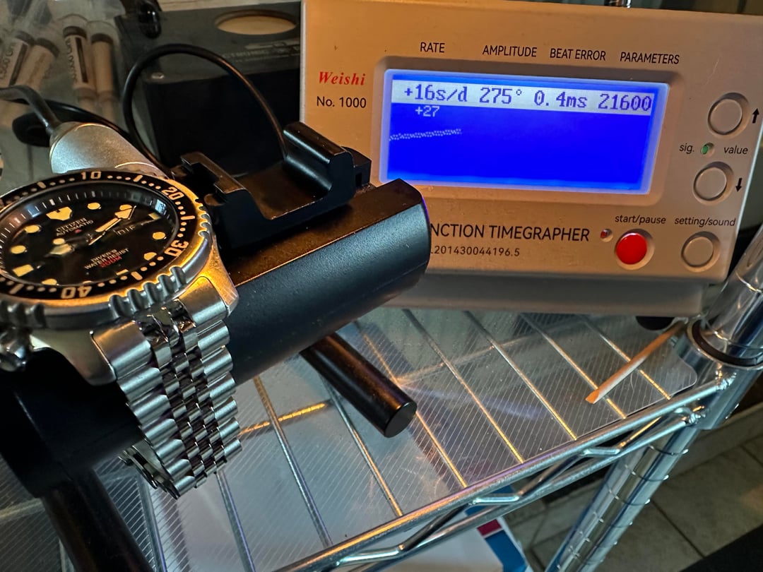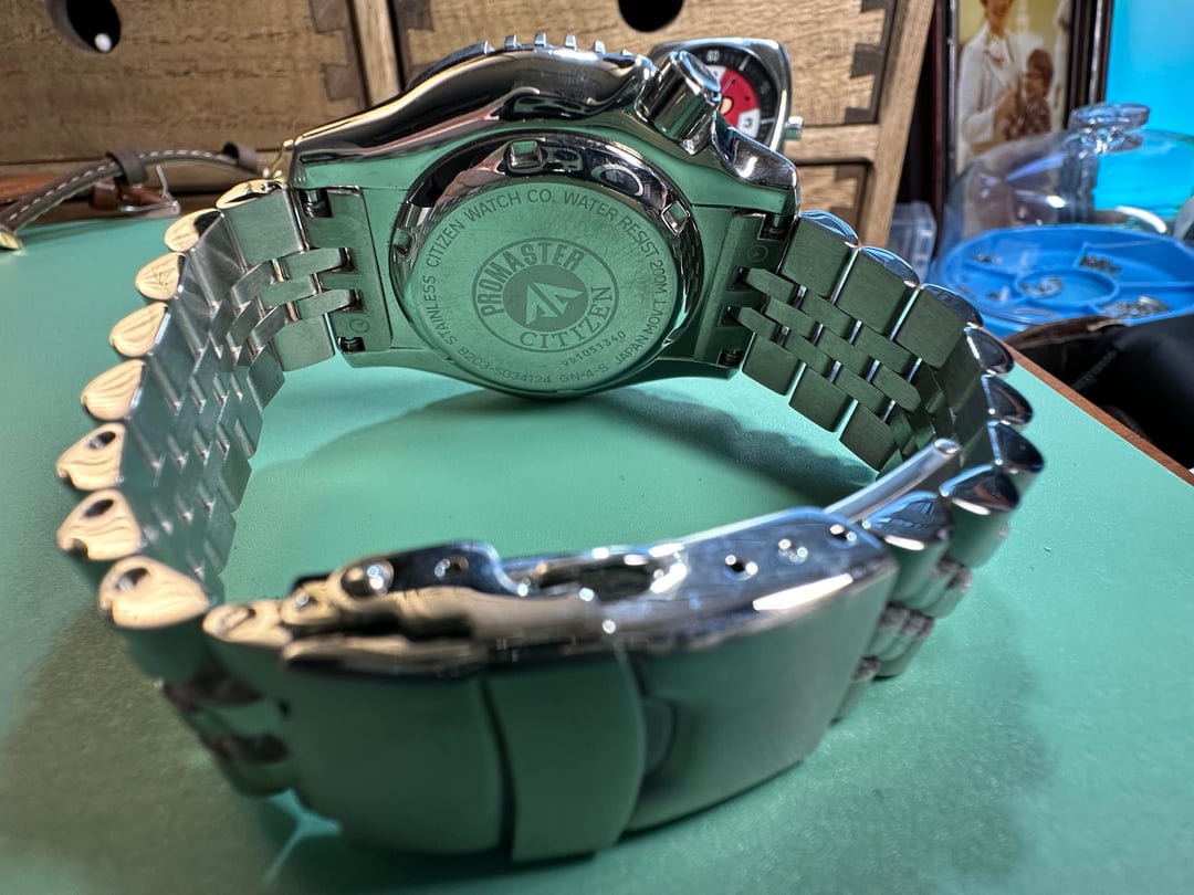 Hi everyone, up for sale is the iconic Citizen NY0040-17L. This is the classic 200m ISO-certified diver used by the Italian Navy (Marina Militare) for decades. This specific example features the English/German day wheel, which is a nice variation for those who like something a bit different. The watch is in great condition and running well. According to the timegrapher (see photos), it’s currently hovering around +16s/d with strong 275° amplitude, which is well within spec for the Miyota 8203 movement. Details: • Bracelet: Currently mounted on a Long Island Watch (Islander) Jubilee ($60 value). It’s a massive upgrade with solid end links and a milled clasp. • Strap: Includes the original Citizen ND Limits rubber strap. • Dial: Stunning sunburst blue that looks incredible in the light. • Lume: Typical Citizen "torch"—very bright and long-lasting. • Condition: Minor desk diving marks on the clasp/bracelet. Crystal has two small scratches and bezel is clean. Includes: Original Citizen box, original rubber strap, and the Islander Jubilee (all links included). Price: $189 shipped to CONUS Accepted: Venmo or PayPal Friends & Family (F&F). PayPal G&S: Accepted only if you have at least five (5) confirmed transactions on r/WatchExchange, and you must add an additional 5% to cover the fee. Not looking for trades, thank you.