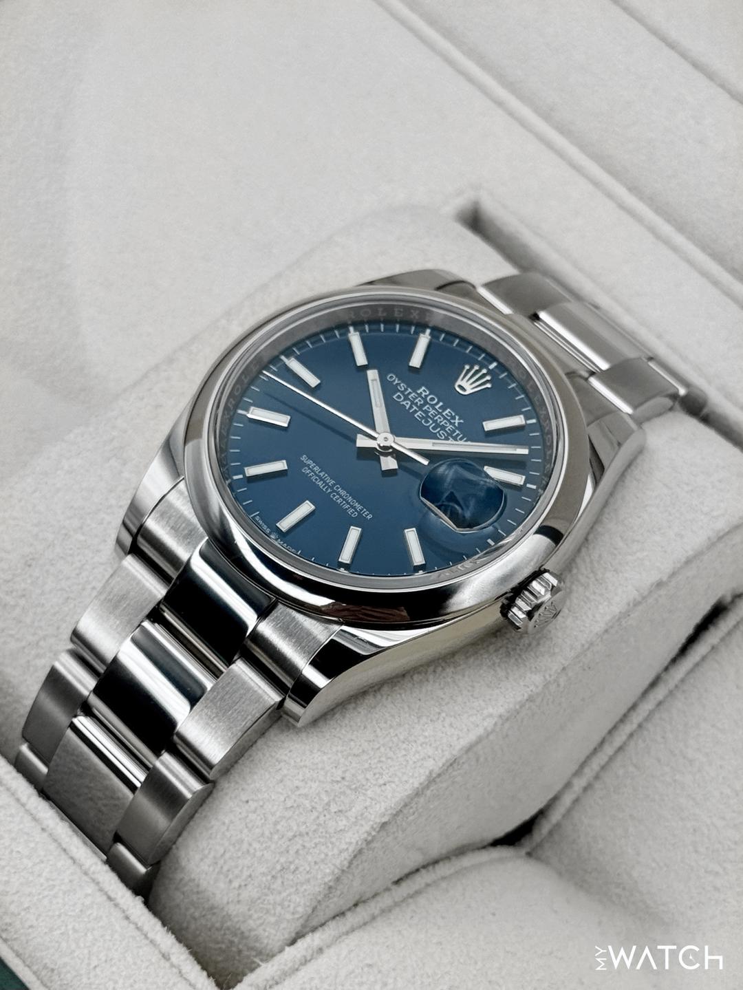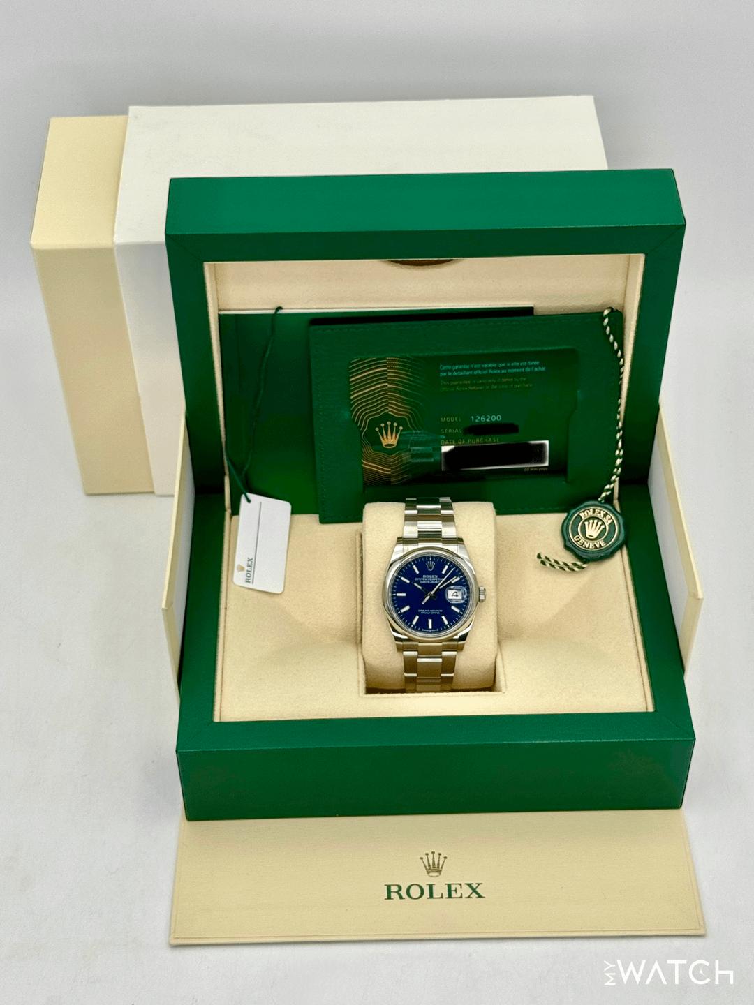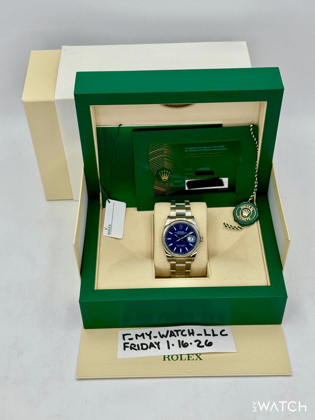 🔵**NEW 2025 Rolex Datejust 36mm 126200 Stainless Steel Oyster Bracelet Blue Dial Smooth Domed Bezel** 🔵**TRADE or SELL us your luxury watch, all brands considered. Message me details.** **Includes the following:** **✔️Original Rolex Double boxed** **✔️Box and Papers - Yes** **✔️Warranty card dated November 2025** **✔️5 year manufacturer warranty** **✔️Manual and Warranty booklets** **✔️Green and White Hang Tags included** **✔️Size: 7.5inch wrist (Full Links)** **✔️Material: Oystersteel** **✔️Watch is BRAND NEW/UNWORN** **✔️**[**Trades**](https://mywatchllc.com/pages/sell-rolex-watch) **welcome** Business Name: **My Watch LLC** LOCATION: Oak Park, Michigan ✔️[MyWatchLLC.com](http://mywatchllc.com/) for current inventory ✔️Google Business Listing [https://g.co/kgs/Cmd6FPW](https://g.co/kgs/Cmd6FPW) ✔️Business Hours M-F 9-6 ✔️Facetime/Video chat/calls welcome to view the watch interested. ✔️Contact: 248-422-0909 via text or call for quickest response. 🟢TERMS: Visit [MyWatchLLC.Com](http://mywatchllc.com/) for payments accepted 🟢REFERENCES/REVIEWS: We are well reviewed on all platforms from google, trust pilot, rolexforums, additionally we have 300+ reference in multiple FaceBook watch groups, reference checks welcome. 🟢SHIPPING: If you are not local, we offer Fully Insured FedEx overnight shipping in the USA for a fee. International shipping available. [https://mywatchllc.com/products/2025-rolex-datejust-36mm-126200-stainless-steel-oyster-blue-dial](https://mywatchllc.com/products/2025-rolex-datejust-36mm-126200-stainless-steel-oyster-blue-dial)