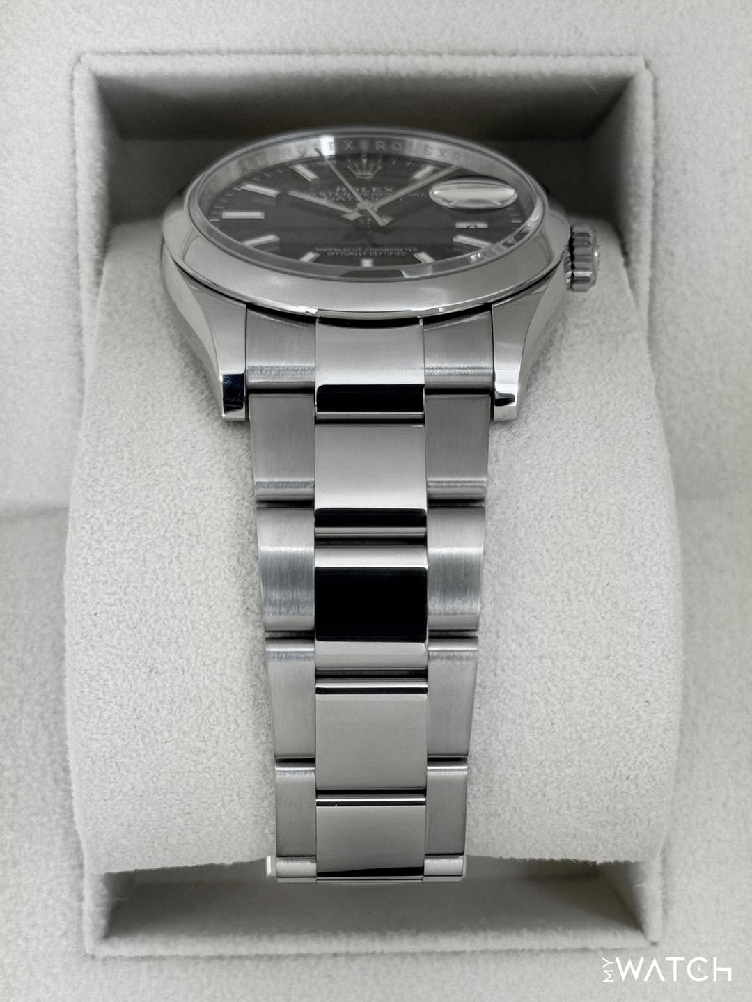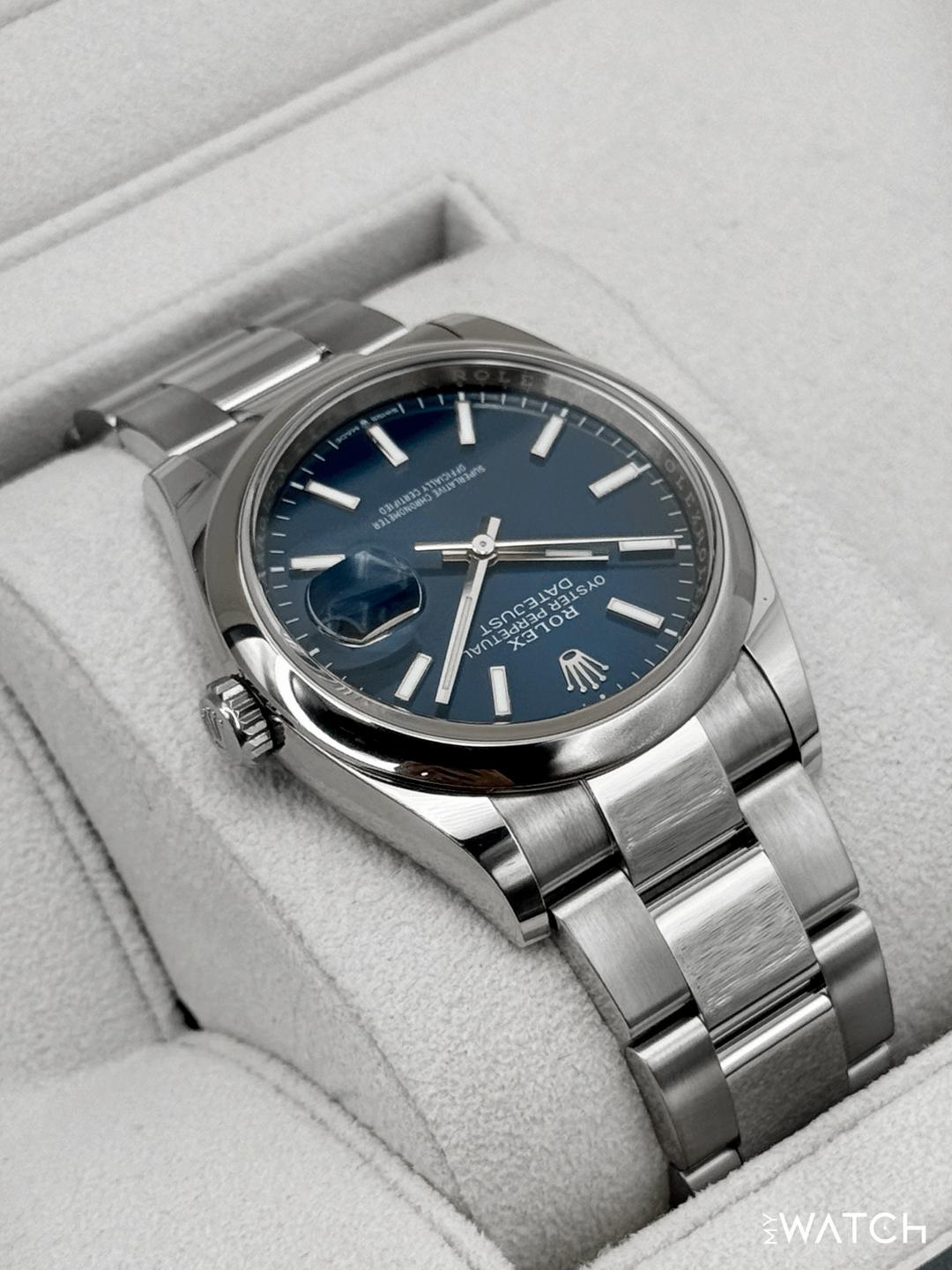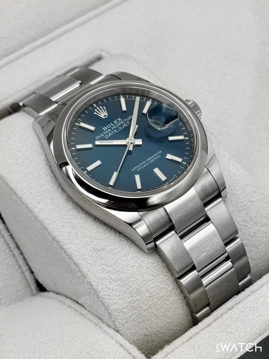 🔵**NEW 2025 Rolex Datejust 36mm 126200 Stainless Steel Oyster Bracelet Blue Dial Smooth Domed Bezel** 🔵**TRADE or SELL us your luxury watch, all brands considered. Message me details.** **Includes the following:** **✔️Original Rolex Double boxed** **✔️Box and Papers - Yes** **✔️Warranty card dated November 2025** **✔️5 year manufacturer warranty** **✔️Manual and Warranty booklets** **✔️Green and White Hang Tags included** **✔️Size: 7.5inch wrist (Full Links)** **✔️Material: Oystersteel** **✔️Watch is BRAND NEW/UNWORN** **✔️**[**Trades**](https://mywatchllc.com/pages/sell-rolex-watch) **welcome** Business Name: **My Watch LLC** LOCATION: Oak Park, Michigan ✔️[MyWatchLLC.com](http://mywatchllc.com/) for current inventory ✔️Google Business Listing [https://g.co/kgs/Cmd6FPW](https://g.co/kgs/Cmd6FPW) ✔️Business Hours M-F 9-6 ✔️Facetime/Video chat/calls welcome to view the watch interested. ✔️Contact: 248-422-0909 via text or call for quickest response. 🟢TERMS: Visit [MyWatchLLC.Com](http://mywatchllc.com/) for payments accepted 🟢REFERENCES/REVIEWS: We are well reviewed on all platforms from google, trust pilot, rolexforums, additionally we have 300+ reference in multiple FaceBook watch groups, reference checks welcome. 🟢SHIPPING: If you are not local, we offer Fully Insured FedEx overnight shipping in the USA for a fee. International shipping available. [https://mywatchllc.com/products/2025-rolex-datejust-36mm-126200-stainless-steel-oyster-blue-dial](https://mywatchllc.com/products/2025-rolex-datejust-36mm-126200-stainless-steel-oyster-blue-dial)
