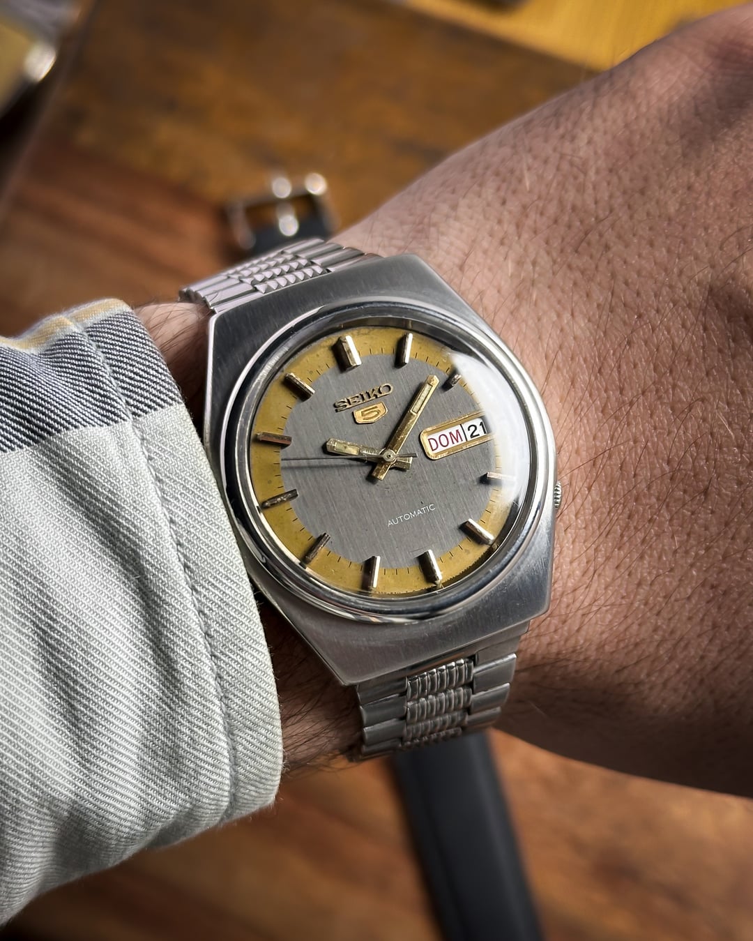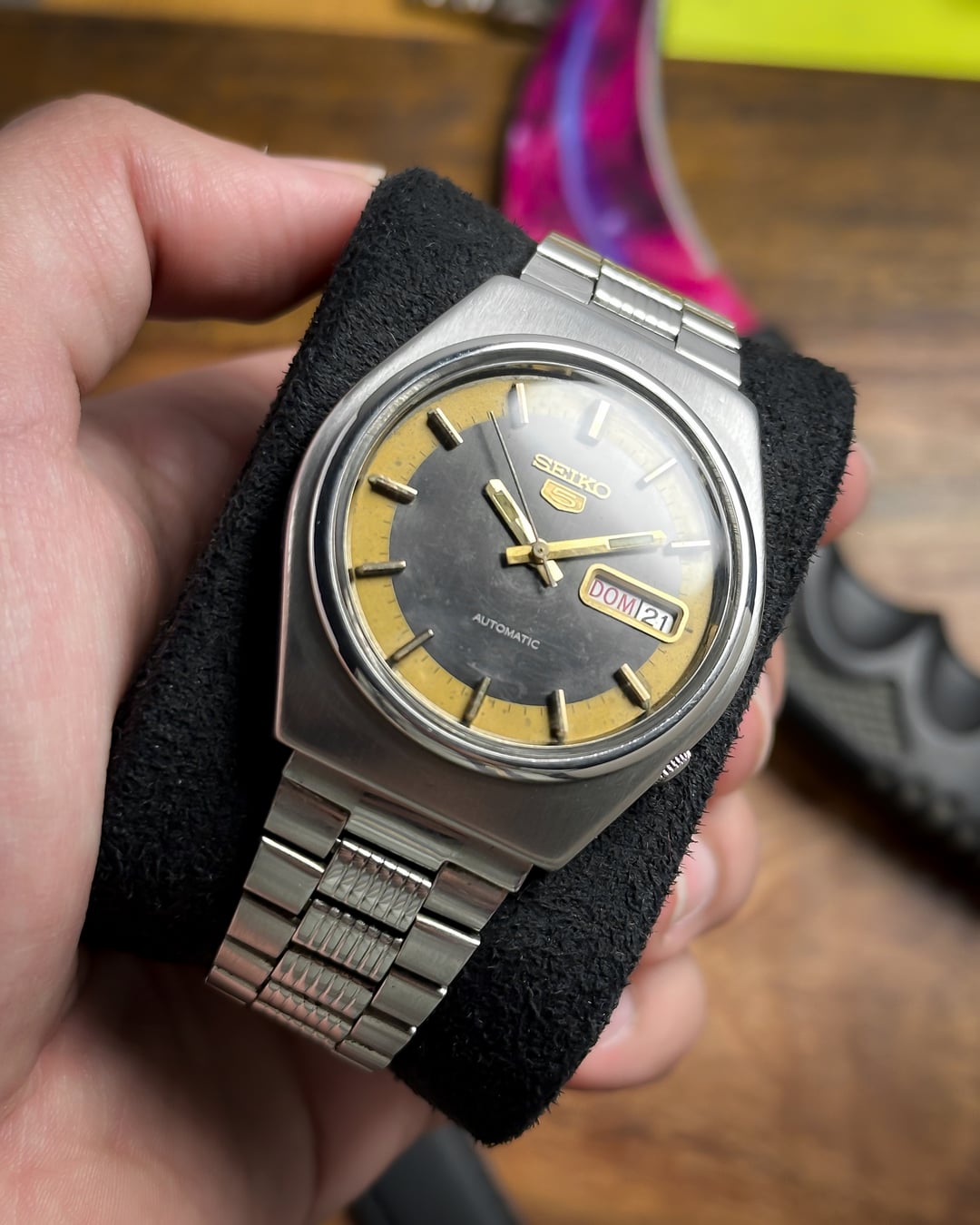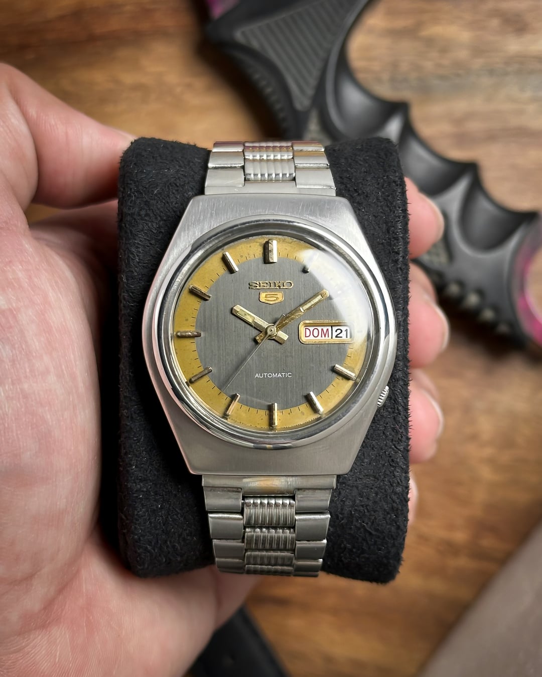 [Timestamp](https://drive.google.com/file/d/1zY_wd3tvL0Z7Xd55ZM7uEVWOE_KwRZTf/view?usp=sharing) Hey Watchexchange! Up for sale is a character-rich **Seiko 5 from January 1982 (Ref. 6309-8500)**. This watch is a perfect example of why vintage Seiko collectors love "patina"—it tells a story while maintaining a high-end, textured aesthetic. The dial is the centerpiece: it features a rare **iridescent linen pattern** in a shifting gray/black tone. This is framed by a unique **mustard border outline** with black minute markers, creating a "radar" effect that looks like a glowing sweep on a vintage sonar screen. The dial shows some beautiful natural aging and patina around the edges and center, giving it a true vintage soul. The **bold gold-tone pencil hands** and **applied gold-tone baton indices** provide a sharp contrast against the slate gray background. Protecting the "screen" is a beautiful **domed plexiglass** crystal that adds warmth and vintage distortion at certain angles. The case is a robust, hooded-lug design with a **brushed matte finish**, featuring the classic **tucked crown at 4 o'clock**. It comes on its **original stainless steel bracelet**, which features a unique **mid-lined texture** on every center link. These vertical ridges catch the light beautifully and mirror the industrial, textured look of the linen dial. ***🔹 Key Dimensions*** * **Case Diameter:** 36mm (without crown) * **Lug-to-Lug:** 41mm * **Thickness:** 11mm * **Lug Width:** 18mm 💵 **Price: $135 shipped!** **🚢ing through UPS** 📦 **Payment: PayPal F&F** or G&S (**+4.5% fee by buyer**) or **bank wire (US banks accepted)** 📩 **DM me for more photos or a custom timestamp.** If you love 80s tech-aesthetics and watches with real character, the **Vintage Radar** is ready for its next mission. Follow my [**Instagram**](https://www.instagram.com/everistwatches/) and **Reddit profile** for more **vintage drops**.