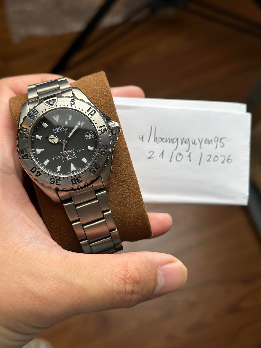 Up for sale is the Seiko Titanium “Air Diver” SCVF001 from 1995 in good serviced condition Images: https://drive.google.com/drive/folders/1zzHrIEWtkPneDcJEpX3rh1Hq4rlFd0D- Video: https://drive.google.com/file/d/1PaUNH82pphYwLwPkeW9Qbt6TaEY18rUr/view?usp=drivesdk Timestamp: https://drive.google.com/file/d/1x0ujBl-ZqPNX9SJCP_uyUOQsb1zLLSov/view?usp=drivesdk Released alongside the 4S15 Red Alpinist family, the Seiko SCVF001 shares the same Alpinist DNA, most notably seen in its cathedral hands. The 12 o’clock index pays homage to the first Seiko Alpinist, the Laurel Alpinist 14041, reinforcing its deep-rooted heritage. The watch features a monocoque titanium case with a screw-down crown, ensuring durability and water resistance. Its brushed stainless steel bezel adds a utilitarian edge, contrasting beautifully with the lumed indices for enhanced visibility. The original bracelet includes a ratchet buckle clasp, allowing for easy micro-adjustments—whether for a wetsuit or just added comfort in warm weather. The case measures 40mm in diameter, 12.5mm thick, with a 46mm lug-to-lug and a 19mm lug width. Powering the watch is Seiko’s in-house 4S15 movement, a descendant of the revered 52-family calibers. This hi-beat movement runs at 28,800 bph, delivers a 40-hour power reserve, and maintains an accuracy of +25/-15 seconds per day—matching the specs of modern 8L movements which is used for Grand Seiko, aside from power reserve. An interesting fact about this watch is that it was designed by Nobuhiro Kosugi, who later became Grand Seiko’s chief designer. Because of its high-quality finishing and precision, it’s often nicknamed the “mini-GS diver”. This watch is in great condition for its age, showing minor scratches with no dents. It has been recently serviced and is keeping great time at +/-5s a day. The crystal is clean, and the dial retains its color. The watch comes fitted on OEM titanium bracelet that fits up to 20cm (8 inches) with adjustable clasp can be extended to 24cm (9.5 inches). While the original box and papers are not included, a standard seiko box will be provided upon purchase. Price: $900 + $60 flat shipping (via UPS/DHL express with tariffs and duty fee covered). Payment via PayPal F&F or G&S (+4.6% fee paid by the buyer). Not accepting trades. Feel free to message me with any questions or if you’re interested. Have a great day! Check out my other watches on Instagram: @jasonswatchcorner