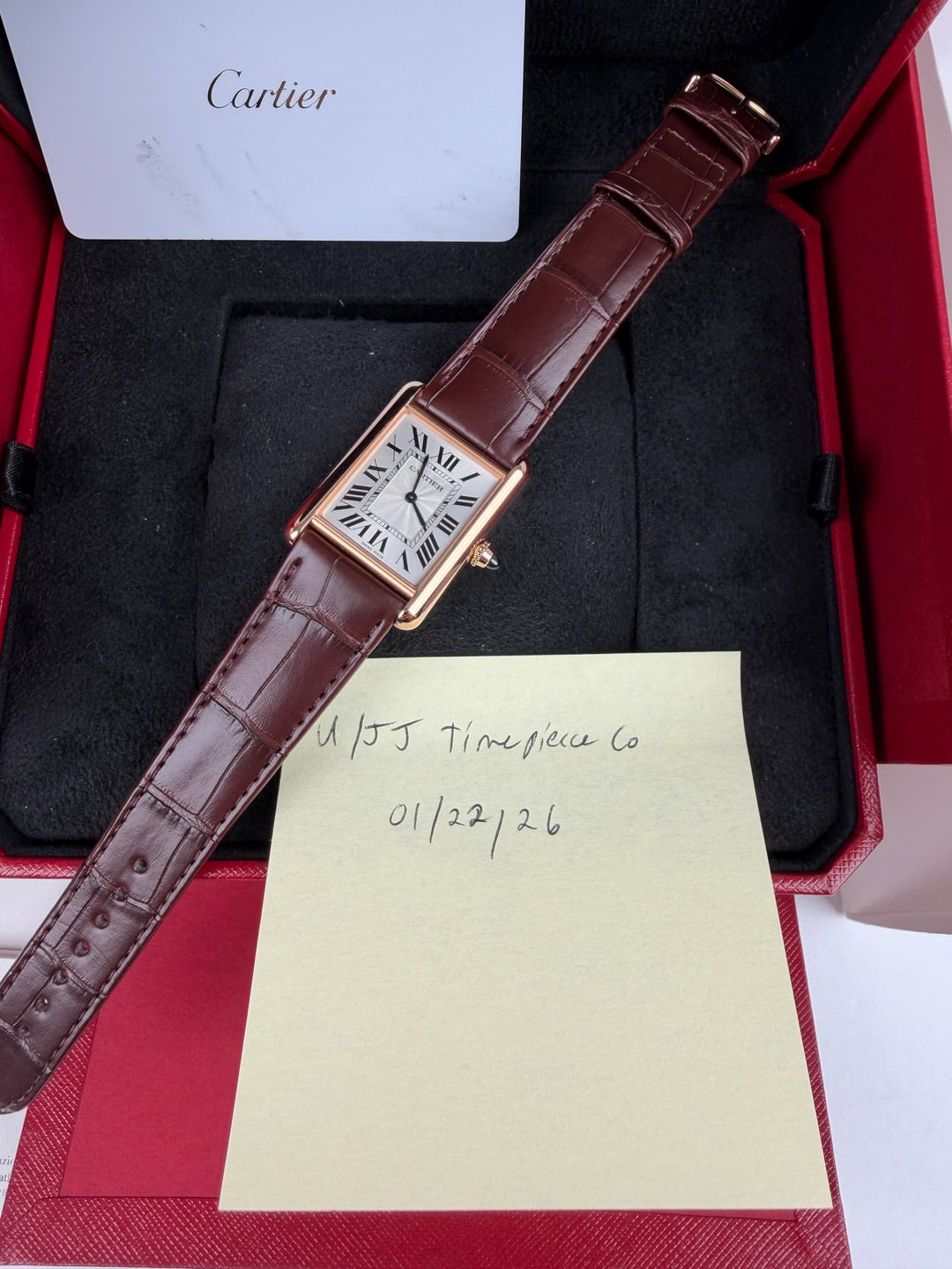 2025 Cartier Tank WGTA0011Complete Set Mint Timestamp: [https://imgur.com/a/IcxBSXX](https://imgur.com/a/IcxBSXX) The WGTA0011’s rectangular case is crafted in 18-karat rose gold, measuring approximately 33.7 mm × 25.5 mm with an elegant 6.6 mm thin profile that ensures comfortable wear under a cuff. Its silvered dial is punctuated by Cartier’s signature Roman numerals and blued-steel sword hands, creating a striking yet refined visual contrast. A classic beaded crown set with a sapphire cabochon completes the case architecture with a discreet flourish. At the heart of this watch lies a manual-winding mechanical movement (Caliber 8971 MC), celebrating traditional watchmaking with precision and tactile engagement. The WGTA0011 is paired with a fine brown alligator leather strap secured by a tang buckle in matching rose gold, ensuring both comfort and bespoke elegance. Comes as a complete set, Inner/Outer box, Warranty Card, Booklet, Bezel Protector. Watch is in MINT condition. Please look over my pictures closely as I like to properly represent the watch you will be receiving. Please look over my pictures closely as I like to properly represent the watch you will be receiving. **Offered at $14,749 shipped in US or OBO.** Payments accepted: Wire or Direct Bank Transfer (Bank of America). Shipping is always FedEx/UPS overnight, fully insured. I am an avid enthusiast and collector and am not affiliated with any watch brand I post. **Always open to trades or purchases! Looking for Audemars Piguet, Rolex, Patek Philippe, F.P. Journe, Vacheron Constantin, and other luxury brands.** I guarantee every watch I sell to be 100% authentic. Follow me on IG: JJ\_Timepiece\_Co Call or text (941) 800-3931