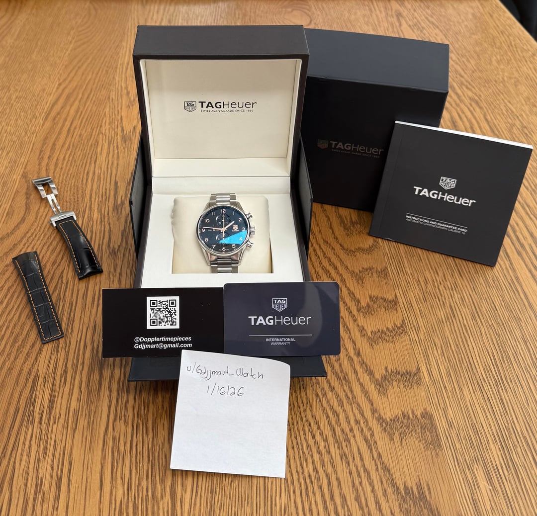 Hey WatchEx ! Here is a stunning TAG Heuer Carrera Cal 1887 Chronograph **Ref** CAR2014.BA0799 **Condition**: Very Good Pre-owned **Scope of Delivery**: * Double Box * Booklet * Warranty Card * Bracelet (Mint) never used * Brand new aftermarket leather strap **Price:** ===$1,999 + shipping ($50 Fedex Insured 2 days CONUS)=== **Description:** * **Model:** TAG Heuer Carrera Calibre 1887 Chronograph * **Reference:** CAR2014.BA0799 (BA0799 denotes the steel bracelet) * **Movement:** TAG Heuer Calibre 1887 Automatic * **Case:** 43mm polished stainless steel * **Dial:** Black with Arabic numerals, chronograph subdials, and luminous hands/markers * **Bracelet:** Stainless steel with a push-button deployant clasp * **Functions:** Chronograph (12-hour, 30-min, running seconds), Date, Small Seconds * **Crystal:** Scratch-resistant sapphire with anti-reflective treatment * **Water Resistance:** 100 meters (330 feet) * **Power Reserve:** Approximately 50-52 hours * **Caseback:** Display (exhibition) back showing the movement Watch ships from San Diego, happy to meet local buyers or FaceTime as needed Thanks Follow on IG @ Dopplertimepieces
