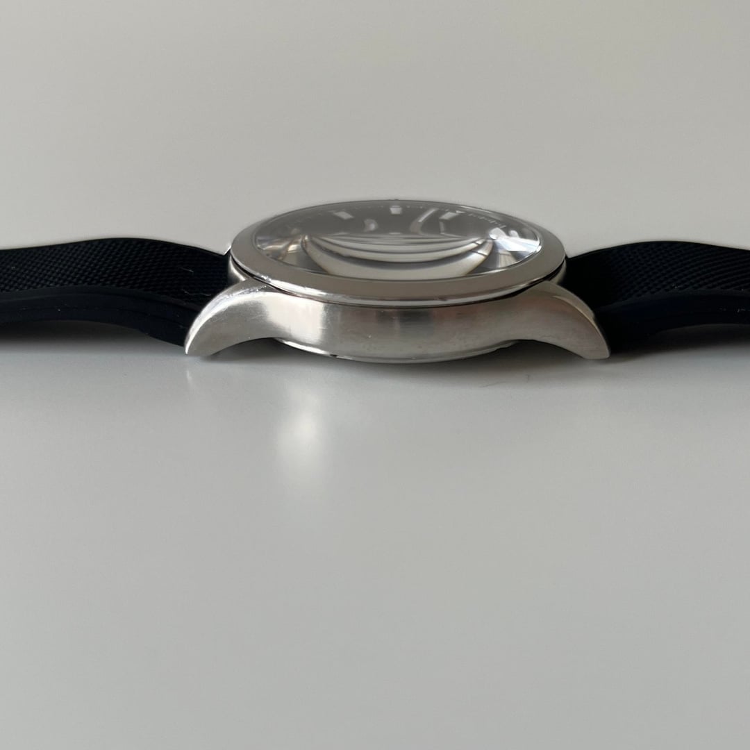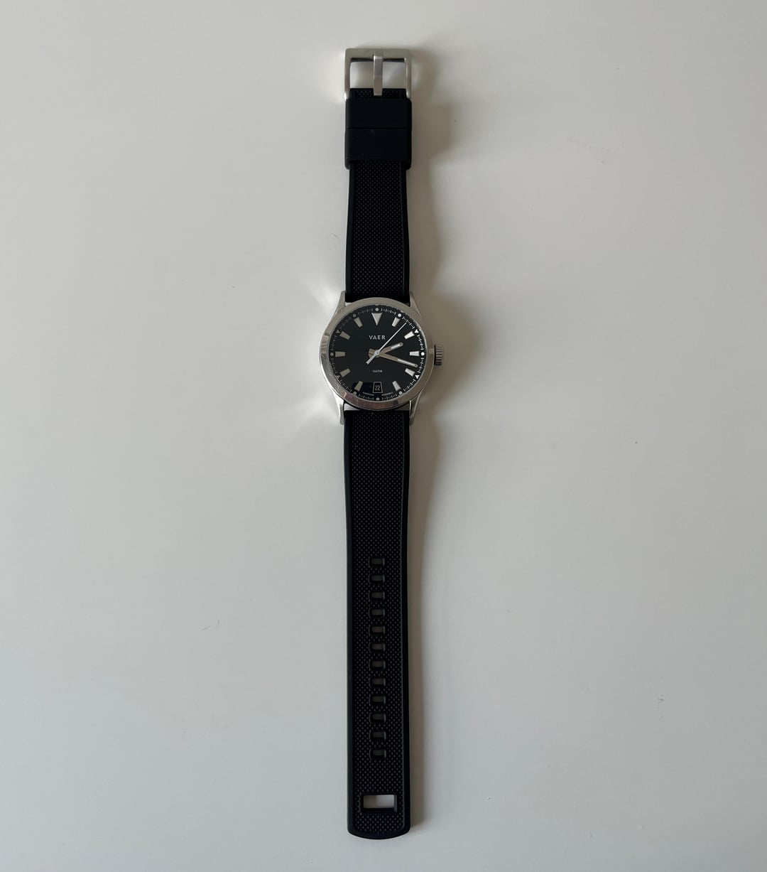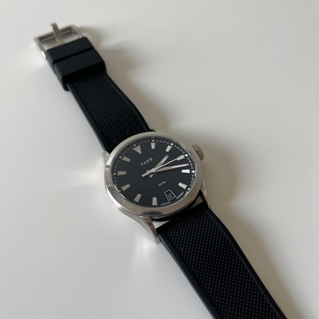 Vaer C3 Atlas quartz watch. Watch: 36mm case, 20mm lug width. Slim case <9mm. Domed sapphire crystal, engraved casebook, black dial with applied markers, date window at 6 with color-matched date wheel. Strap is the standard Vaer silicone “ocean” strap in black. This is watch-only (no box, etc). Condition: sapphire crystal is clean but the polished bezel is nicked up. Strap is nearly new (tried-on only) Asking $110 shipped within the US. Can meet for pickup around LA. Timestamp in photos.