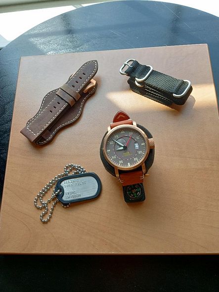 • Strap/Bracelet: 22mm brown leather strap with bronze coated steel tang buckle plus 2 other straps, 1 in black nylon and another in brown leather with white stitching and bronze coated steel tang