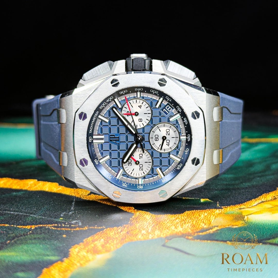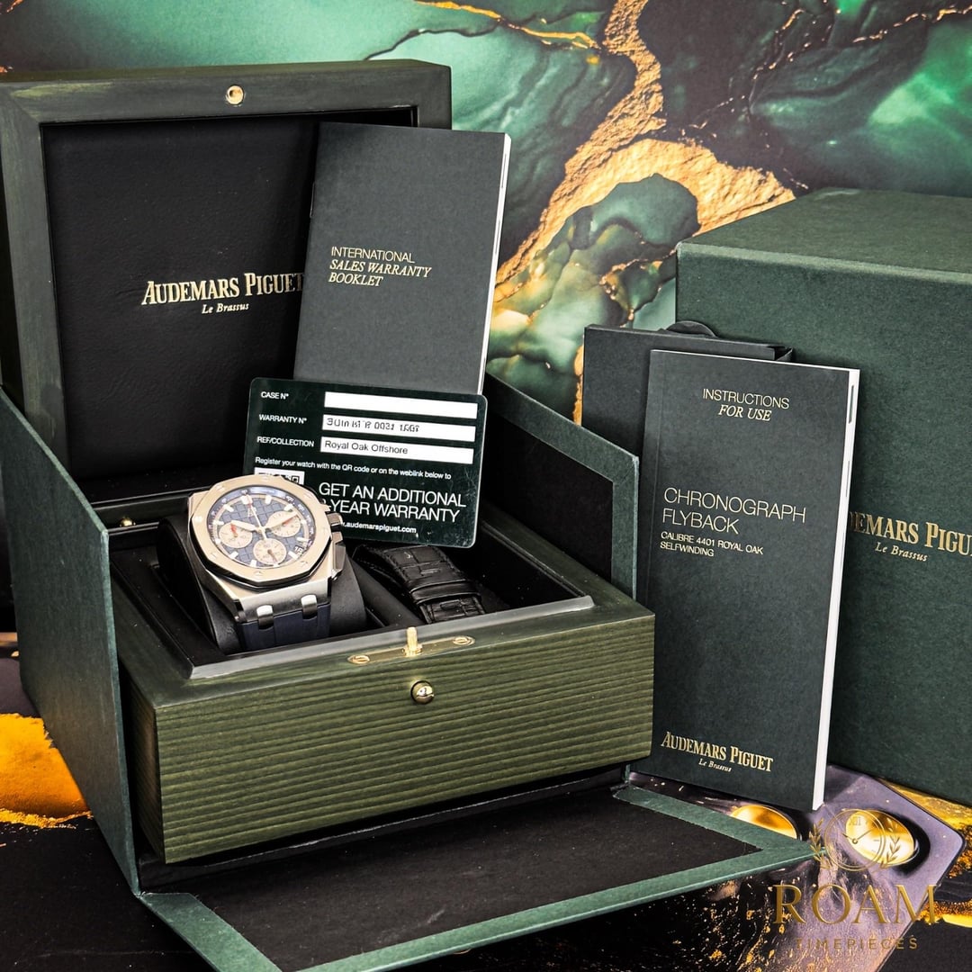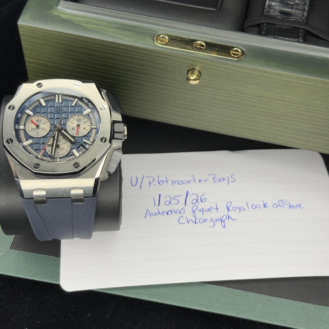 [WTS] Audemars Piguet Royal Oak Offshore Chronograph – Titanium (43mm) Ref: 26420TI.OO.A027CA.01 Price: $31,699 Location: Virginia, USA Shipping: CONUS only AP Royal Oak Offshore Chronograph in Grade 5 titanium with blue Méga Tapisserie dial. Bold wrist presence while remaining lightweight and wearable. Powered by AP’s in-house Calibre 4401 flyback chronograph with ~70 hours of power reserve. Features black ceramic pushers, screw-down crown, 100m water resistance, and AP’s quick-change strap system. Condition: Very good overall condition with light signs of careful wear visible only under close inspection. Unpolished, running properly, and presents extremely well. Warranty: Covered under Audemars Piguet extended warranty. Photos / Serial Note: Photos taken with a macro lens; minor dust may appear. Serial number digitally obscured in images for security. Included (Full Set): • Inner & outer box • Warranty card & booklets • OEM AP rubber strap • Additional OEM strap (as shown) Feel free to message with questions or for additional photos.