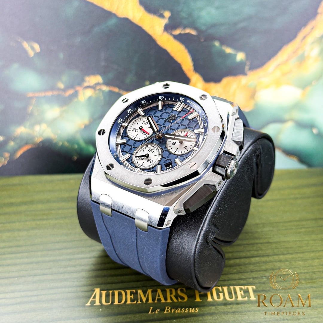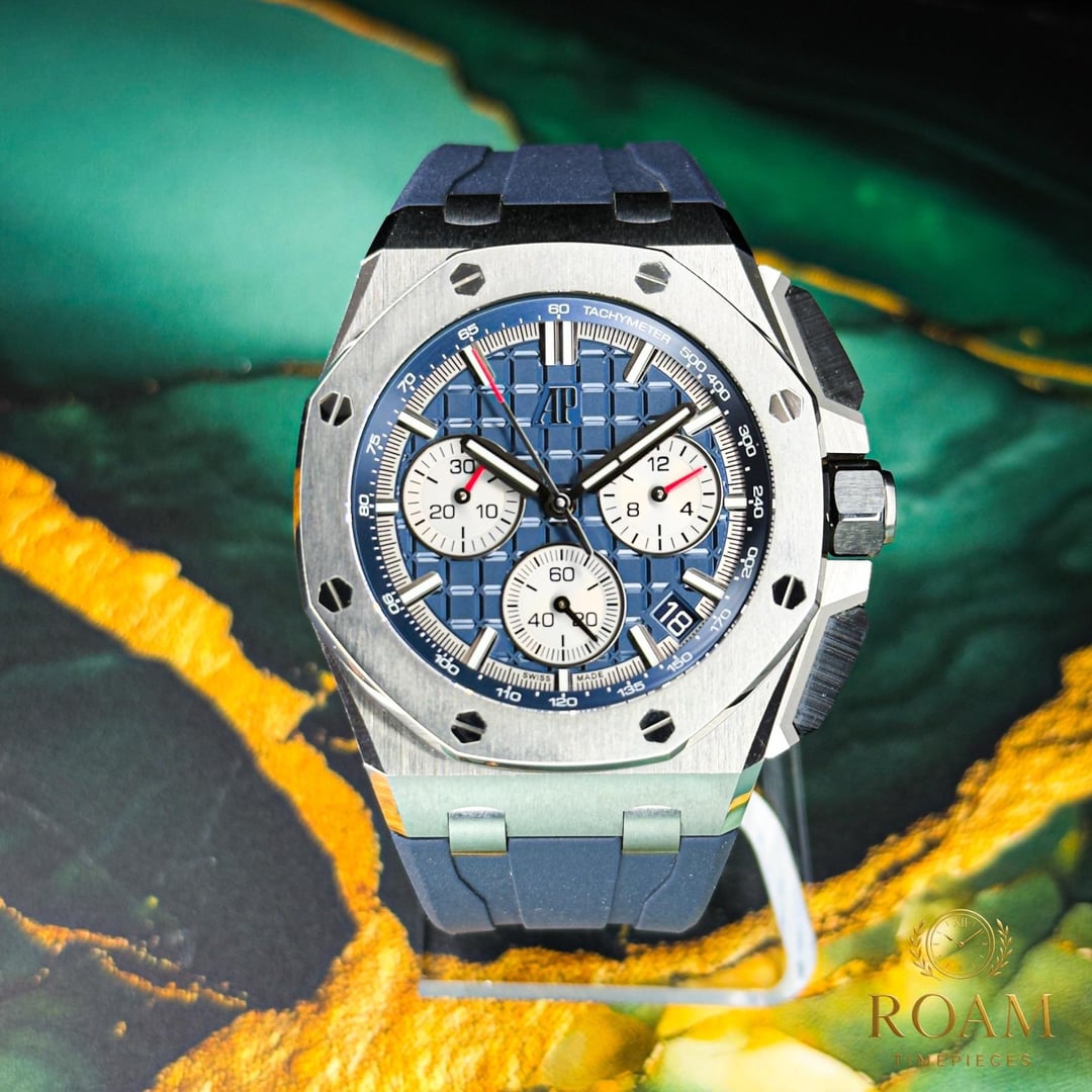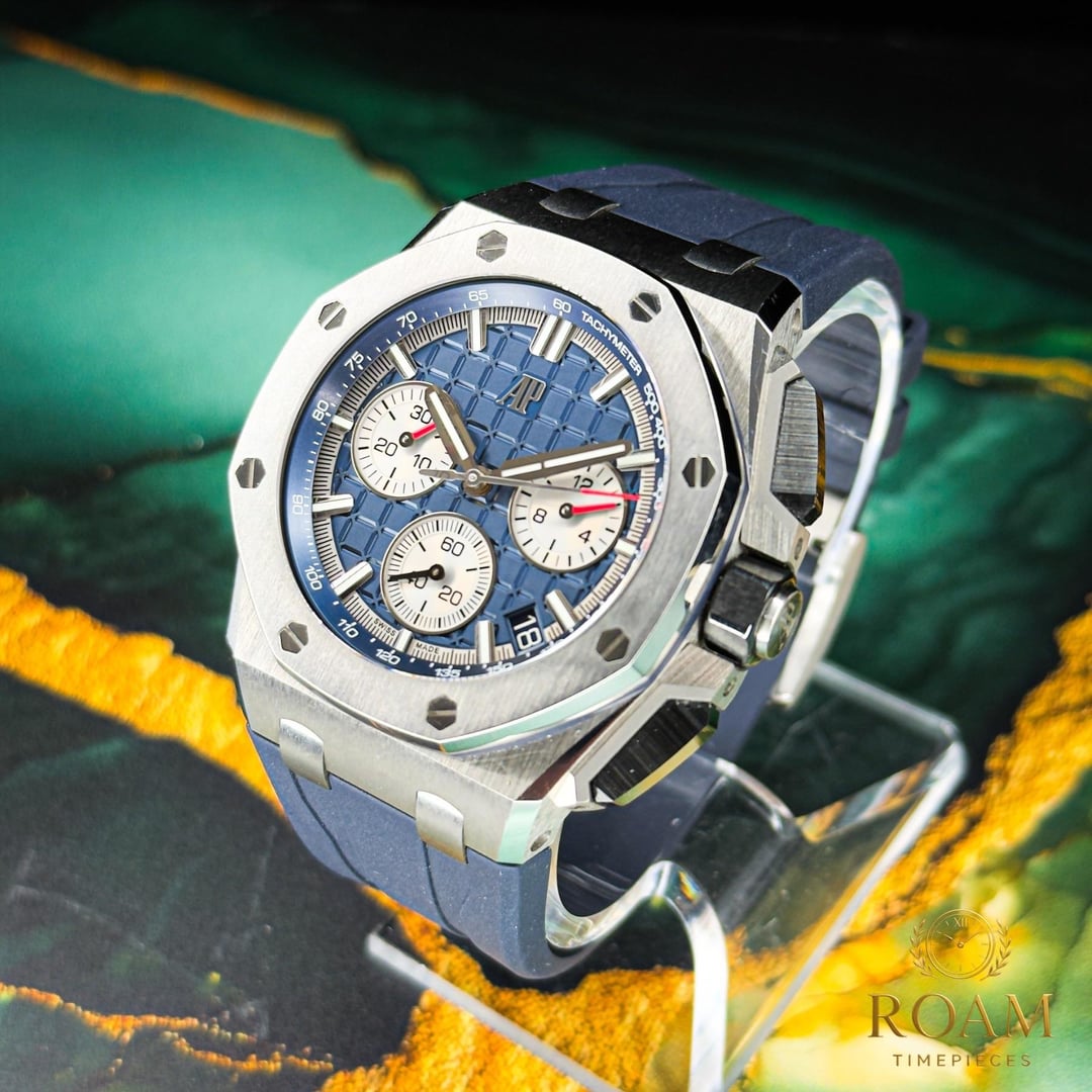 [WTS] Audemars Piguet Royal Oak Offshore Chronograph – Titanium (43mm) Ref: 26420TI.OO.A027CA.01 Price: $31,699 Location: Virginia, USA Shipping: CONUS only AP Royal Oak Offshore Chronograph in Grade 5 titanium with blue Méga Tapisserie dial. Bold wrist presence while remaining lightweight and wearable. Powered by AP’s in-house Calibre 4401 flyback chronograph with ~70 hours of power reserve. Features black ceramic pushers, screw-down crown, 100m water resistance, and AP’s quick-change strap system. Condition: Very good overall condition with light signs of careful wear visible only under close inspection. Unpolished, running properly, and presents extremely well. Warranty: Covered under Audemars Piguet extended warranty. Photos / Serial Note: Photos taken with a macro lens; minor dust may appear. Serial number digitally obscured in images for security. Included (Full Set): • Inner & outer box • Warranty card & booklets • OEM AP rubber strap • Additional OEM strap (as shown) Feel free to message with questions or for additional photos.