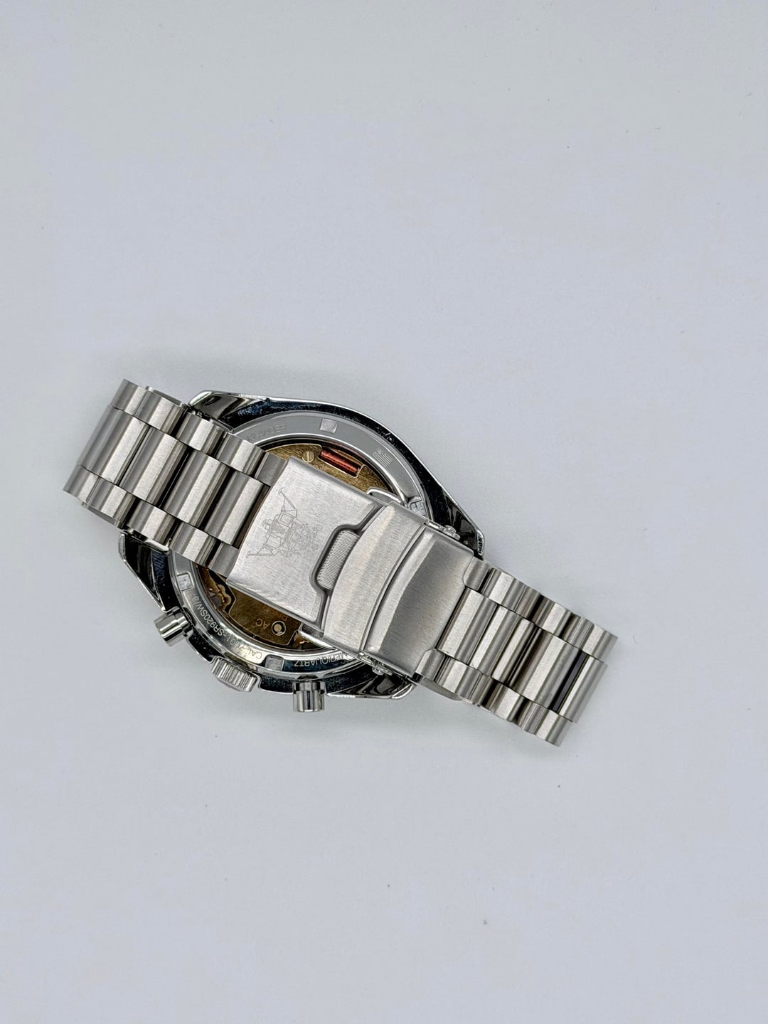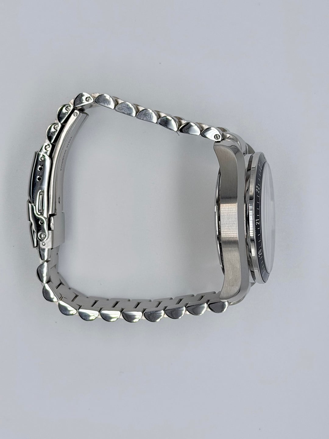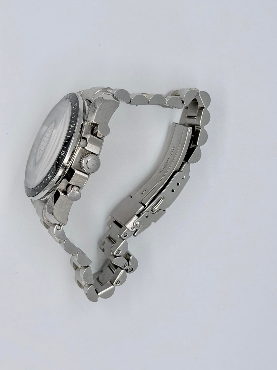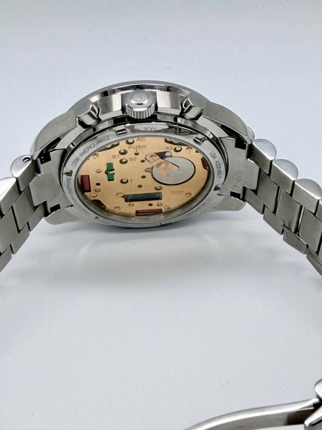 Up for sale is an islander Bethpage ameriquartz chronograph on president style bracelet. Good condition overall. Comes with extra links asking $175 plus shipping Movement: Ameriquartz C701 with 5 Jewels Case: Stainless steel 40mm x 13.5mm, 47mm tip to tip Back: Exhibition caseback Crystal: Domed sapphire with AR underside Band: Stainless steel with deployant clasp, 20mm Water Resistant: 100 meters Weight: 163 grams