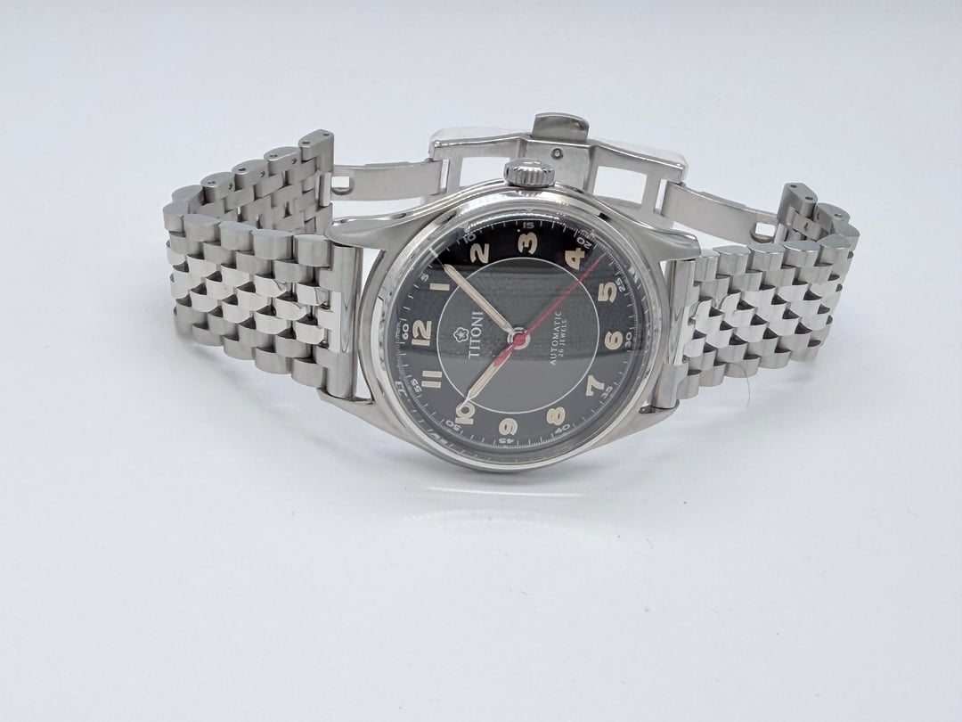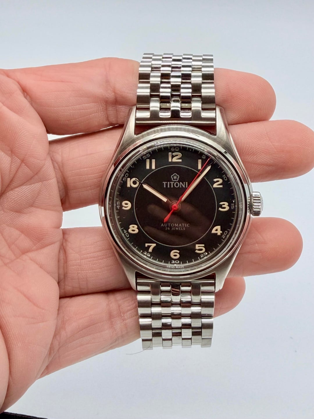 Up for sale is a really special watch. This is a Titoni Heritage sector dial. Introduced as Titoni is reviving their vintage line of watches with modern construction. I have owned hundreds of watches and nothing has surprised me like this piece. I would compare its quality to Tudor (having owned Tudor 1925, bb36, bb54 and bb58). It comes on a buttery jubilee style bracelet. Comes as a full kit. My pictures do not do this watch justice. Only selling as I recently purchased an omega so trying to recoup some funds purchased from exquisite timepieces. Warranty until 1/2027 MSRP $1200 plus taxes and import fees. Asking $775 shipped https://youtu.be/1QwbDbwQJpc?si=x3T6rgJGQZ_M2kRh Movement: Automatic Sellita SW200-1 Function: 3 Hands Case colour: Stainless Steel Glas: Double Curved Sapphire, Antireflective Water resistance: 5 ATM Dial style: Arabic Dial Colour: Anthracite / black mat Bracelet: Stainless Steel