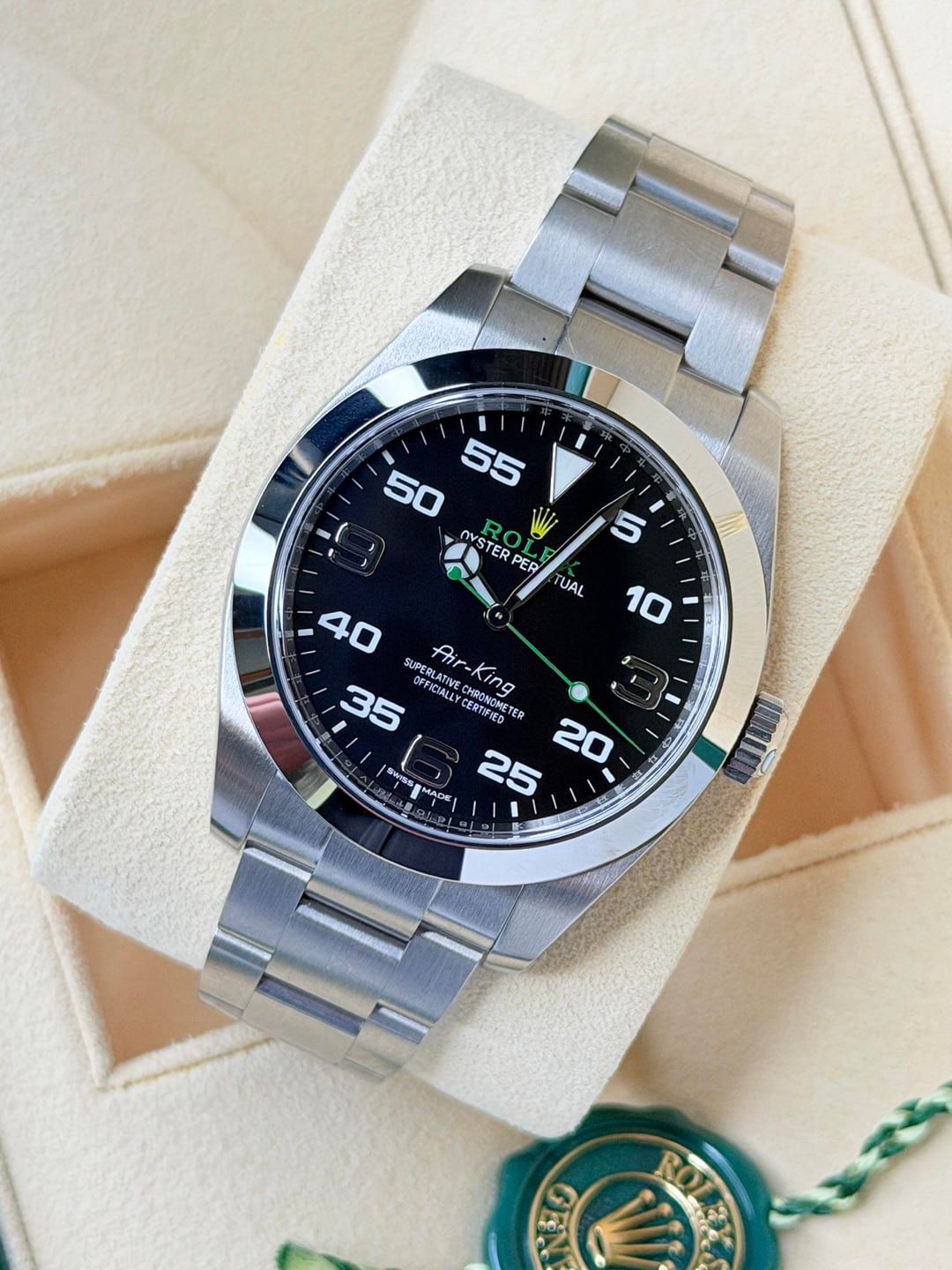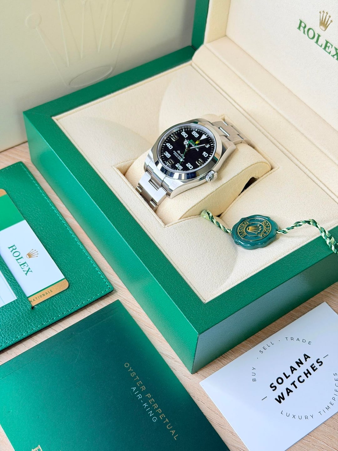 Selling this brand new Rolex Air King reference 116900 . **It comes as a full set**, including the Rolex green box, outer box, manual, warranty instructions, leather wallet, warranty card dated 2019, and the green hangtag. **This Air King is brand new, unworn**. Yes, it is a 2019 watch that’s never been worn. **Photos + Video:** * [Album](https://imgur.com/a/2019-nos-air-king-jan2026-trVBYCw) * [Timestamp](https://i.imgur.com/MWmSPL3.jpeg) * [More on my Instagram](https://www.instagram.com/solanawatches/) **Price is $7,500** shipped in the CONUS. You can also [find me on Instagram @SolanaWatches](https://www.instagram.com/solanawatches/). **I’m a full-time watch dealer** with a private showroom located in Carlsbad, CA. Feel free to **Google “Solana Watches reviews” to see what others have to say about me** and my services. If you are local, don’t hesitate to reach out to schedule an appointment. _All my watches are guaranteed 100% authentic, and I will stand by their authenticity. _ _California buyers without a seller’s permit are subject to sales tax._