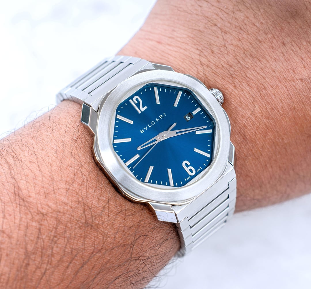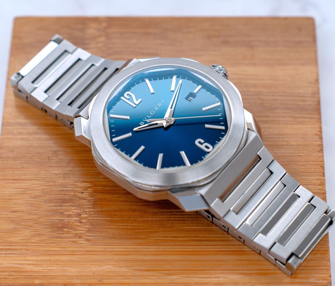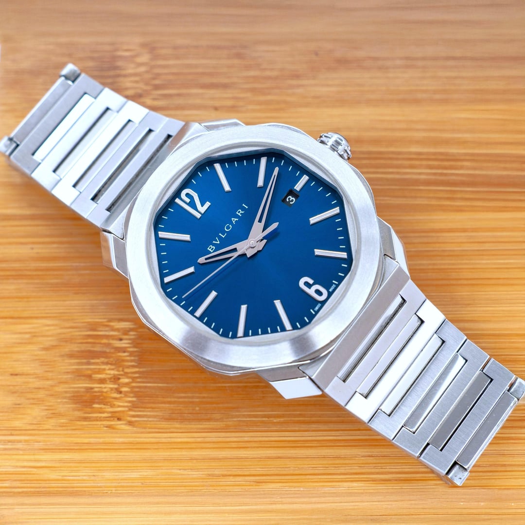 A Bvlgari Octo Roma watch in good condition. Stunning Blue sunburst dial with brushed raised numerals. Iconic design, makes it a conversation piece. The build quality is very high end overall. It’s housing BVL 191 “Solotempo” in house movement. Comes with the original bracelet, signed clasp. Very detailed sharp finishing throughout the case and bracelet. Quick date complication. Amazing condition, ready to be used as a daily driver. Such pieces should be appreciated upfront to experience at full measure, Pictures don't do justice to this beauty. Great collectible. Purchased in MAY 2019. Comes with warranty card. PRICE: $3999 USD via Paypal, Wise, Crypto. FREE 5 day DHL shipping worldwide. Tariffs are covered by me. I have a good number of exchanges here for a safe transaction. Check my Instagram: [https://instagram.com/hour.lust](https://instagram.com/hour.lust) * Reference Number: 102856 * Case size: 41.5 mm (without crown) * Lug to lug: 45.5 mm * Thickness: 10 mm * Movement: Bvlgari In house Automatic calibre BVL 191 “Solotempo” 28800bph Pics: [https://imgur.com/a/O6MJt1a](https://imgur.com/a/O6MJt1a) TS: [https://imgur.com/a/Wqcx9G2](https://imgur.com/a/Wqcx9G2)