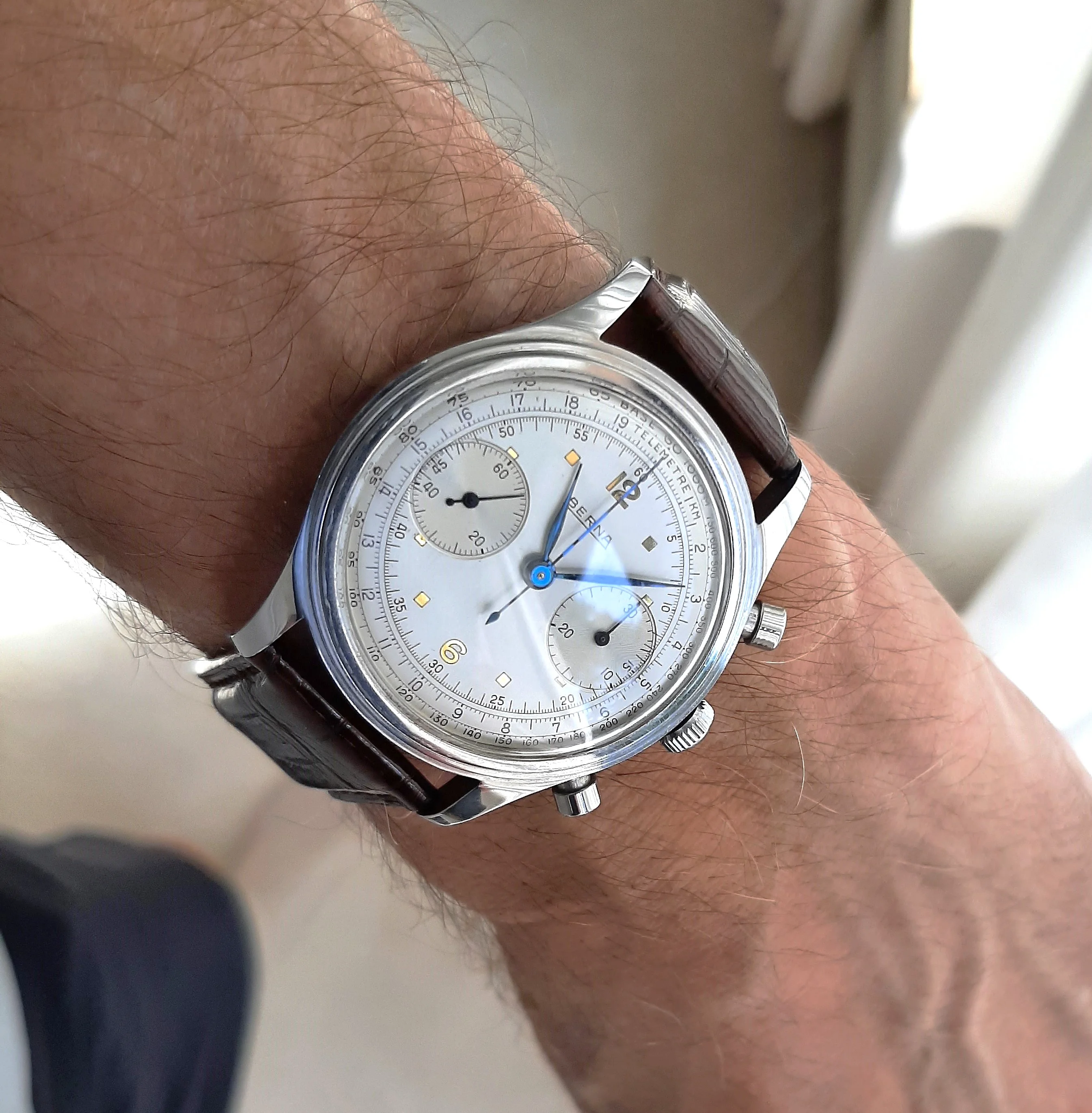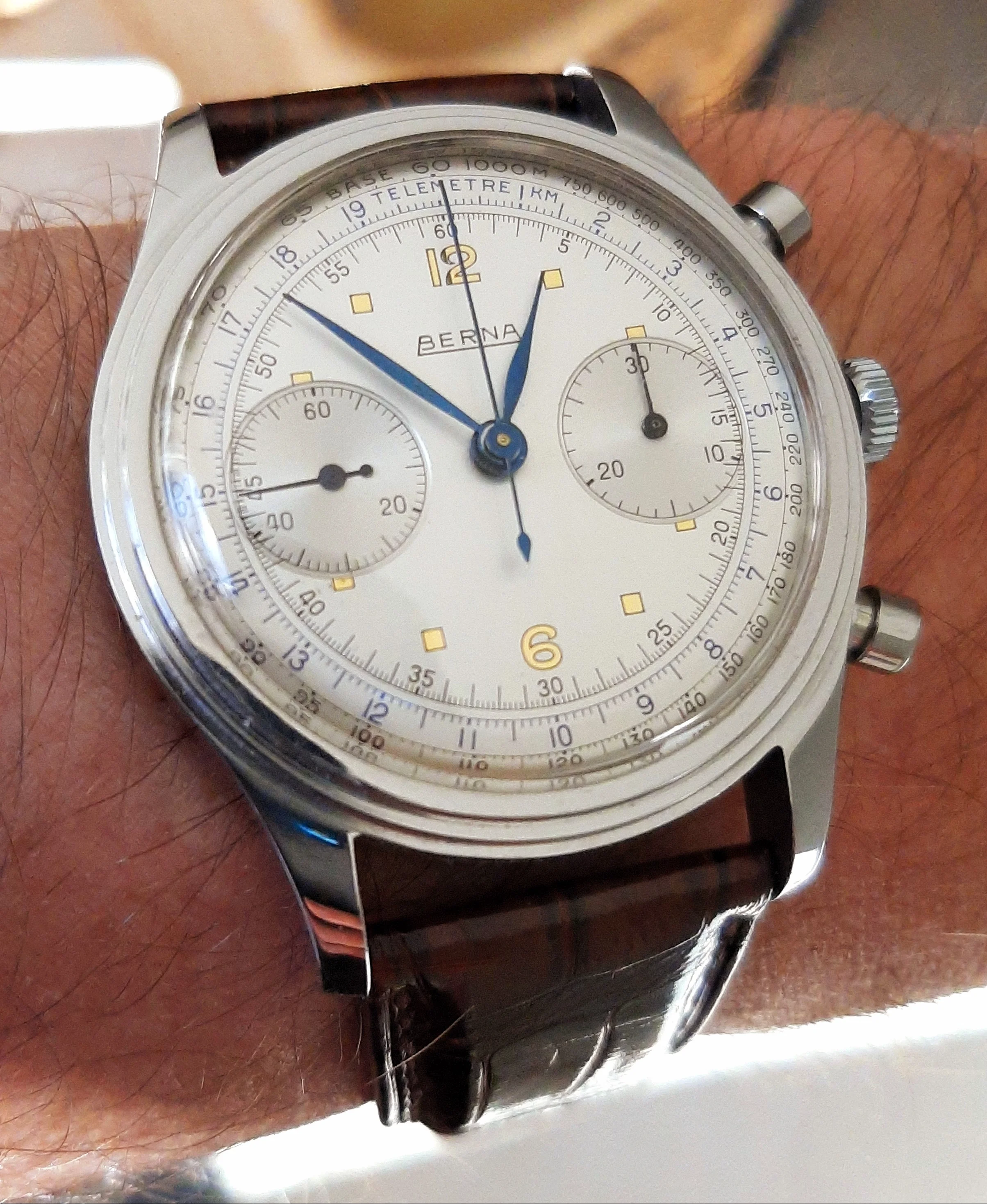 A beautiful classic late 1940`s/50`s style chronograph, fully functional and keeps good time. I have set it running a little fast to fit my wearing routine.
