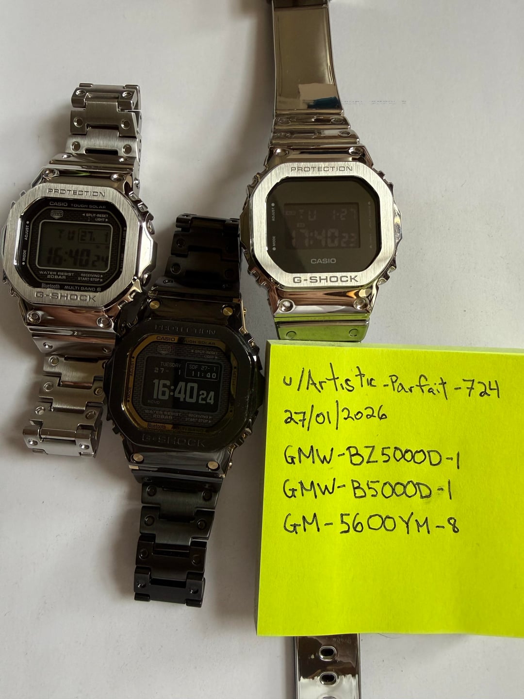Hi everyone, Due to some recent financial and health-related circumstances, I am offering a few of my G-Shock watches for sale. All pieces are in excellent condition and come complete with box, paperwork, and extra links. Condition and details: GMW-BZ5000D-1 and GMW-B5000D-1 were purchased this month after Christmas. Both are in near-mint condition (9.9/10). The BZ5000D has only very light hairline scratches on the clasp. GM-5600YM-8 (Fine Metallic) was purchased around September last year and has been worn fewer than 10 times. All watches have been well cared for and are priced to sell. Shipping and terms: EU shipping only, shipping from Portugal Prices include tracked shipping via CTT Prices are firm, no trades please Both GMW models are sized for a 6.5 in / 16.5 cm wrist Please comment before sending a DM (no exceptions, thank you) Prices: GMW-BZ5000D-1: 550€ GMW-B5000D-1: 360€ GM-5600YM-8: 120€ Payment methods: PayPal F&F, PayPal G&S (buyer adds 3.4%), Wise, or local pickup. Thanks for looking, and feel free to reach out with any questions after commenting. Have a great day. PS: Also willing to jump on a video call and share my LinkedIn contact. ~~Here’s a video of the watches on my wrist (sorry I’m not handy with photography)~~ looks like I can’t add any links to my Google Photo album but please let me know if you want me to send it via DM after your comment.