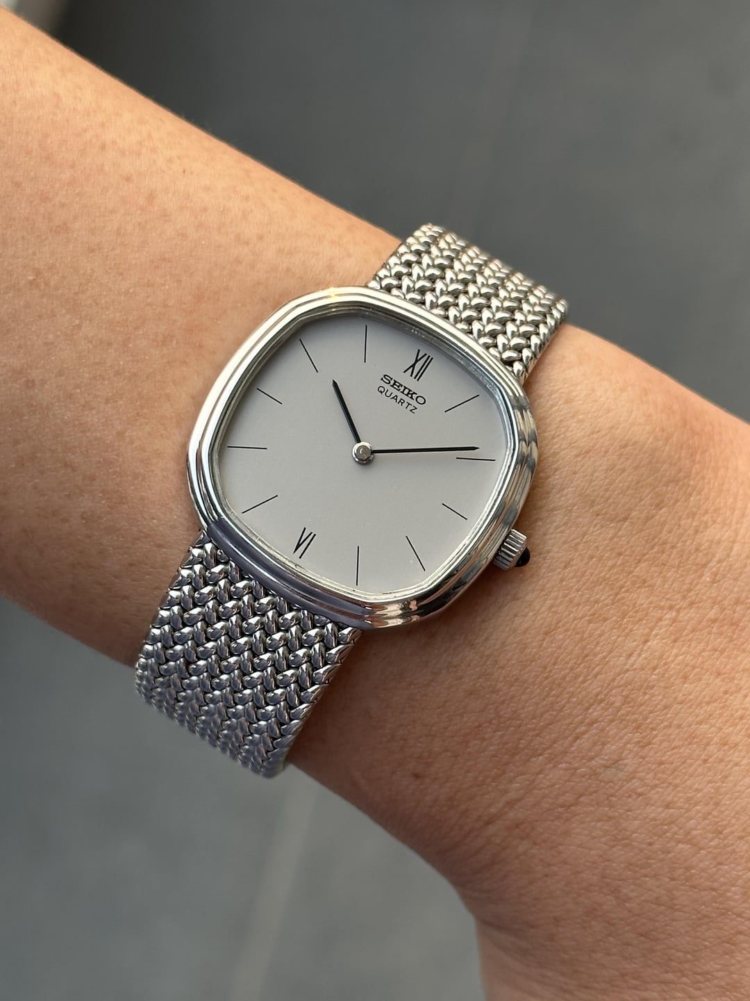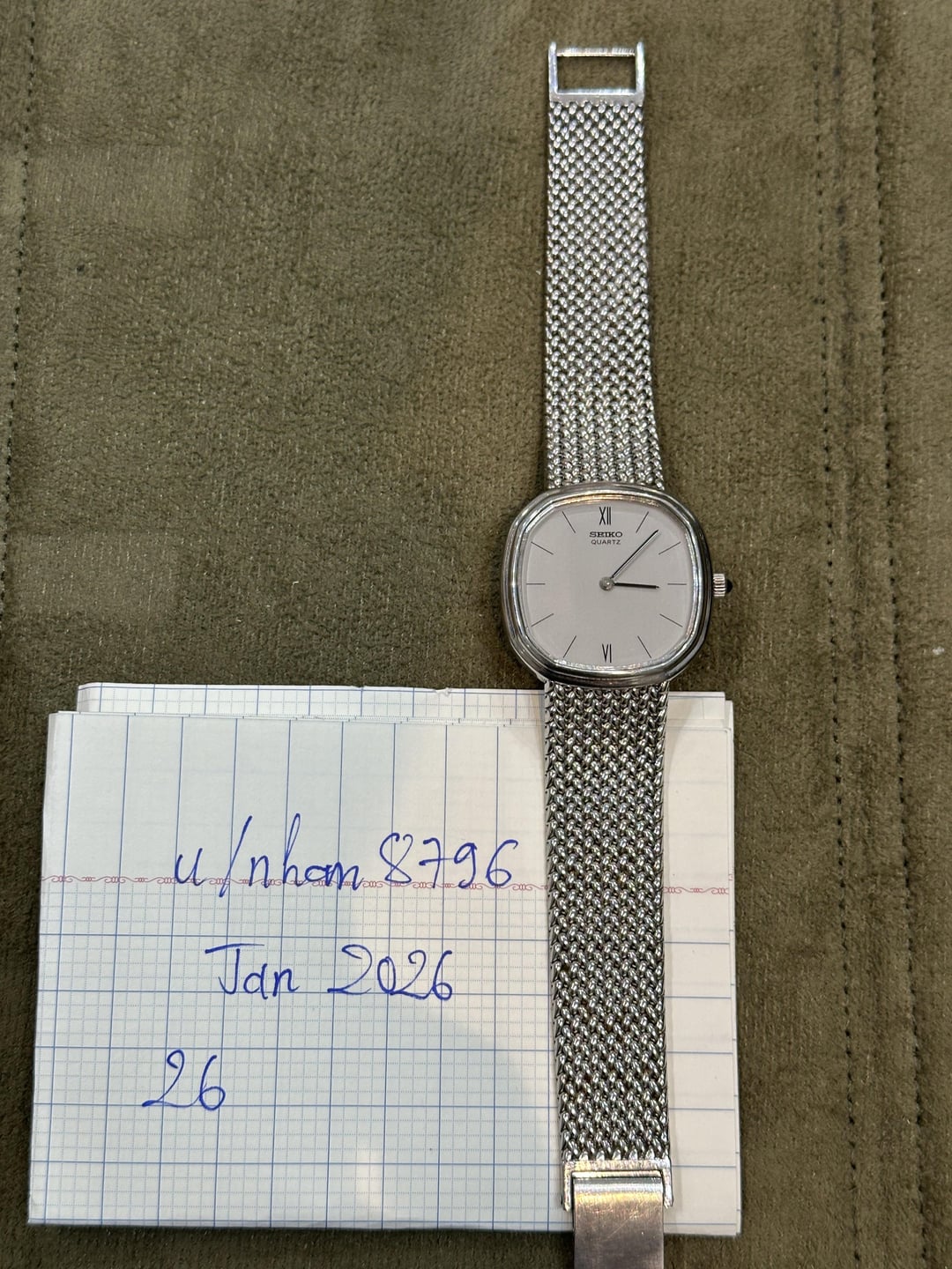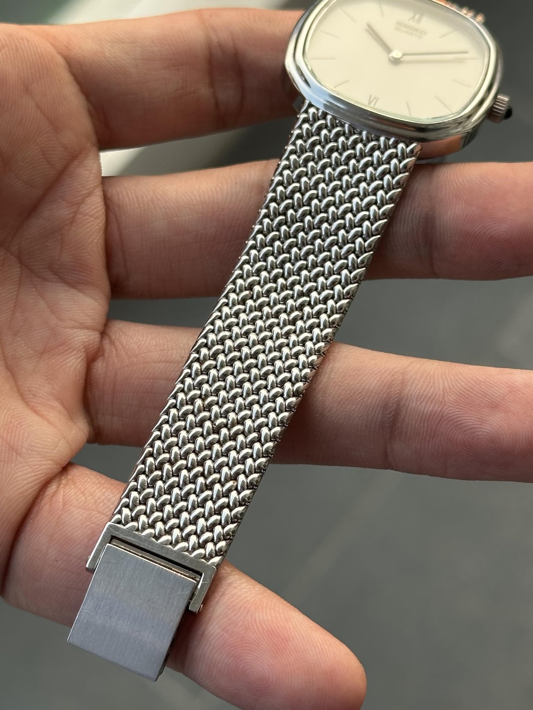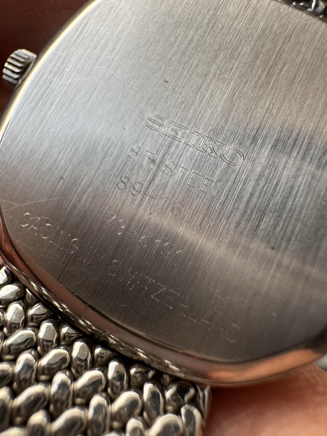For sale is a very uncommon Seiko Quartz ref. 78-5191, part of a short-lived series where Seiko had the cases and bracelets machined and assembled in Switzerland, using Seiko’s own quartz movement. This example was produced at Gérald Genta’s Swiss workshop, which explains the distinctive case shape, integrated bracelet construction, and hand-finished details that differ noticeably from standard Japan-made Seiko models of the era. The watch is completely original and in excellent condition. Details: • Reference: Seiko 78-5191 • Movement: Seiko quartz cal. 7820A • Case: Stainless steel, Swiss-made • Assembly: Switzerland • Crystal: Sapphire • Dial: Original, clean, untouched • Bracelet: Original integrated Swiss-made bracelet • Caseback & bracelet engravings: Hand-engraved • Size: 32 x 32mm Condition: • All original • Dial is very clean • Case and bracelet show light, honest wear • Movement runs properly This is not a common Seiko and rarely shows up in this condition, especially with the original bracelet intact. Price: $599 (Includes shipping, serviced, and tariff covered) Shipping: Worldwide via UPS/DHL Payment: PayPal F&F or G&S (+4.5% paid by buyer) No trades at this time Feel free to ask any questions