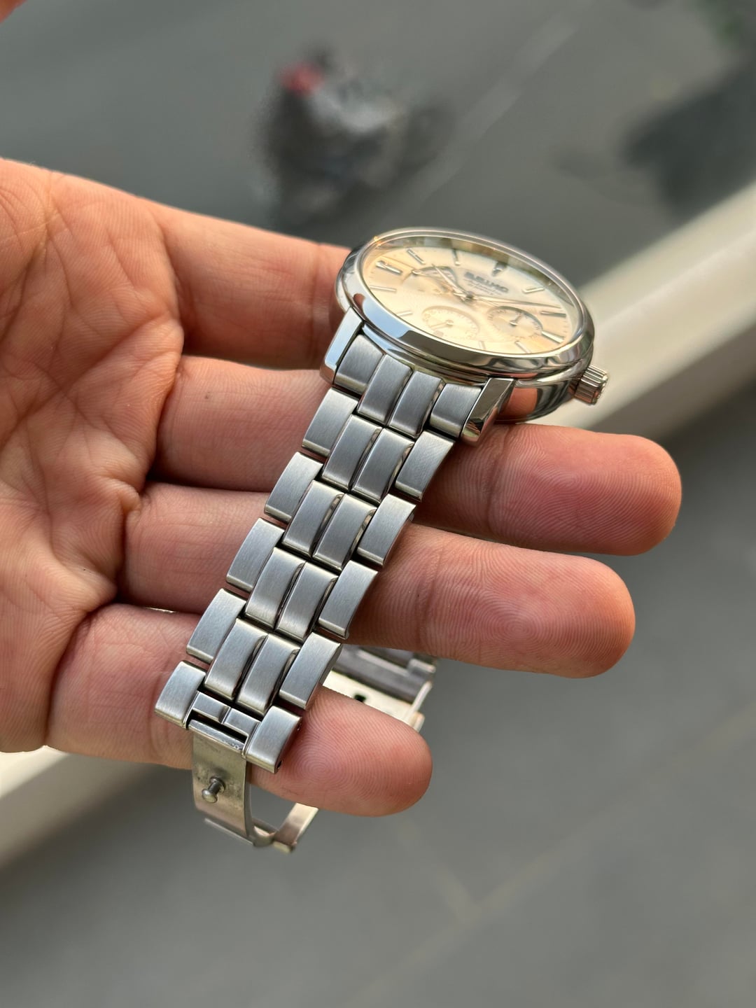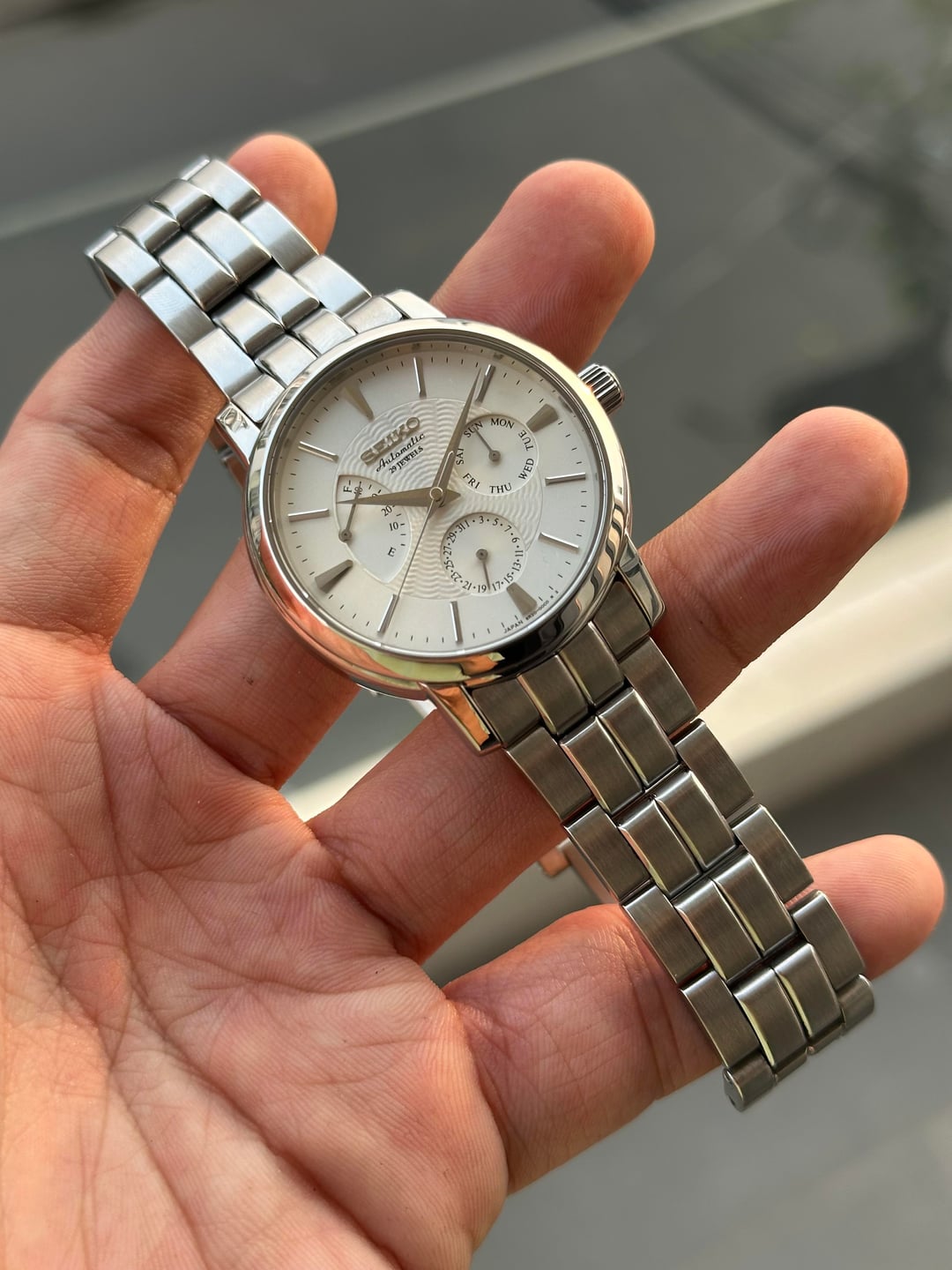 Hello, up for sale is my Seiko SARC001. Released in 2006, the SARC001 stands out for its highly textured dial with concentric ripple patterns that catch the light beautifully. The multi-layered surface gives strong depth and character, paired with faceted, highly polished hour markers that reflect light from different angles. The solid (closed-tip) central seconds hand adds a distinctive touch, complementing the overall refined and technical look of the dial. Movement - Seiko 6R20 hi-beat automatic, 28’800vph, power reserve ~45 hours, 29 jewels - 6-hand layout with day, date, and power reserve display - Recently serviced and running properly - Observed accuracy: approx. -24 sec/day Condition - Excellent condition overall - Dial, hands, and crystal remain clean Bracelet / Accessories - Original bracelet with 11 links, fits approx. 18cm wrist - Includes Seiko box - No papers Specs - Case width: 39.0mm - Lug-to-lug: 46mm - Thickness: 11.5mm Timestamp & timegraph: https://drive.google.com/drive/folders/1HX-3wNLwl5dXubXKFmdpOZS52dz94_1B - Price: $699 (Includes shipping and tariff covered) - Shipping: Worldwide via UPS/DHL - Payment: PayPal F&F or G&S (+4.6% paid by buyer) - No trades at this time - Feel free to ask any questions!