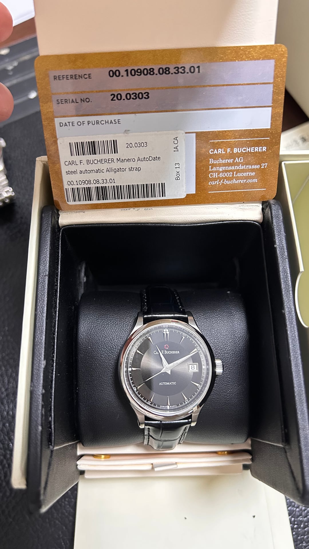 Up for sale is the Carl F. Bucherer Manero AutoDate 38mm Full Set. It comes with the original CFB box and warranty card. No instruction manual. It is fully functional and running at +6 seconds per day. ***The authenticity is 100% guaranteed – the watch has been thoroughly inspected and authenticated prior to listing. Feel free to check out my website*** **Tonneau Atelier** ***in my profile.*** Reference Number: 00.10908.08.33.01. Price: $1599. Payment via PayPal or Wise is preferred. No trades please! Watch is in Chongqing (known as the Cyberpunk City), China. I will pay the customs duties or tariffs for buyers located in United States. Watches will be shipped via FedEx, which delivers to your doorstep in just four days. Worldwide shipping and I am willing to ship this watch anywhere with buyers paying for the shipping. If you really love this watch and pay fast, I will offer free shipping! Feel free to ask for any custom timestamps or videos, I am happy to send them. Please don't hesitate to ask me any questions, thank you! I am able to source all kinds of Carl F. Bucherer watches, please feel free to PM me! Timestamp: [https://imgur.com/a/JMS56mw](https://imgur.com/a/JMS56mw)