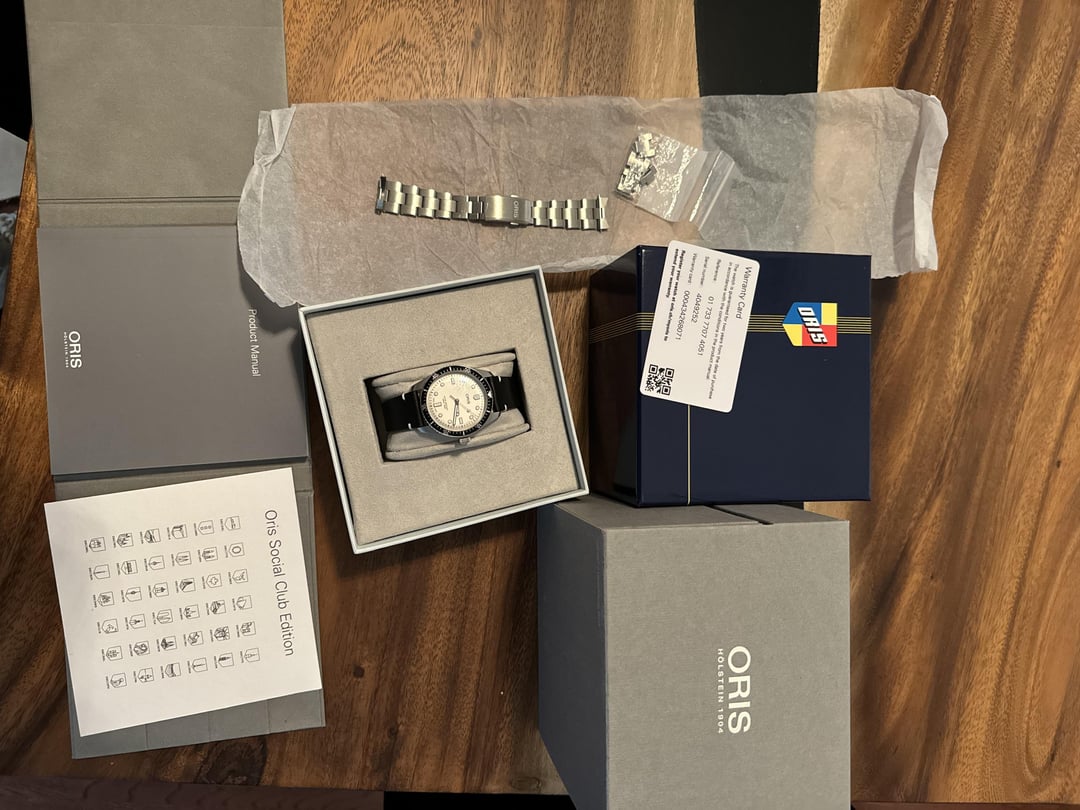 Selling my Oris Divers 65. This model is the “Divers Social Club” special edition for the US. It has a 40mm and no date, which makes it my favorite of all of the Diver 65s. This watch does not originally come with the bracelet but I will include it for a package price of $1050. Thanks!