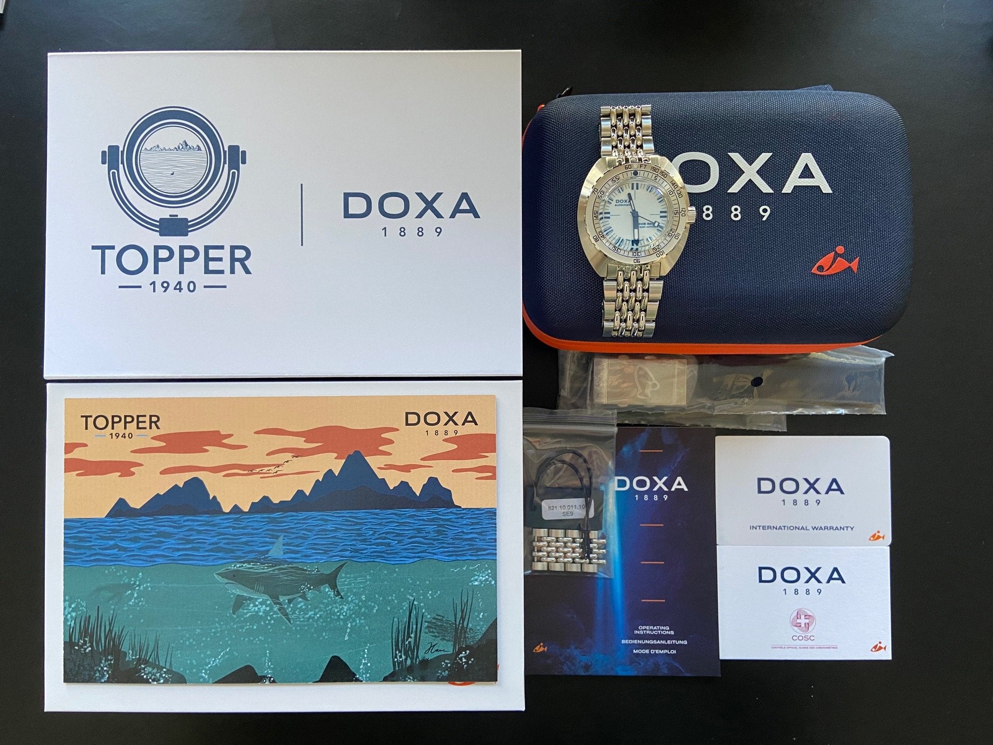 FS: Toppers Doxa Sub300 Great White Limited Edition of 100. The Sub 300 has a unique all lumed, no date dial and comes complete with unworn rubber strap, warranty and COSC cards, artwork, and fabric watch case. I'm the original owner and there are no issues with the watch; just a catch and release onto the next watch. Price is $2,850 shipped CONUS. No trades please.