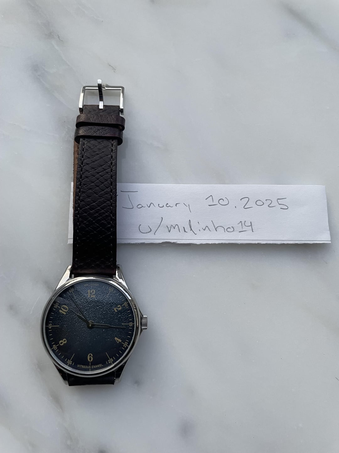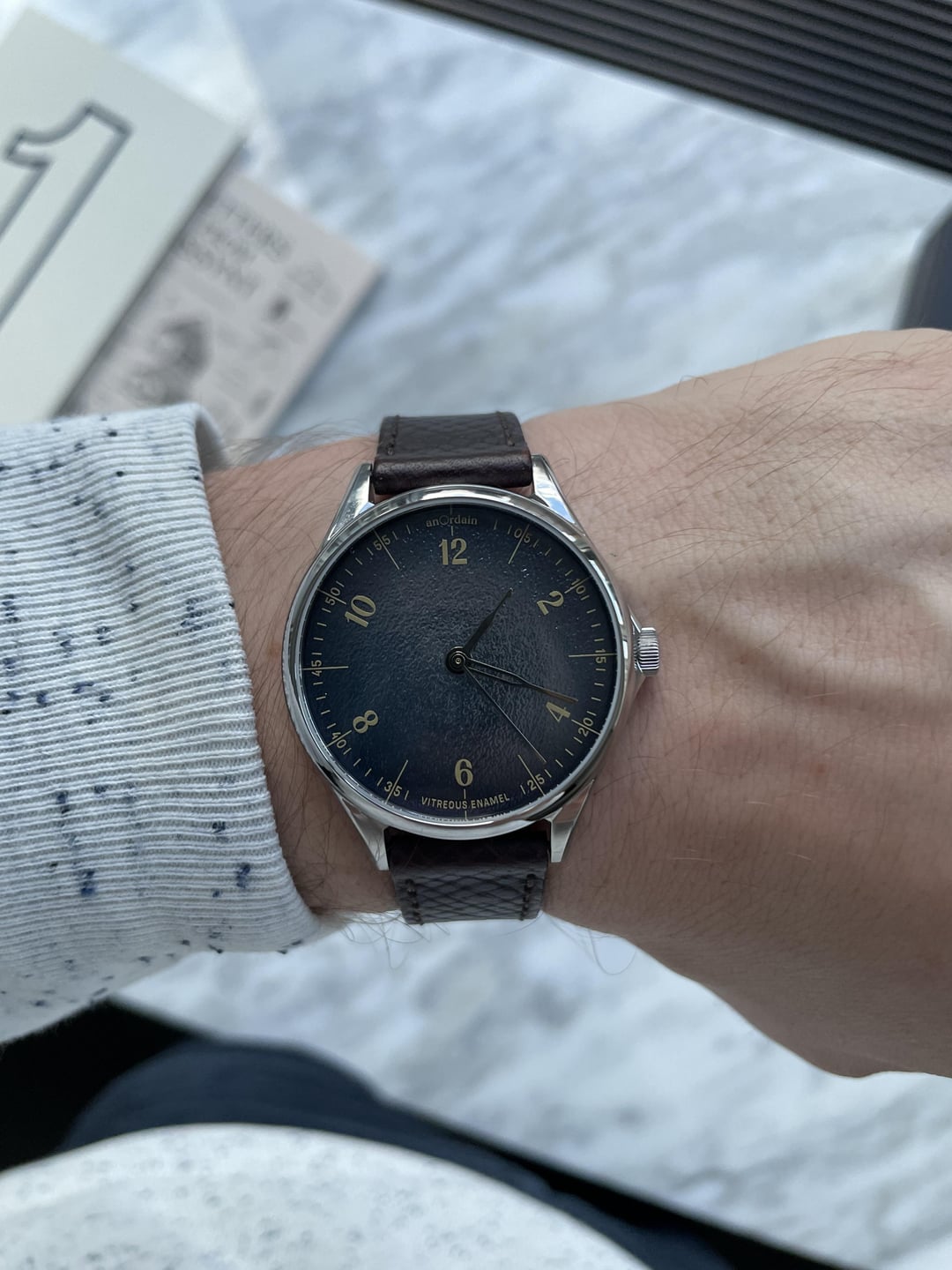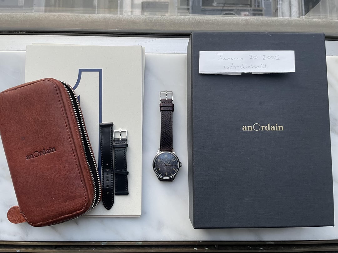 Hi fam, I am looking to sell my anordain Model 1 Fumé Payne’s Grey. I am a little surprised to write this given I waited over two years to get the watch but I’ve only worn it about half a dozen times over the past nine months and can’t justify keeping it. The dial is truly a thing of beauty. It’s often grey/blue, though there are moments when it has more of a purple hue and others where there are flecks of gold. When you wear it, it’s hard to take your eyes off it. Specs are below. Condition is excellent and it comes with box, papers and all that jazz (blacked out serial number in photo, but that’s not how it is in real life). Also includes two OEM straps — black shell cordovan and burgundy Russian hatch bovine. Both have quick release spring bars and fit a medium sized wrist (~7-7.5 inches). Happy to answer any questions or to FaceTime. Price: ~~$4,500~~ $3950 Shipping: CONUS (paid + insurance) Case diameter: 38mm Lug to lug length: 46mm Case depth: 11mm Case finish: Polished Strap width: 18mm Dial: Vitreous enamel on silver Movement: Sellita SW210 (handwound) Glass: Sapphire with 6 layers of anti-reflective coating Hands: Made in-house and individually thermally treated by hand Case back: Solid screw-in Waterproof: 5ATM Warranty: 4 years left