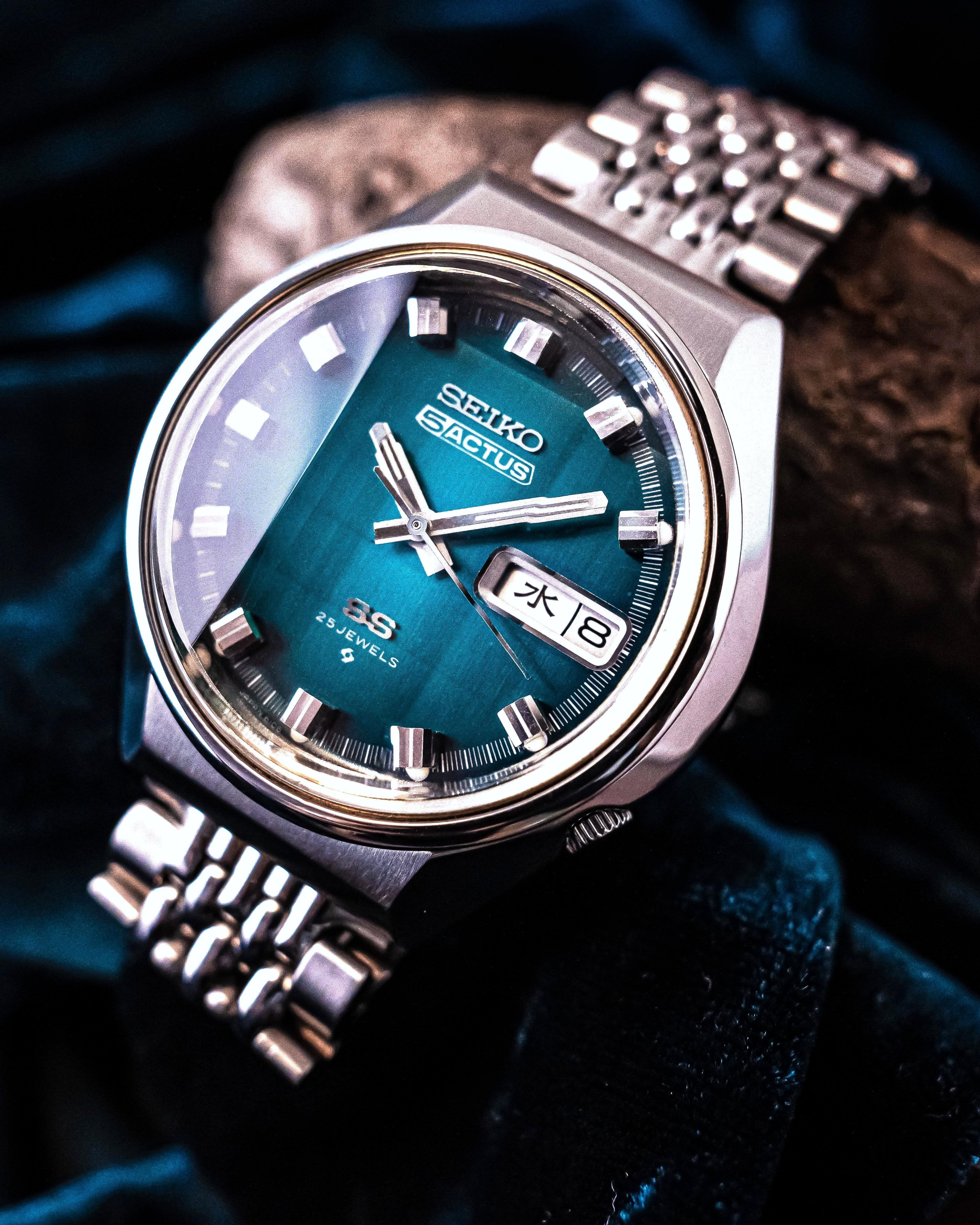 A very rare Seiko Actus watch in great condition. Stunning Turquoise Blue sunburst dial. Raised Faceted indexes make the dial pop. Beefy solid cushion case. Movement has been serviced. Good time keeping. Faceted unique Crystal gives it a retro vibe. Amazing condition at 52 year old, ready to be used as a daily driver. Oversized watch of its era being 37 mm. Such pieces should be appreciated upfront to experience at full measure, pictures don't do justice to this piece. Sunlight brings out most of its beauty. They were designed to have premium build quality but for only regions of Japan. Paired with an aftermarket Beads of rice (BOR) bracelet ,unsigned clasp. Handling it, I can definitely guarantee this is superior to modern watches of the same price zone. A good Collectors piece. Case is professionally polished keeping all the sharp brushed lines, edges and mirror finishing. The Kanji(Japanese) date highly complements the dial. It has both English and Japanese (Kanji) day options. Crown perfectly blends into case. Turquoise blue dials are highly sought after in seiko world, so this is a great investment piece as well. They're only released in Japan, JDM model.