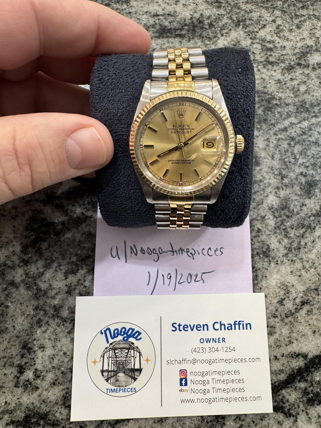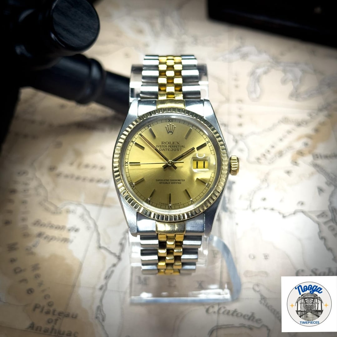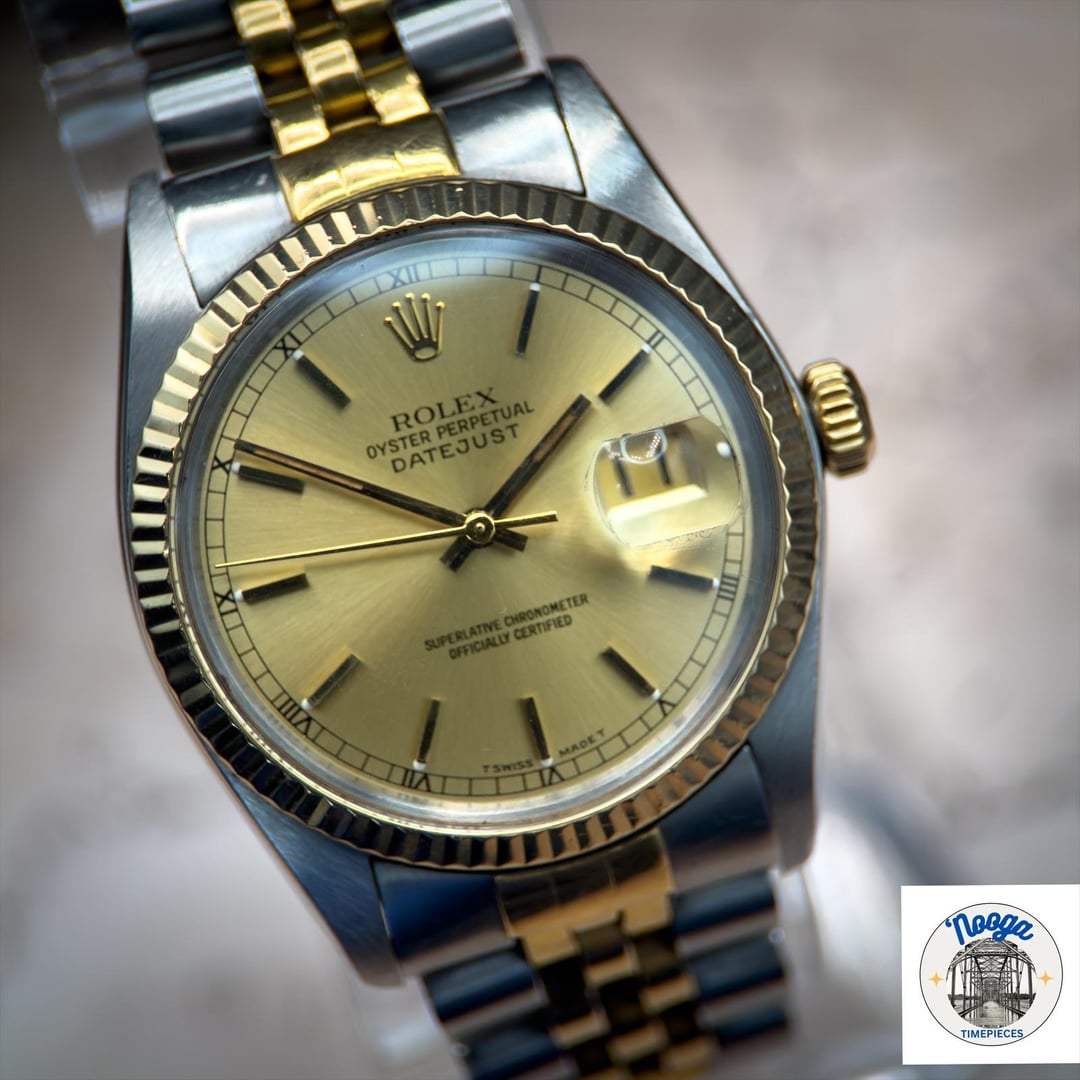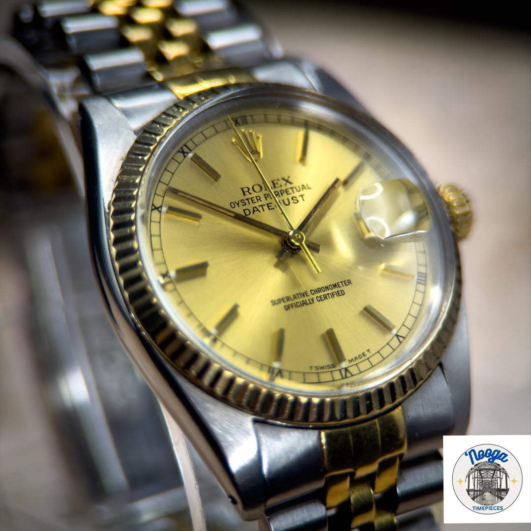 Available now is this excellent Rlx DJ 16013 from 1984. Get this today for 💲4️⃣4️⃣5️⃣0️⃣ shipped in the US. Below are the features. • Model: Rlx DJ 16013 • Movement: Rlx Calibre 3035 (automatic movement with quickset date) • Case: 36mm stainless steel with 18k yellow gold fluted bezel • Bezel: 18k yellow gold, fluted design • Dial: Silver dial with applied hour markers and luminous hands • Hands: Gold-tone hands with luminescent coating • Crystal: Acrylic crystal with Cyclops lens over the date • Water Resistance: 100 meters (330 feet) Vintage • Bracelet: Two-tone (Rolesor) stainless steel and 18k yellow gold Jubilee bracelet with a folding clasp • Functions: Time, date display at 3 o’clock (quickset), power reserve of approximately 48 hours • Special Features: Classic two-tone design with champagne dial, iconic fluted bezel, versatile and elegant for both formal and casual occasions This watch comes as a watch only, with small marks, light scratches from wear on the clasp, case sides and bottoms of the lugs. Crystal is clean with barely noticeable marks. Bracelet fits a 7.25”wrist comfortably. It is available for 💲4️⃣4️⃣5️⃣0️⃣ shipped in the US Overnight.
