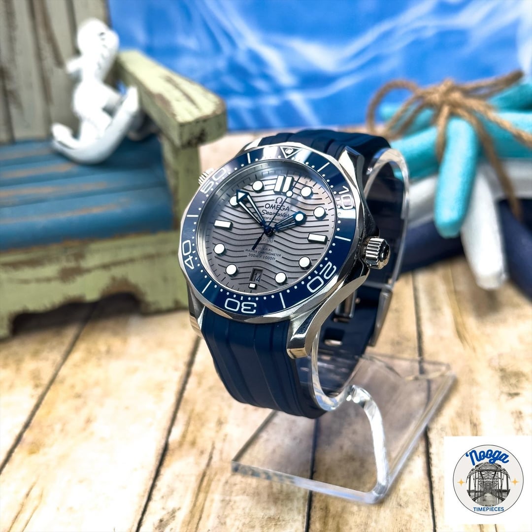 For your consideration is this beautiful OMG Seamaster 300 Diver. This is a full set from 2021 available for 💲3️⃣6️⃣7️⃣5️⃣ shipped in the US. • Model: OMg Seamaster Diver 300M 210.32.42.20.06.001 • Movement: OMG Calibre 8800 (Master Chronometer-certified automatic movement, resistant to magnetic fields up to 15,000 gauss) • Case: 42mm stainless steel • Bezel: Unidirectional rotating bezel with blue ceramic insert and white enamel diving scale • Dial: Brushed gray ceramic dial with laser-engraved wave pattern, blue accents, and applied indices filled with Super-LumiNova • Hands: Blue skeletonized hands with luminescent coating for enhanced visibility • Crystal: Domed sapphire crystal with anti-reflective coating on both sides • Water Resistance: 300 meters (1000 feet) • Bracelet: Blue rubber strap with a stainless steel pin buckle • Functions: Time, date display at 6 o’clock, helium escape valve at 10 o’clock, power reserve of 55 hours • Special Features: Unique gray wave-pattern dial, durable ceramic and enamel components, high precision Master Chronometer movement, modern design with professional diving functionality This set comes with inner and outer boxes. Warranty Card, Pictogram Card, and Master Chronometer card along with the wallet and operating manual. Included is the white hang tag and microfiber cloth and Forstner Bracelet. Pick this up today for 💲3️⃣6️⃣7️⃣5️⃣ shipped in the US. Tn Residents add sales tax. Follow us IG @noogatimepieces FB @Nooga Timepieces www.NoogaTimepieces.com