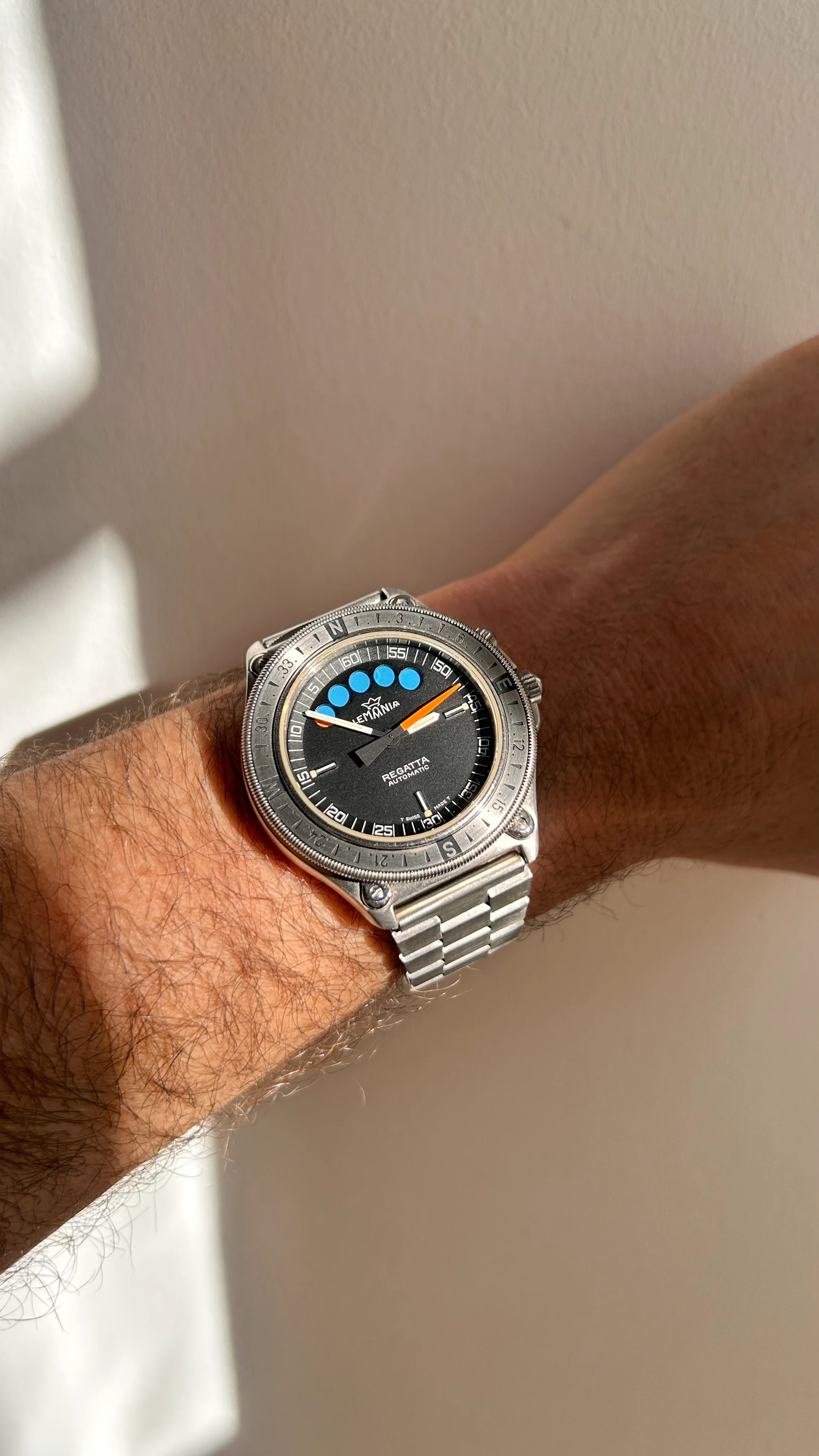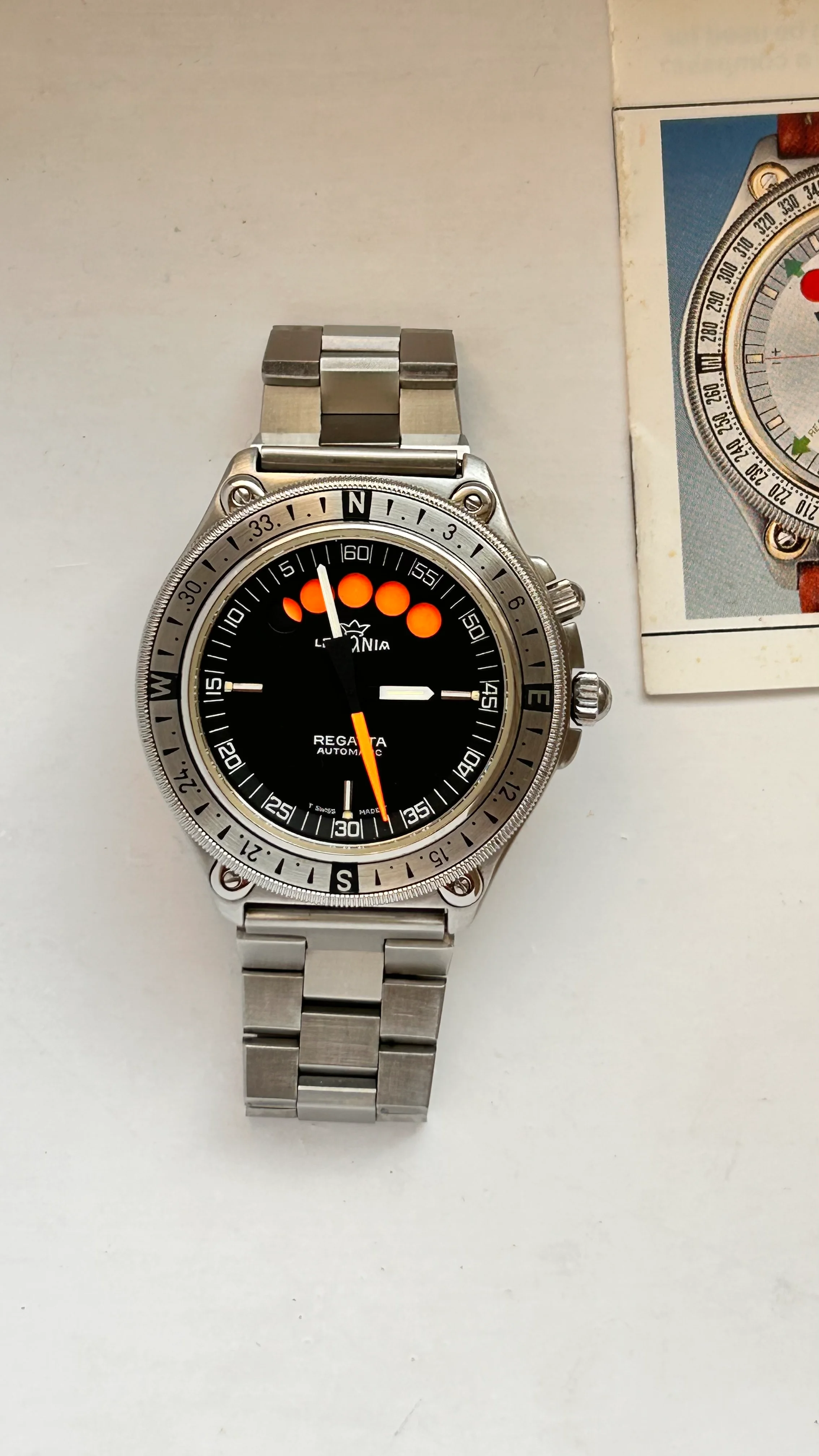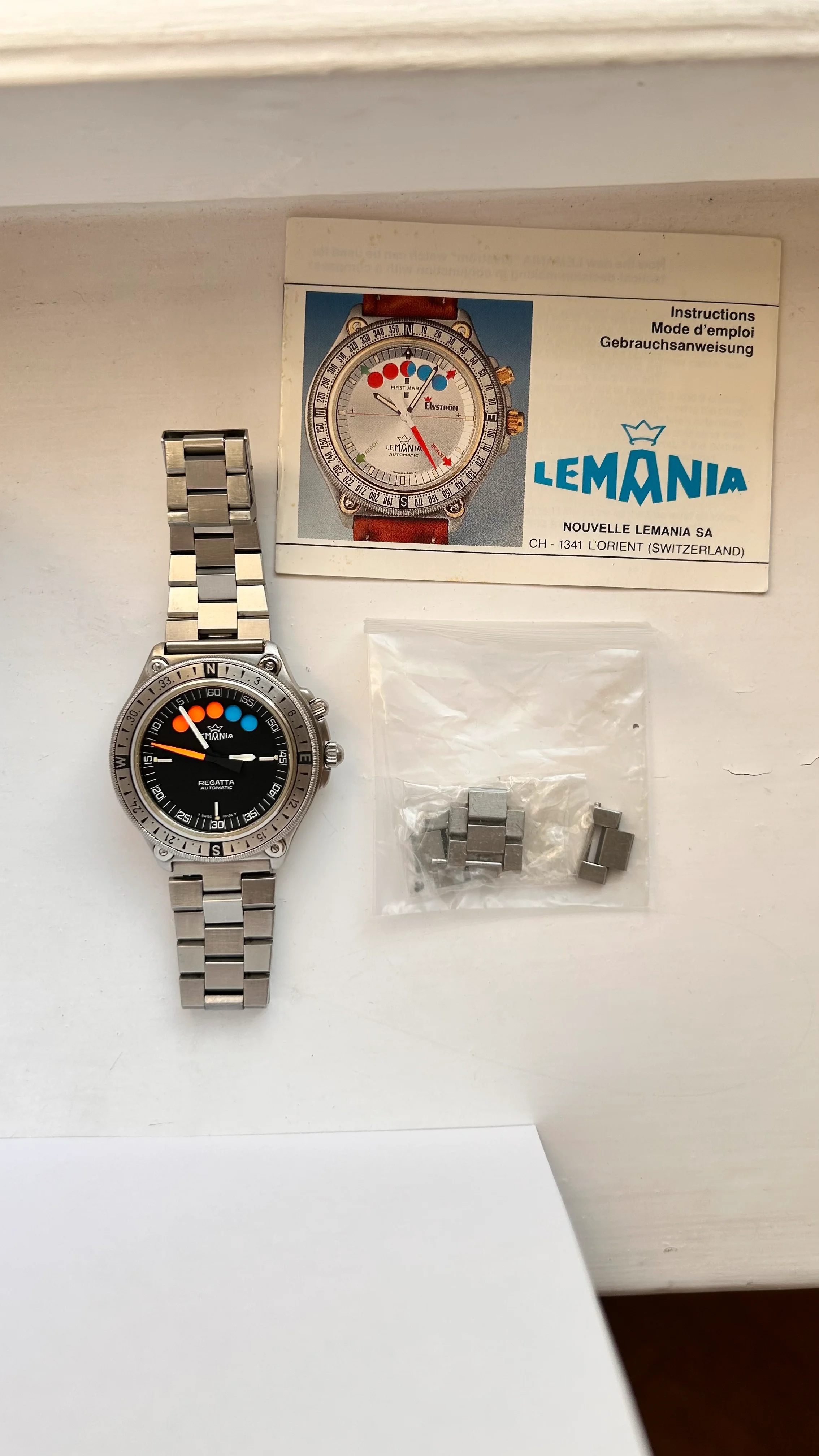 For sale is my stainless steel Lemania Regatta Chrono on its Lemania-bracelet.