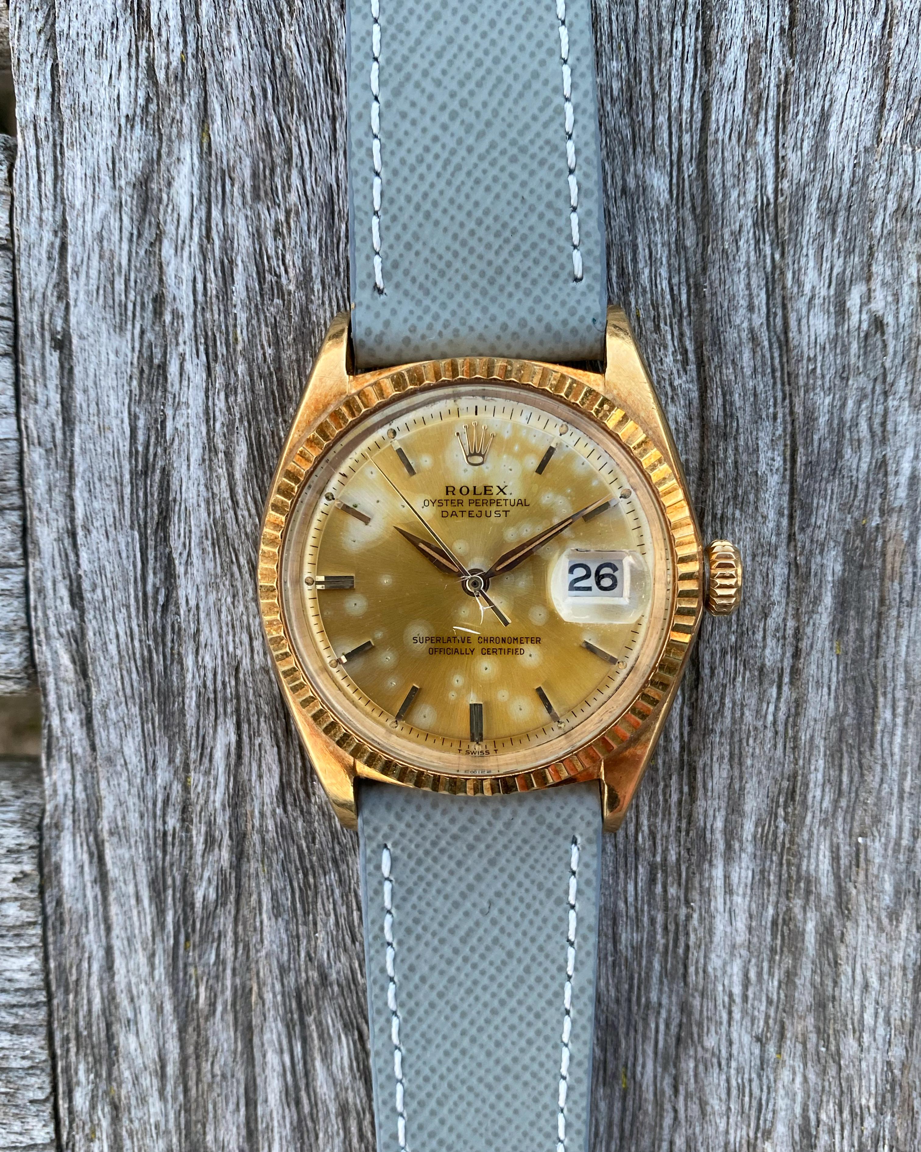 The Rolex features a yellow gold case and fluted gold bezel, which have acquired a lovely, even, ‘rosy’ colored oxidation with age. The Datejust is mounted on an unworn, quick-release, Light Gray Saffiano leather strap from Hide & Alloy, secured by a tang buckle. The Rolex retains its original Pie-Pan dial and gold “Dauphine” hands. The Pie-Pan dial has developed a vivid patina over time, appearing mostly champagne-colored with sporadic silver spots. The tritium lume plots and hands have acquired an orangish-gold patina with age. The movement used in the 1601 is the Rolex Caliber 1560, which is running smoothly.