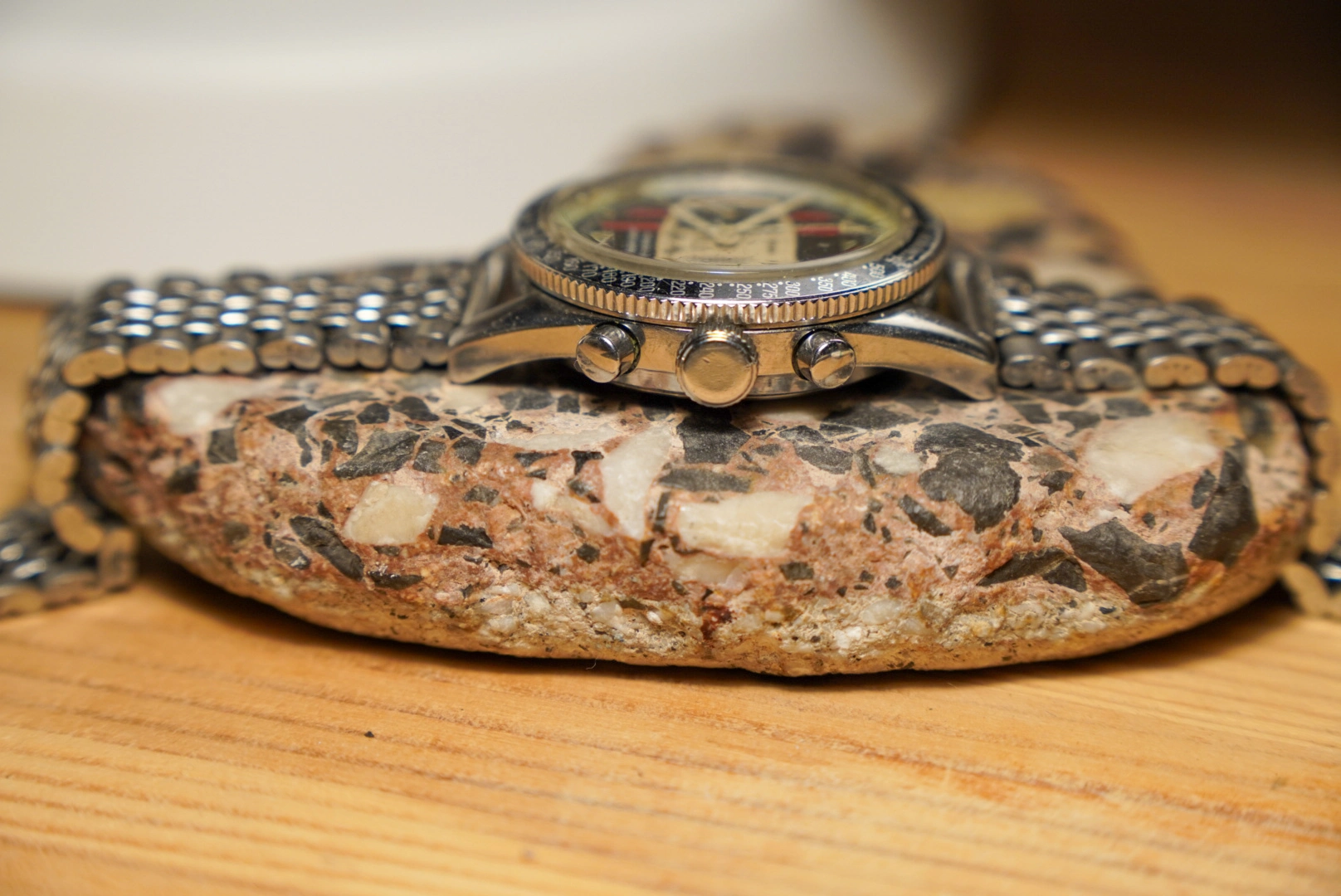 The watch can be wound up and runs without any problems. The chronograph also runs reliably, as it should. Only the minute hand on the chronograph seemed to be loose and has fallen off (it is on the side of the dial, so it just needs to be put back on).
